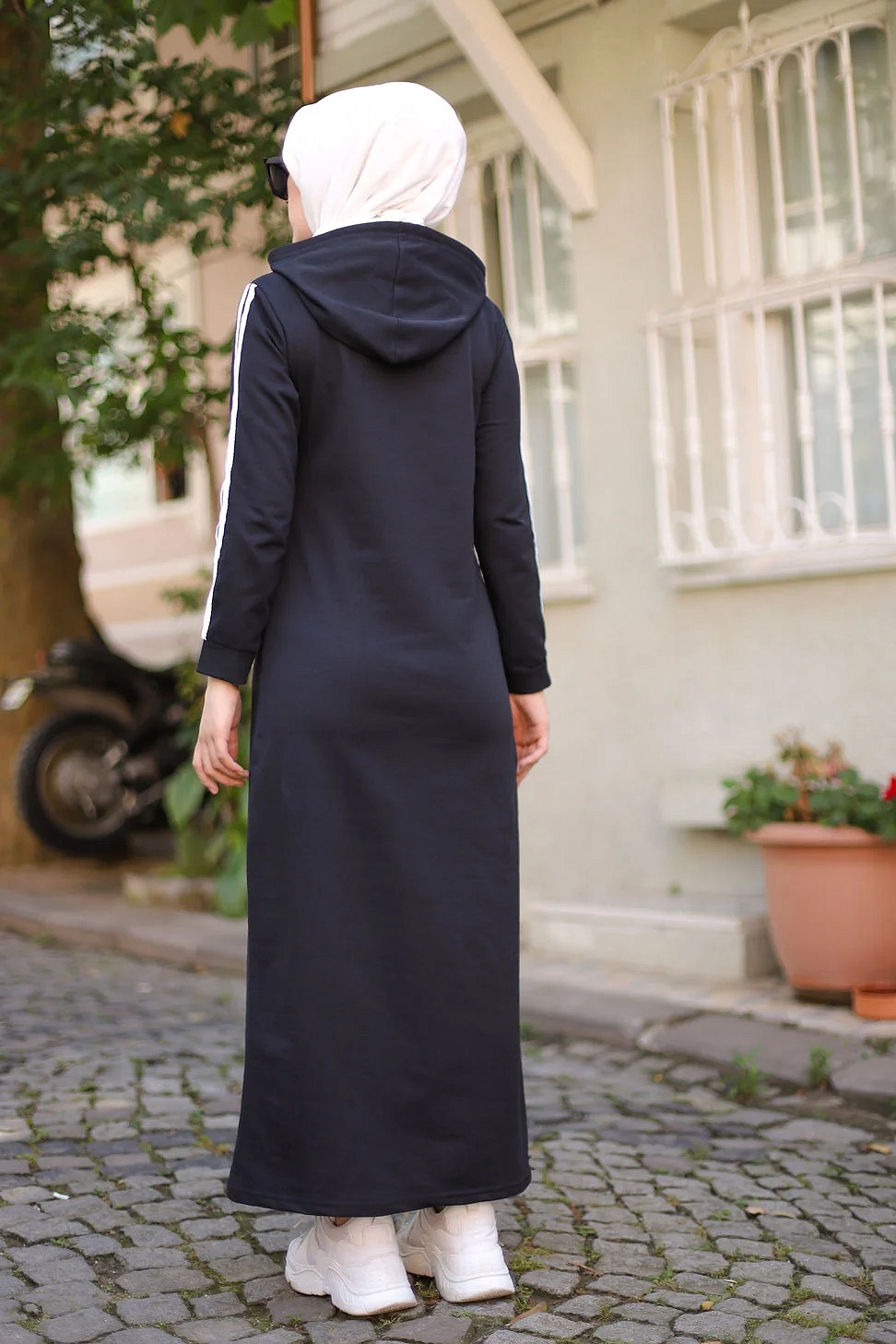 Robe décontractée à capuche de type sportwear - Vêtement Hidjab pour femme musulmane - Couleur noir, blanc et bleu indigo - REF. 32926 (29.90 €)