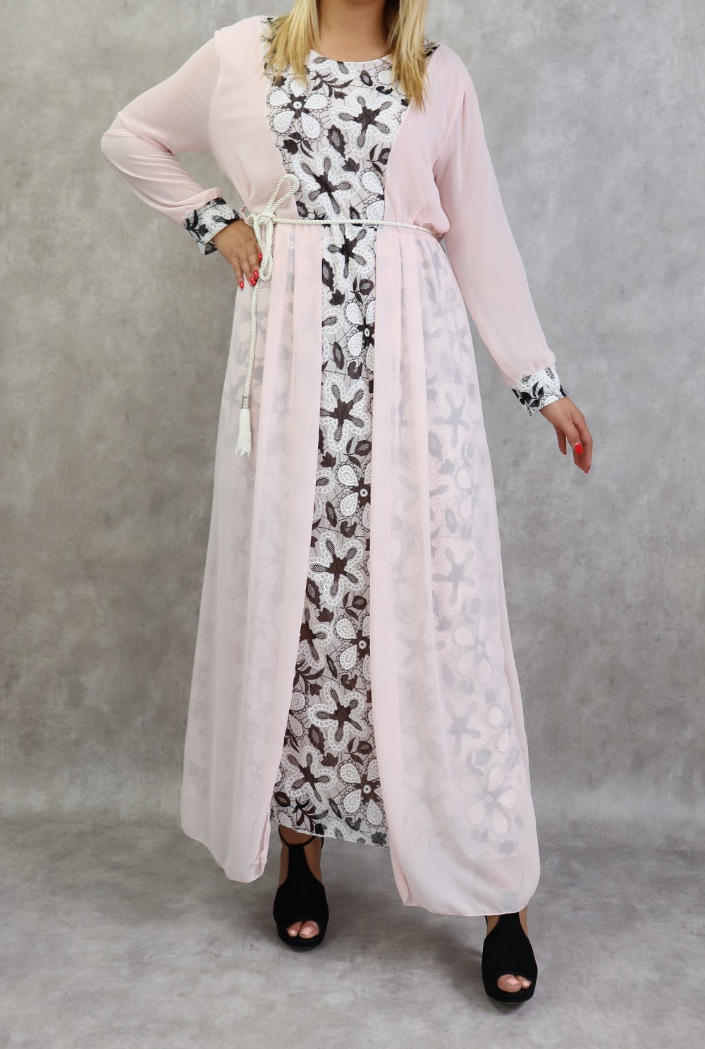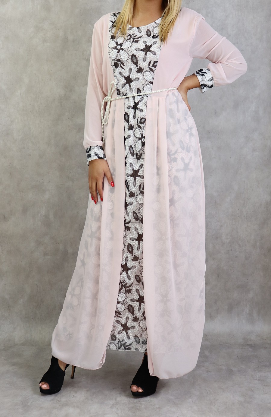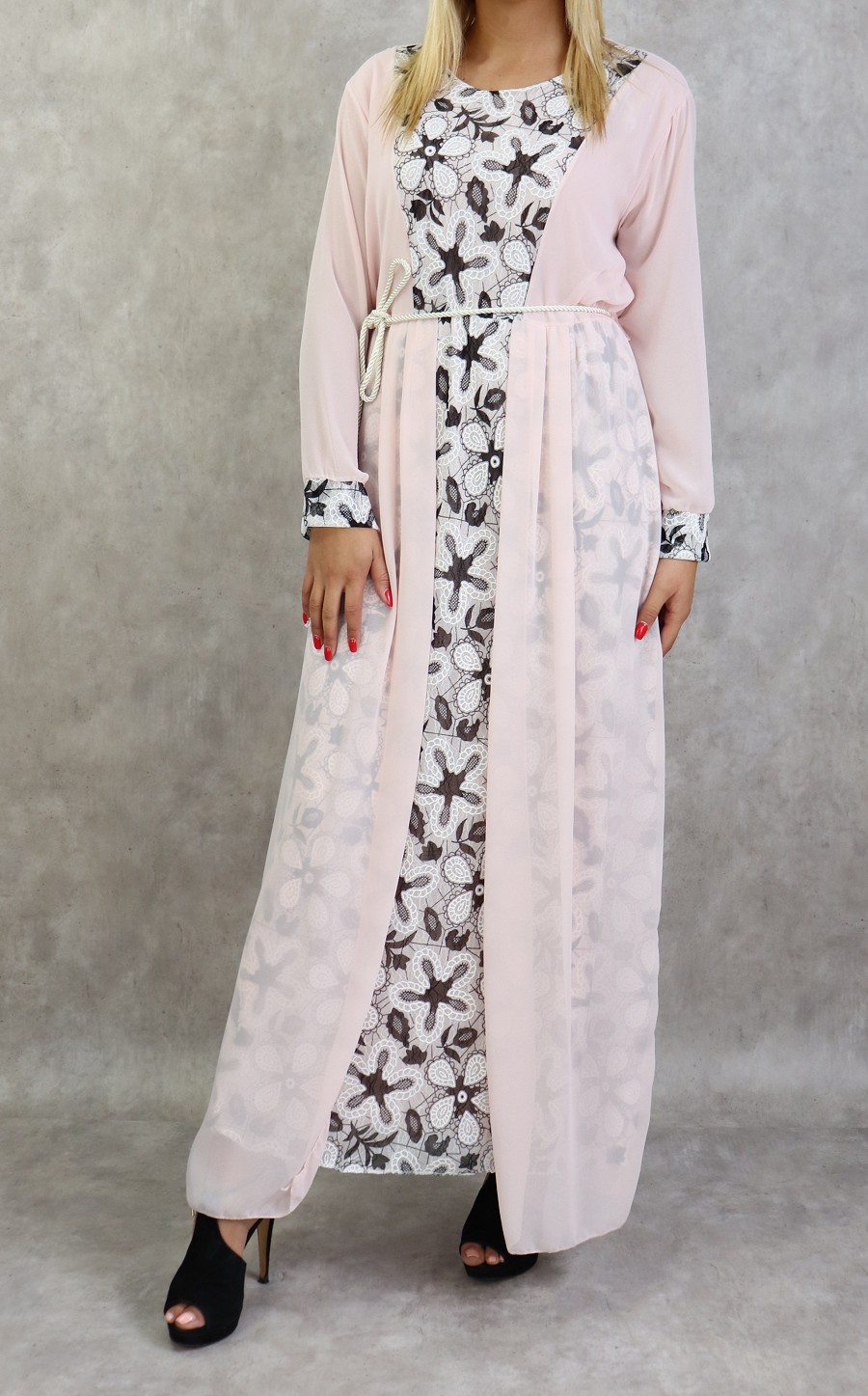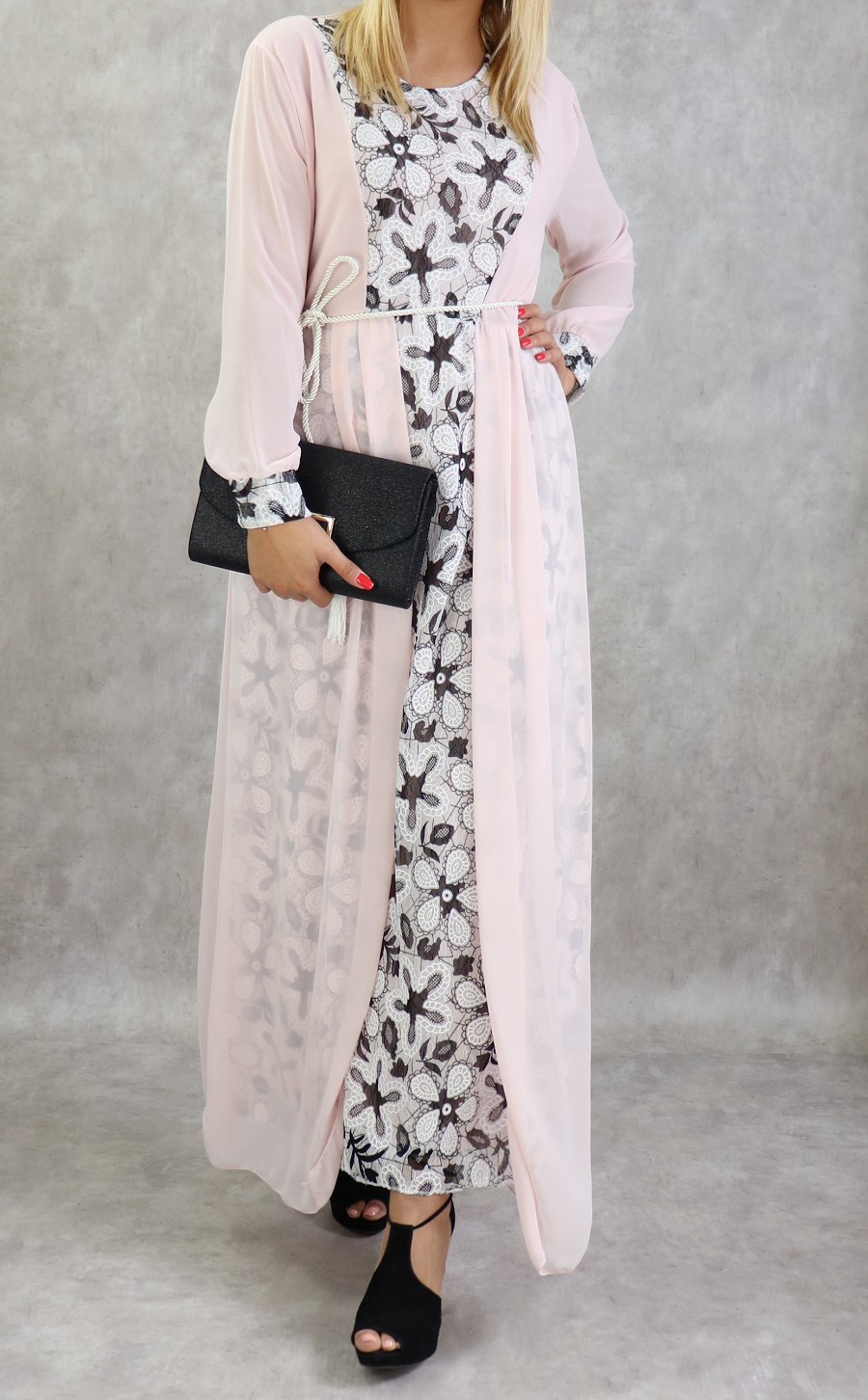 Robe longue a dentelles et mousseline de couleur rose poudre