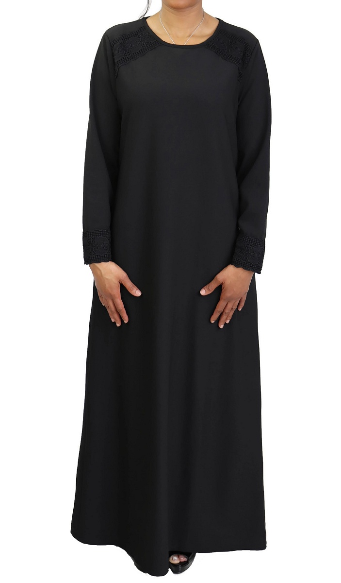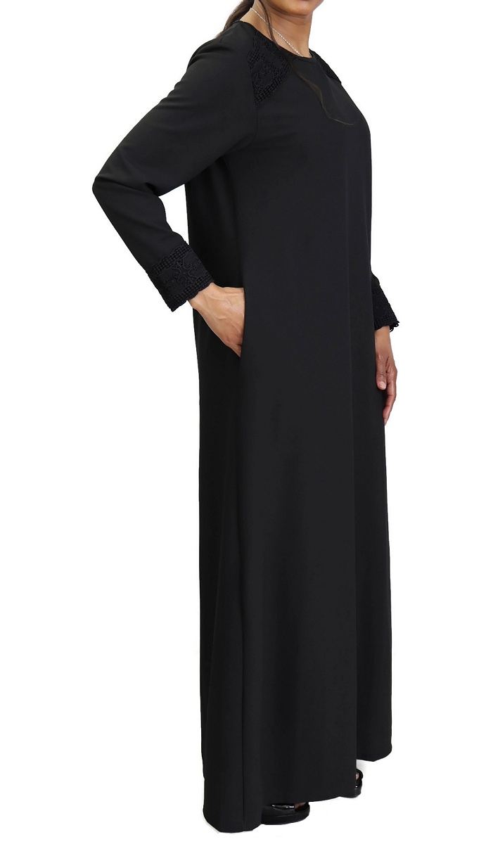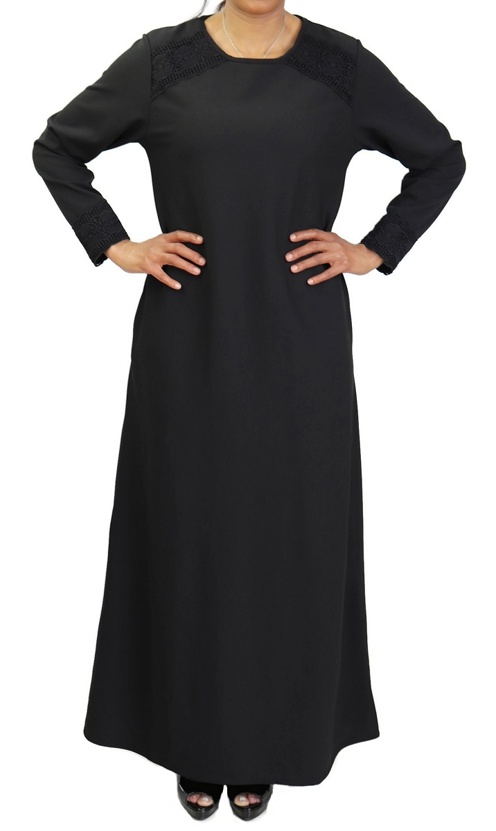 Belle robe sobre et discrète ornée de broderies sur les épaules et les poignets, col rond, poches latérales très pratiques, tissu opaque et léger.