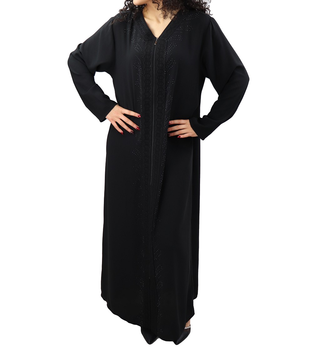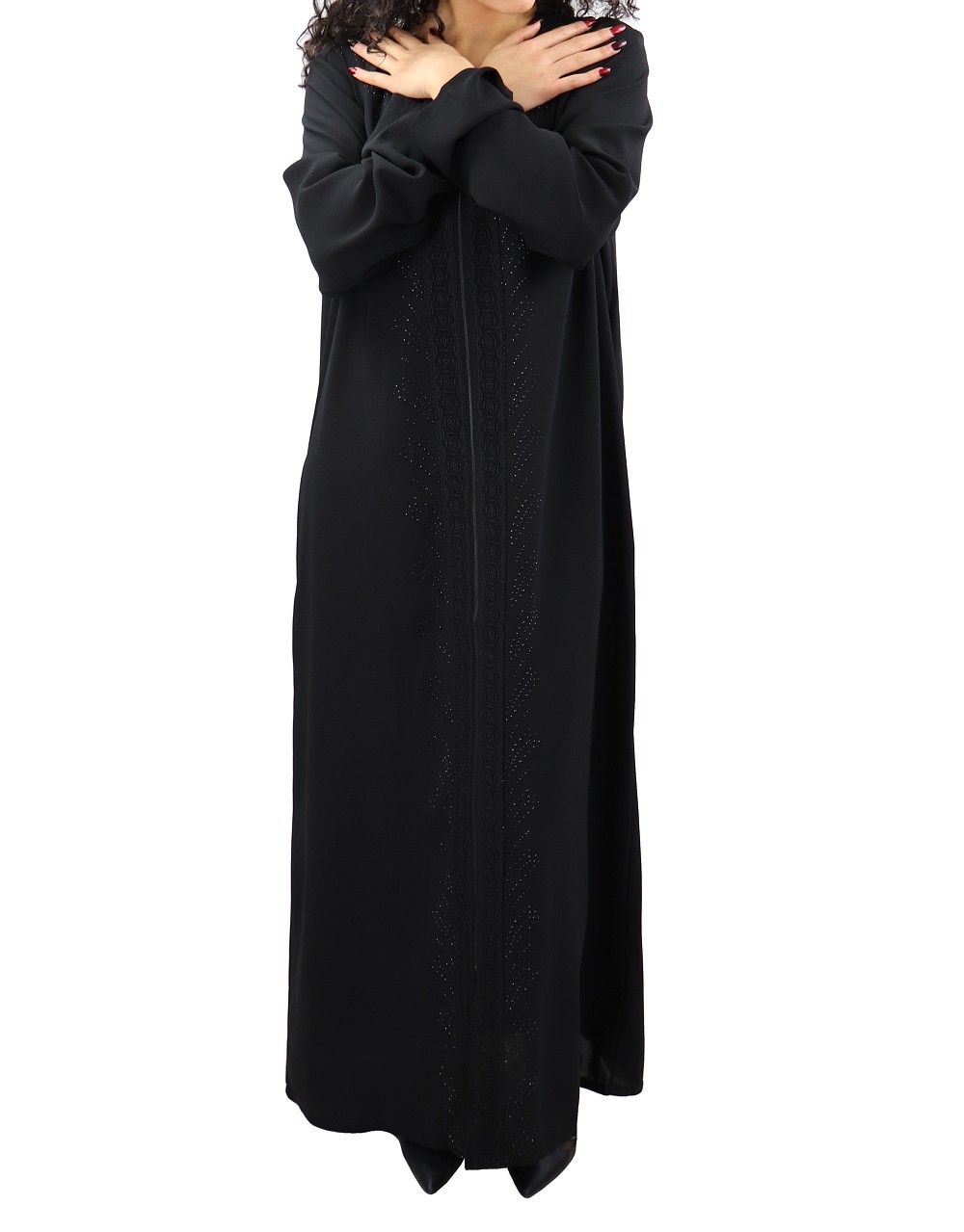 Robe abaya, fermeture éclair broderies et strass sur toute la longueur, coupe droite. Sur ce modèle sobre et élégant vous aimerez son zip qui vous permettra de le porter aussi bien ouvert que fermé.