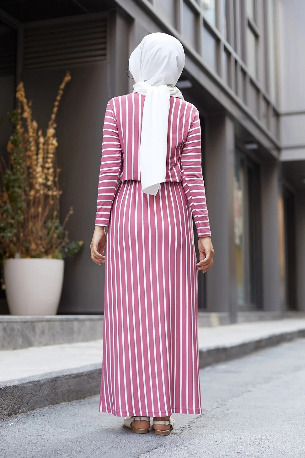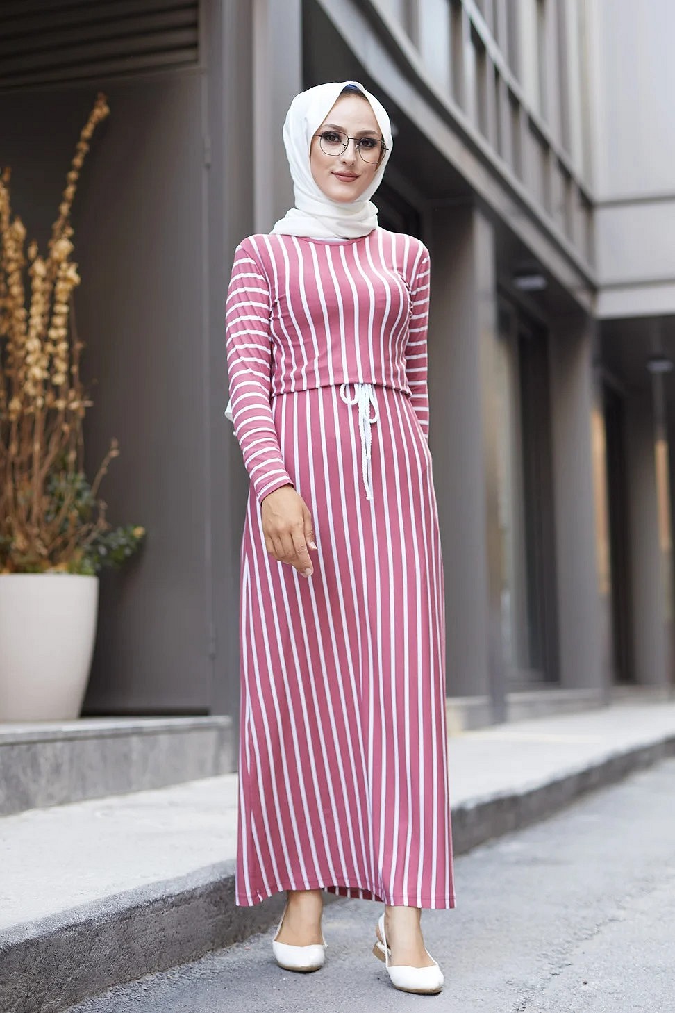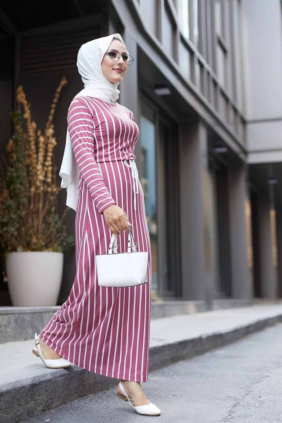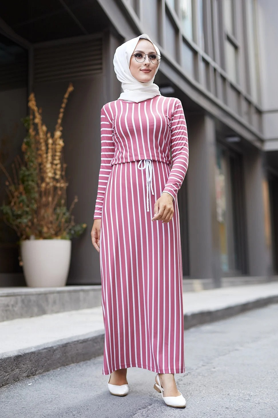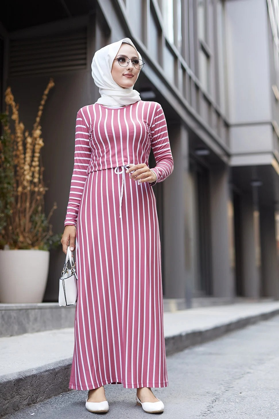 Robe longue à rayures ceinture intégrée pour femme (Vetement hijab) - Couleur framboise Vetement & Accessoire