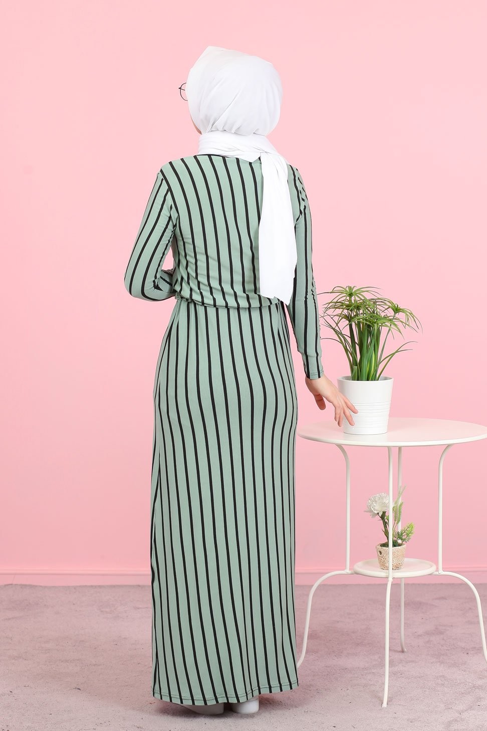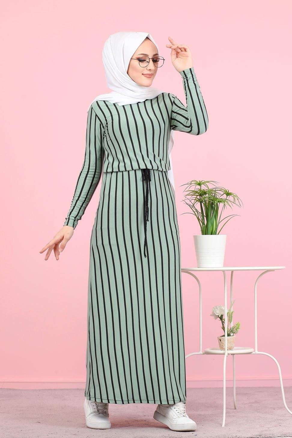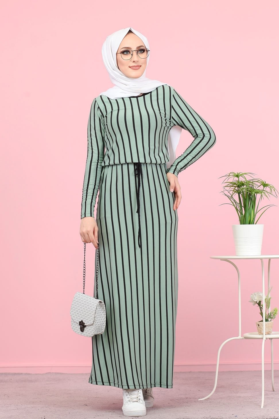 Robe longue à rayures décontractée ceinture intégrée (Boutique Vêtement Hijab) - Couleur menthe Vetement & Accessoire