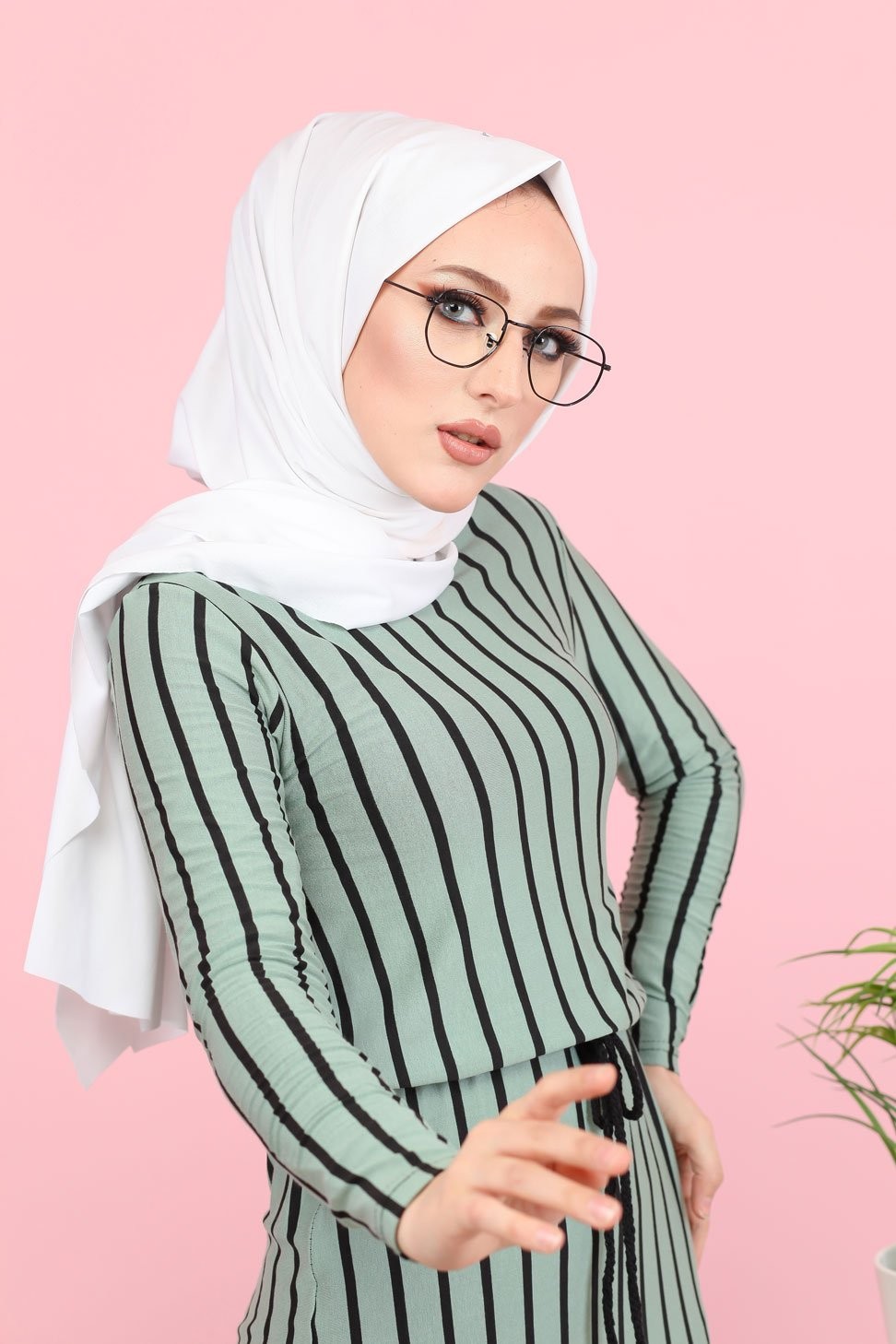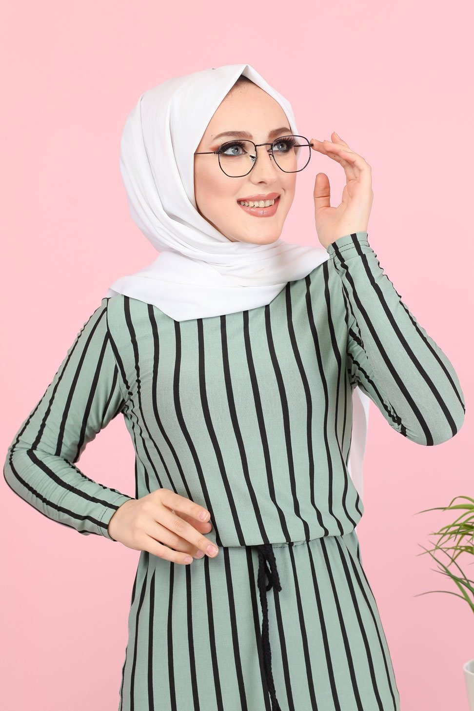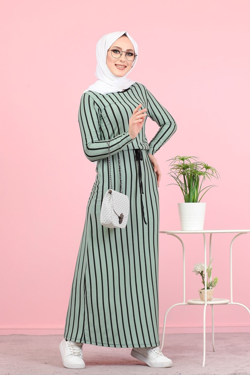 Robe longue à rayures décontractée ceinture intégrée (Boutique Vêtement Hijab) - Couleur menthe Vetement & Accessoire