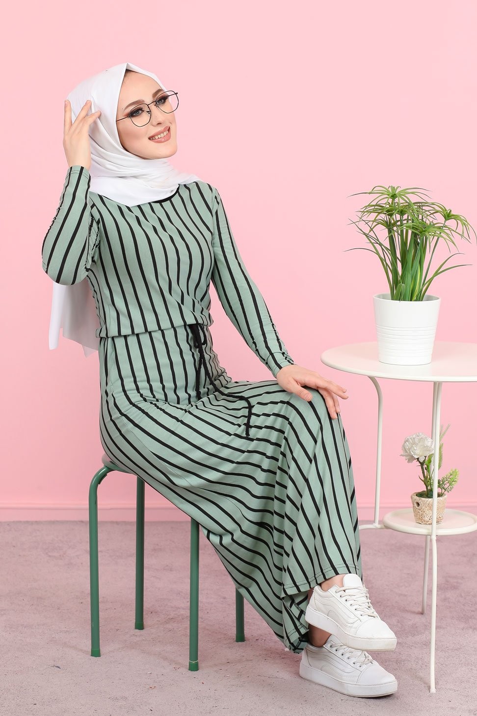 Robe longue a rayures decontractee ceinture integree (Boutique Vetement Hijab) - Couleur menthe