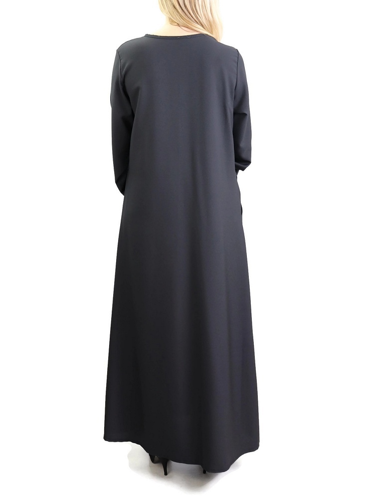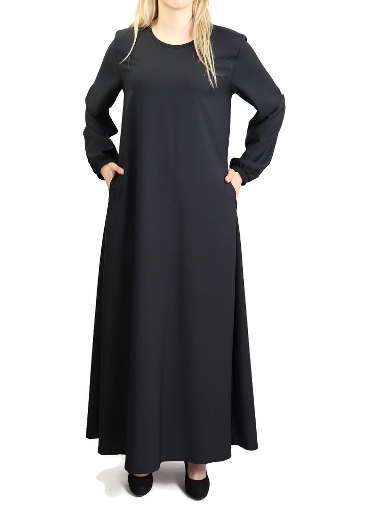 Robe évasée, avec deux poches latérales, tissu fluide et léger, légèrement élastique.