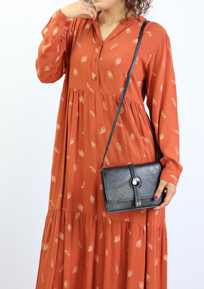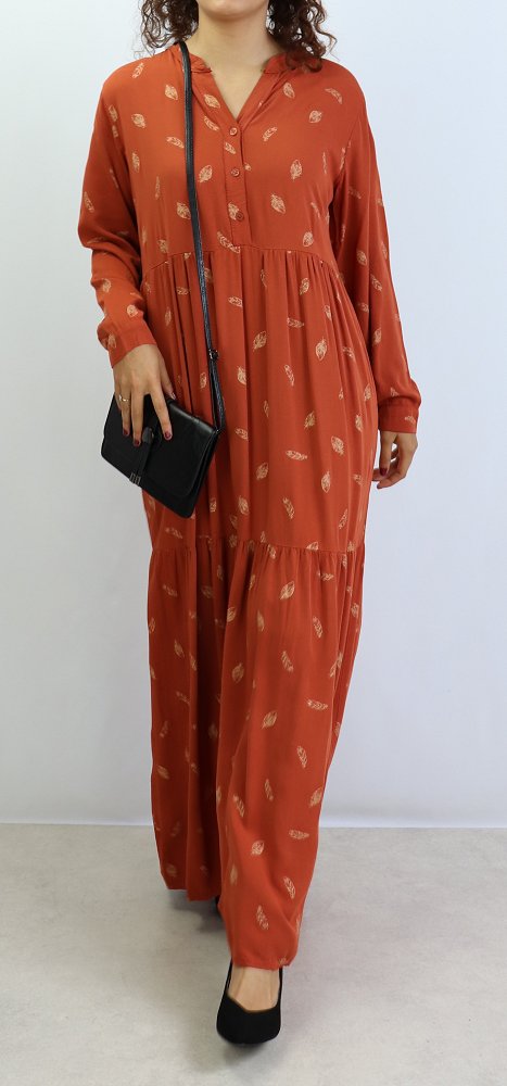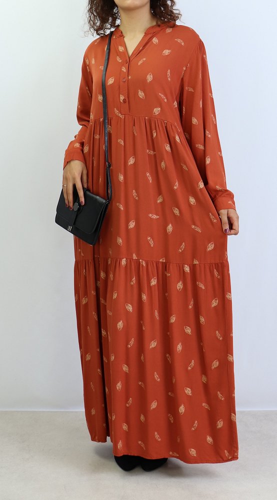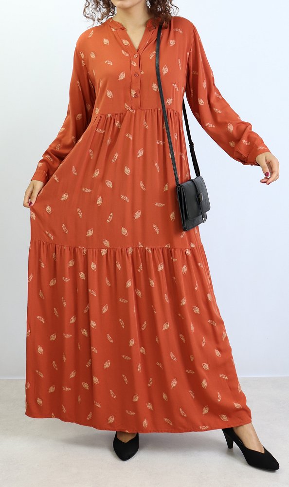 Robe tendance à motifs plume, manches longues, col Mao entre ouvert finition boutons. Coupe évasée légèrement cintrée à la taille et un effet volant à mi longueur.