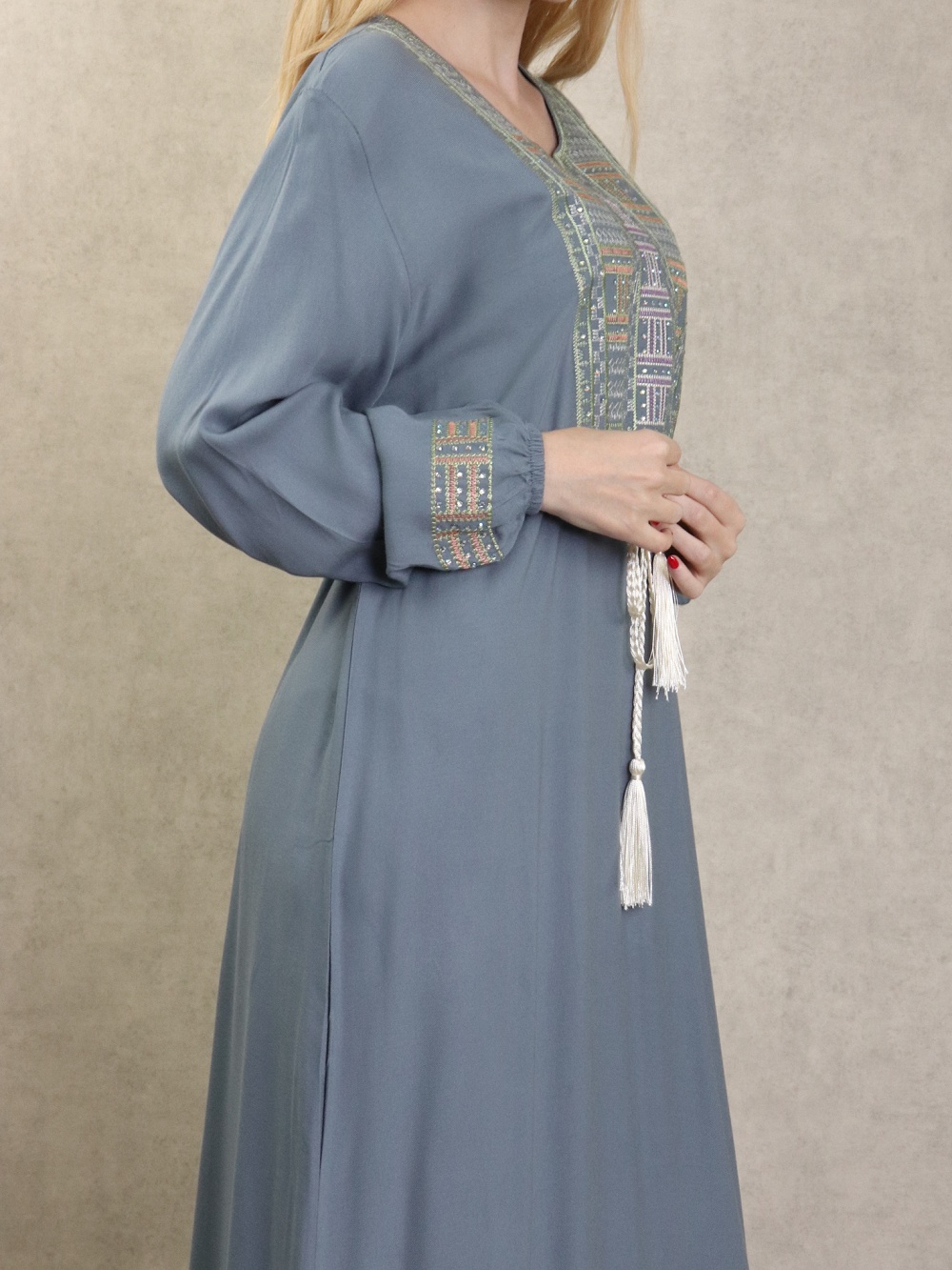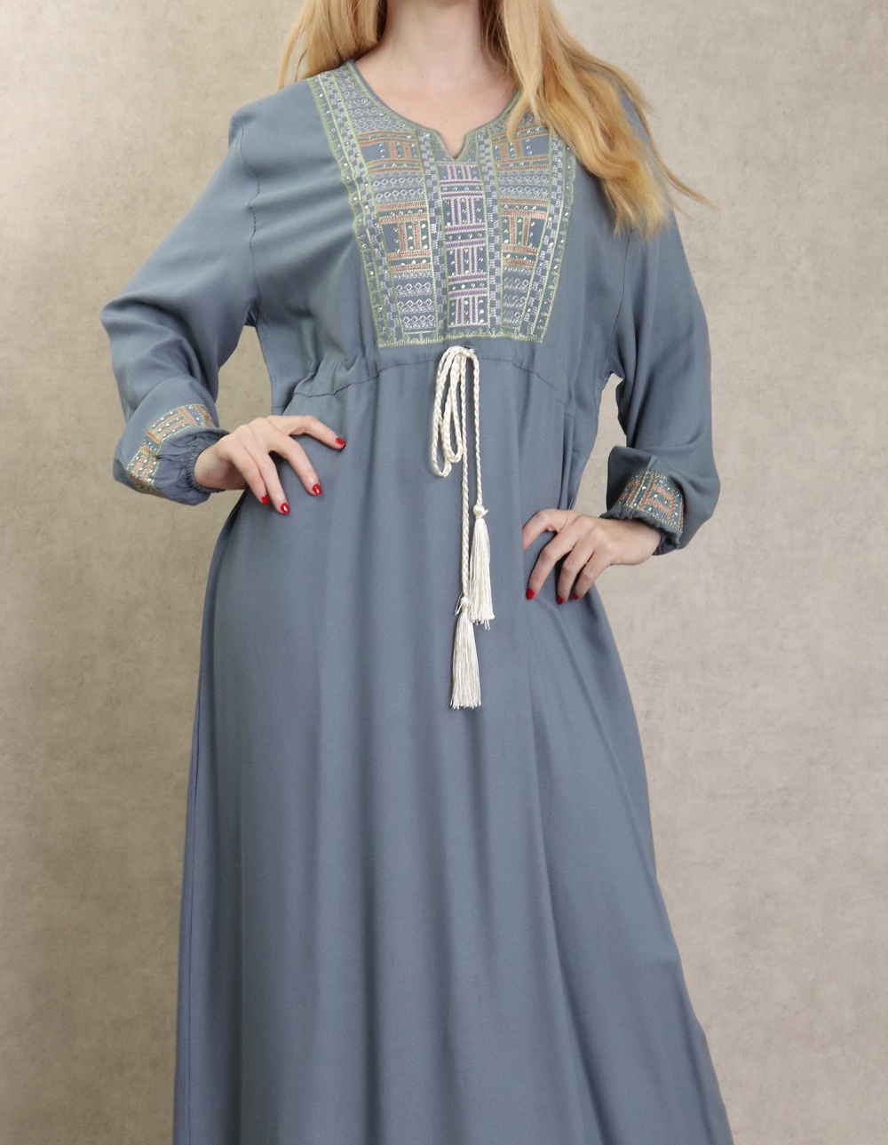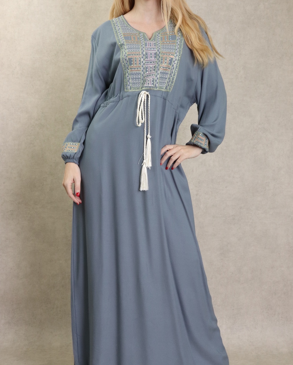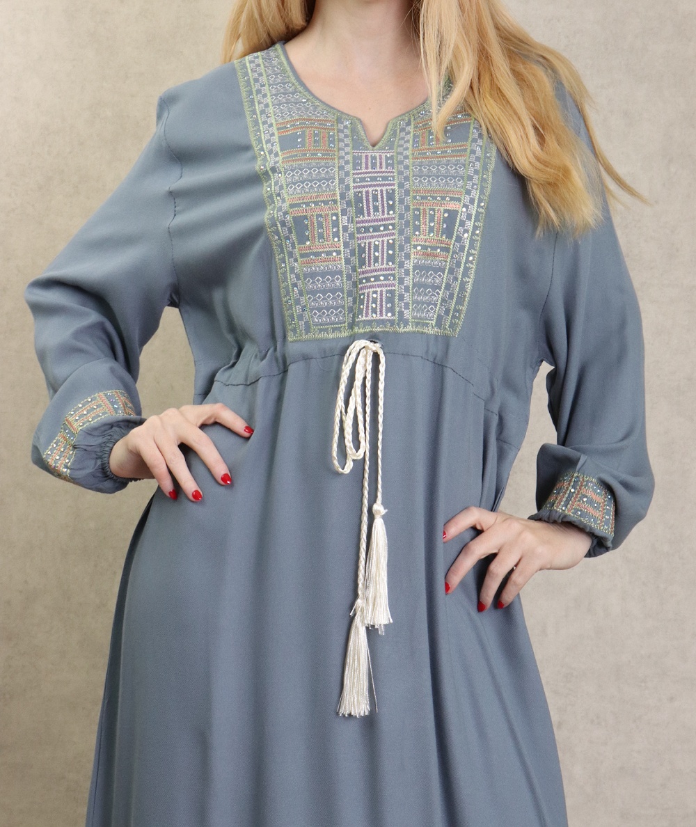 Robe orientale longue avec borderies pour femme - Couleur bleu turquoise