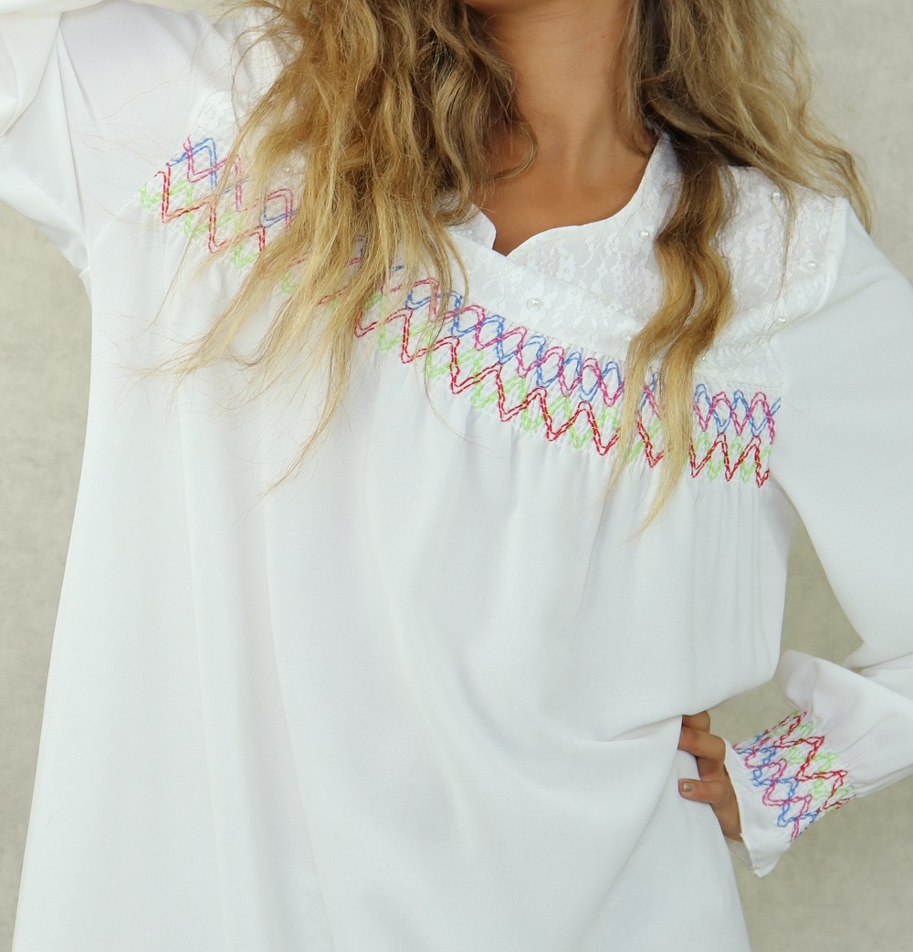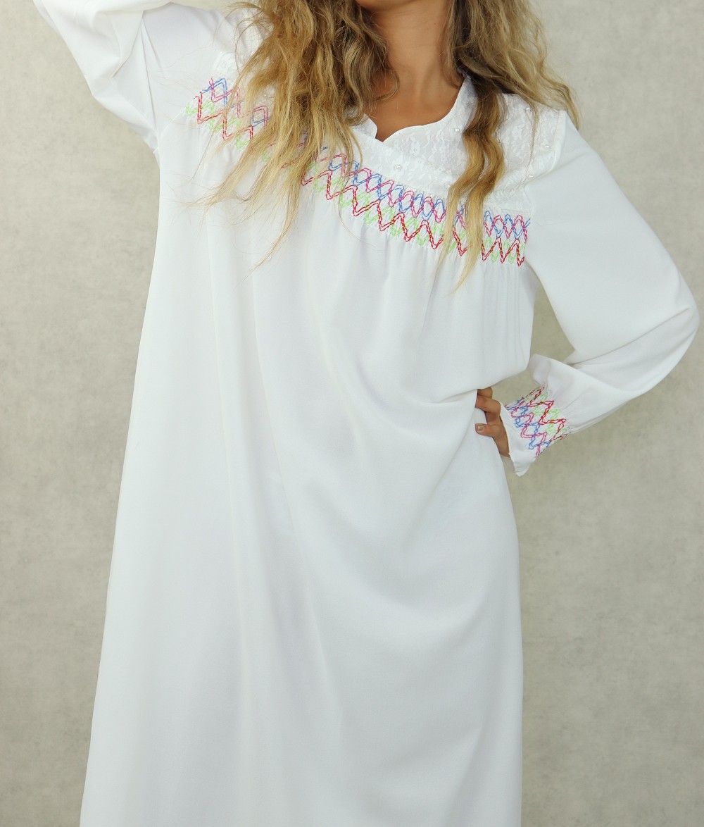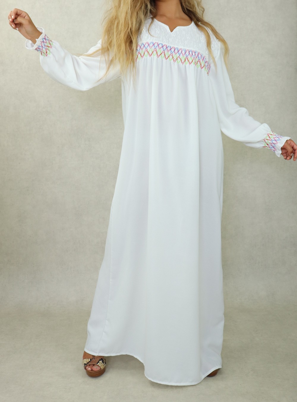 Robe longue avec broderies colorees et perles pour femme - Couleur blanc