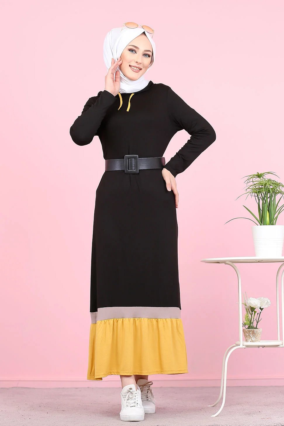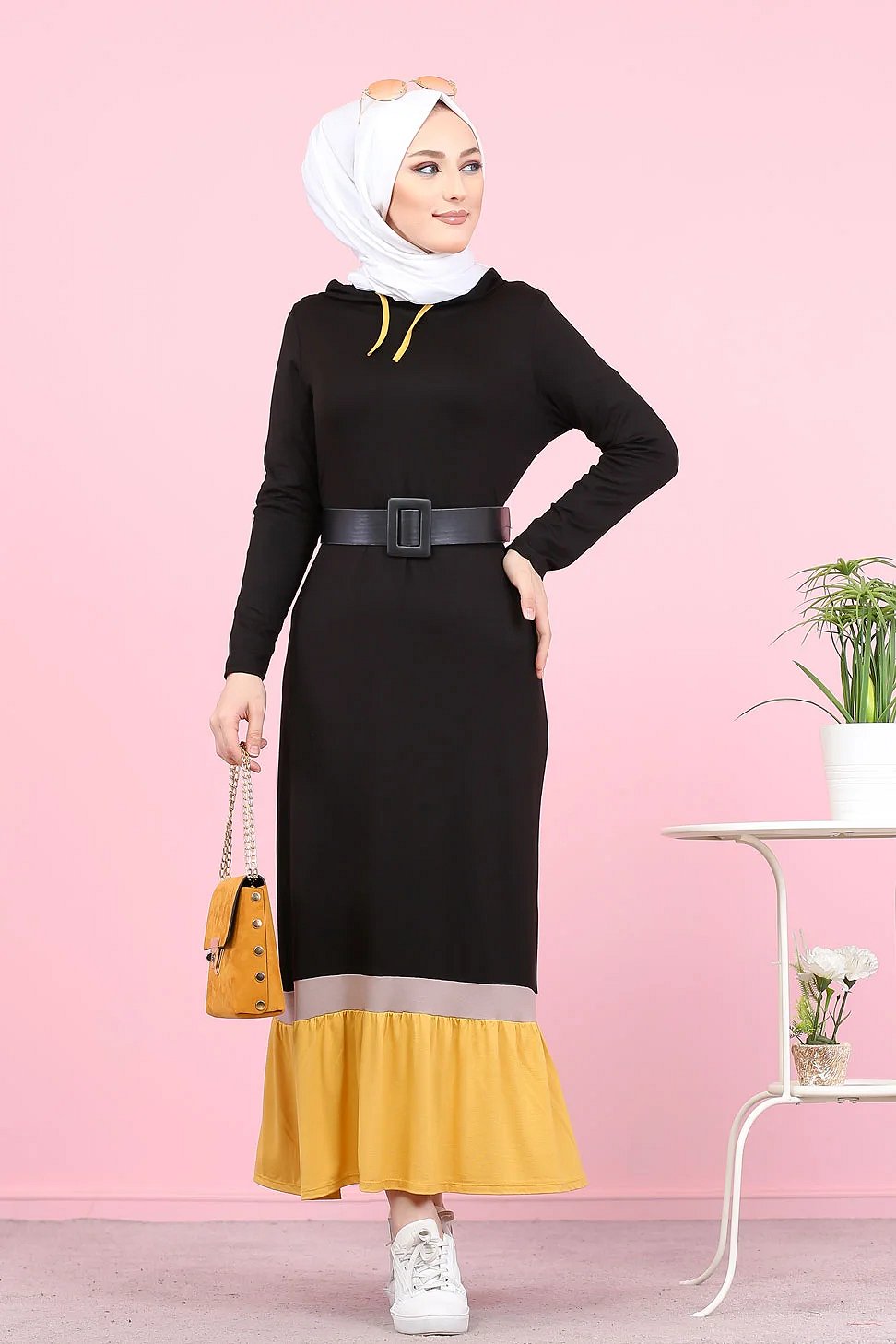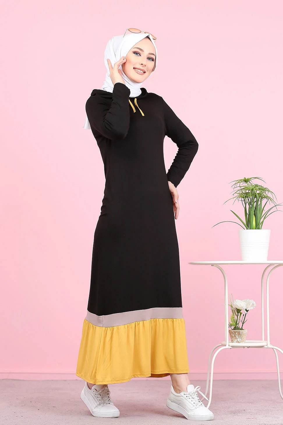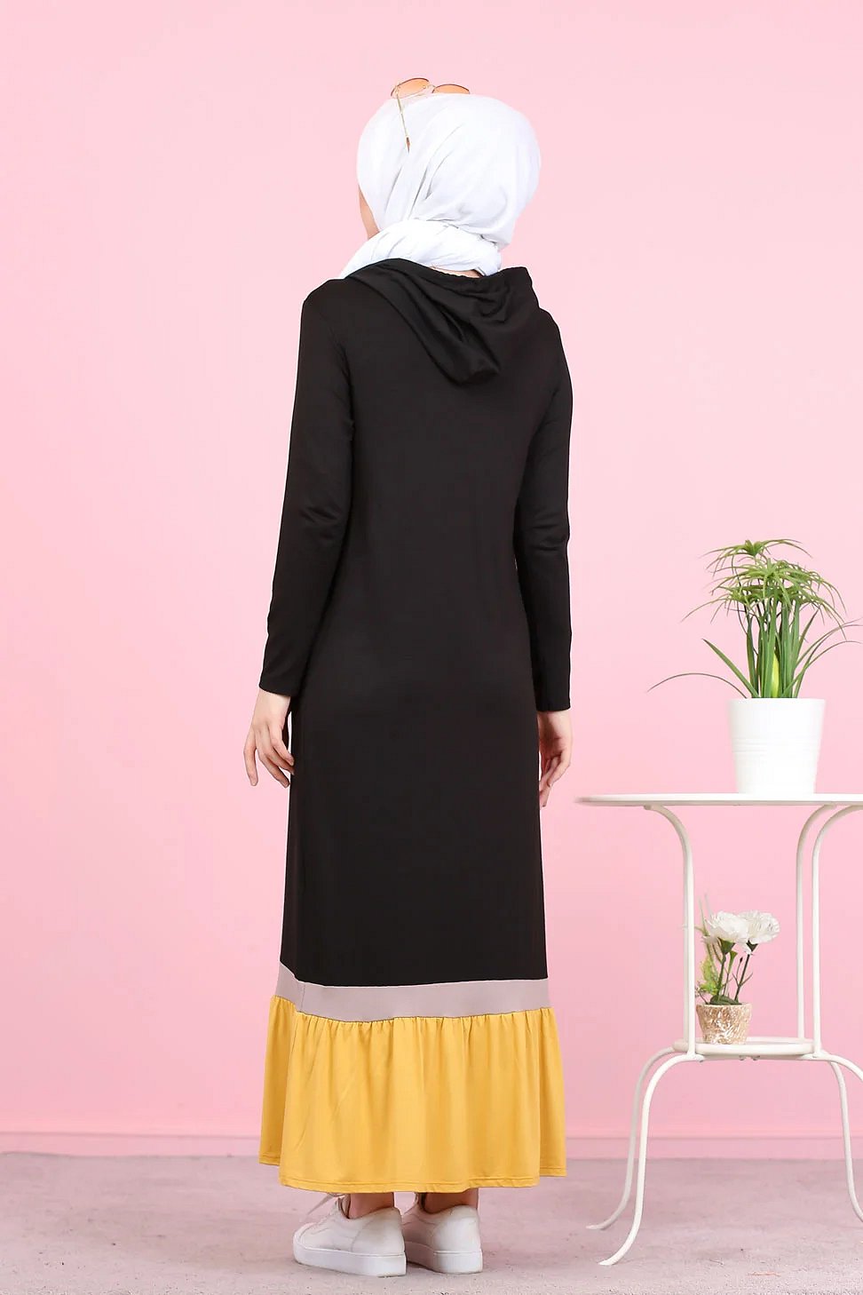 Robe longue avec capuche style Urban moderne (Vetement pour femme voilée) - Couleur noir et jaune moutarde Vetement & Accessoire