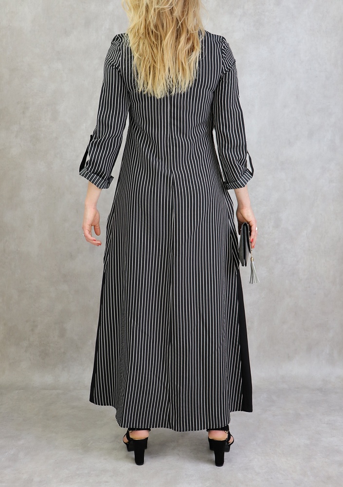 Robe longue, col rond, fermeture glissière au dos, manches ajustables, tissu opaque, effet deux pièces cousues.