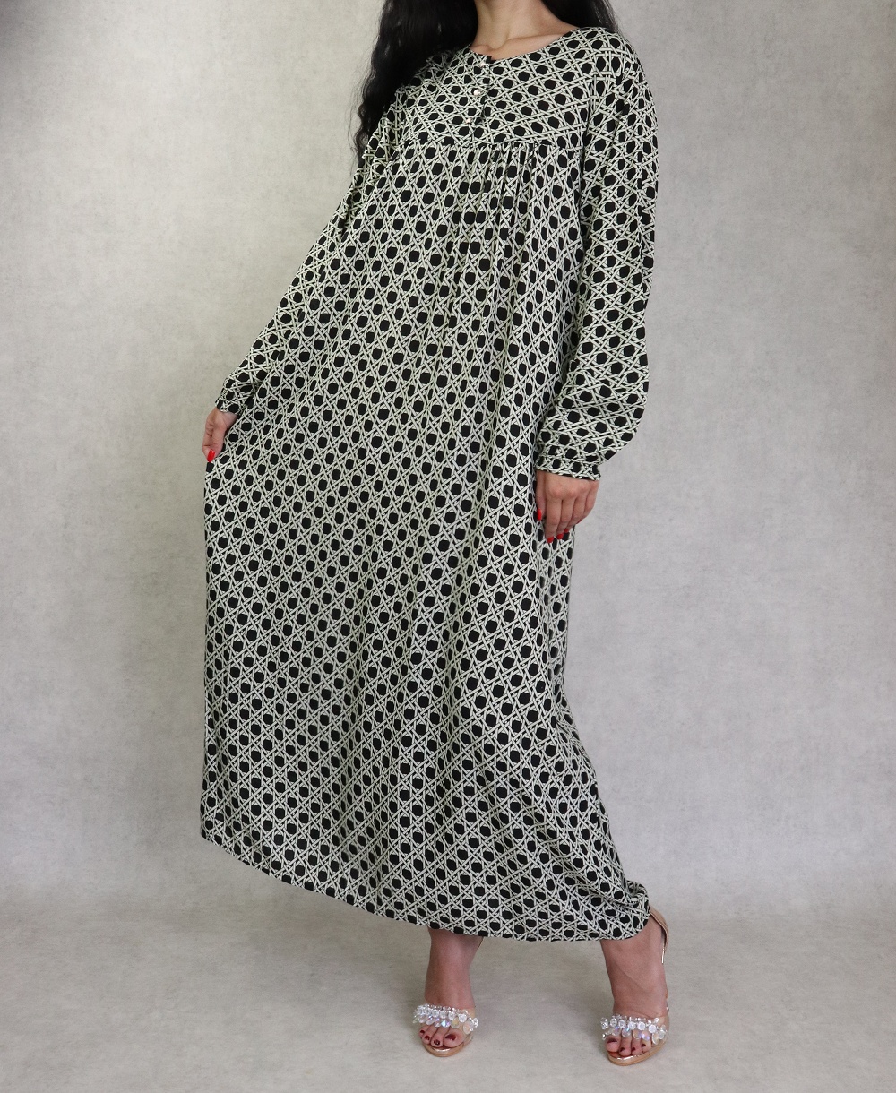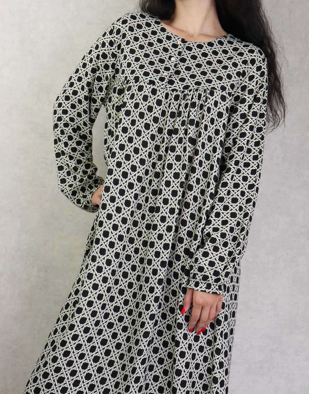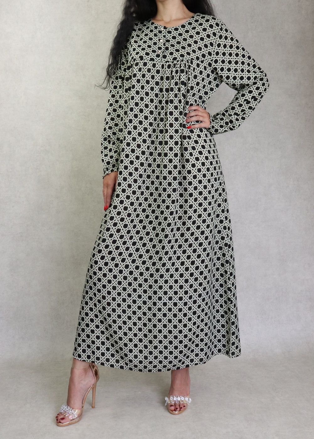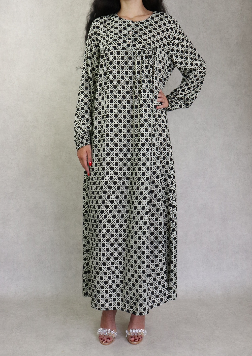 Robe longue, coupe légèrement évasée, encolure arrondie, manches longues, fermeture boutons sur le buste. Vous disposez d'un large choix de couleurs, optez donc pour la couleur que vous désirez !