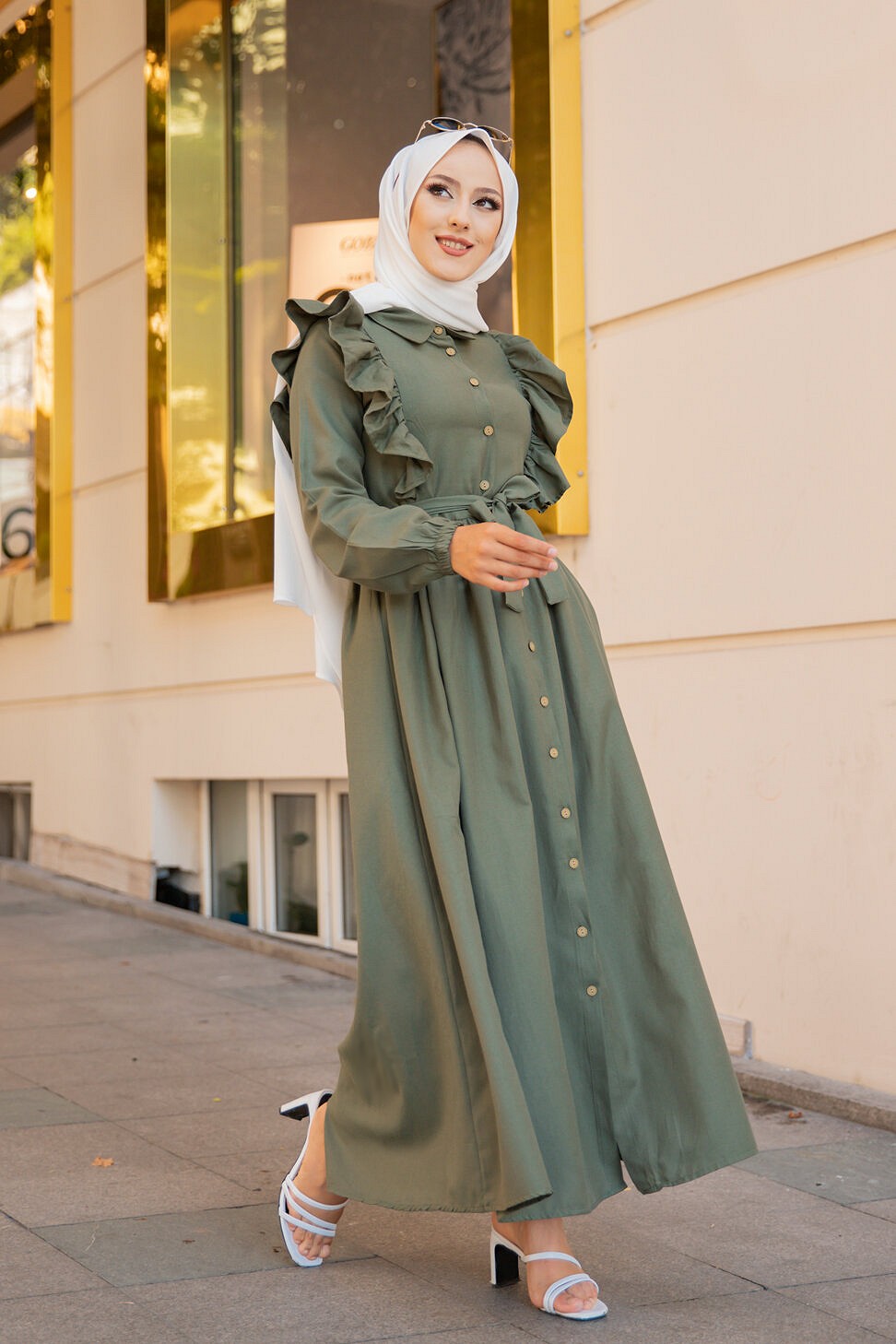 Robe longue boutonnee a froufrou (Tenue pour femme voilee) - Couleur vert Kaki