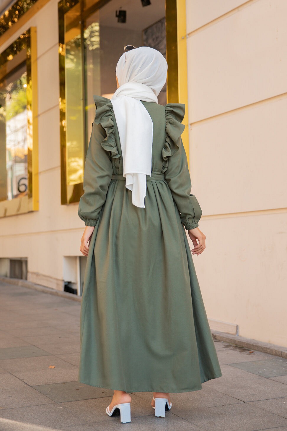 Robe longue boutonnée à froufrou (Tenue pour femme voilée) - Couleur vert Kaki Vetement & Accessoire