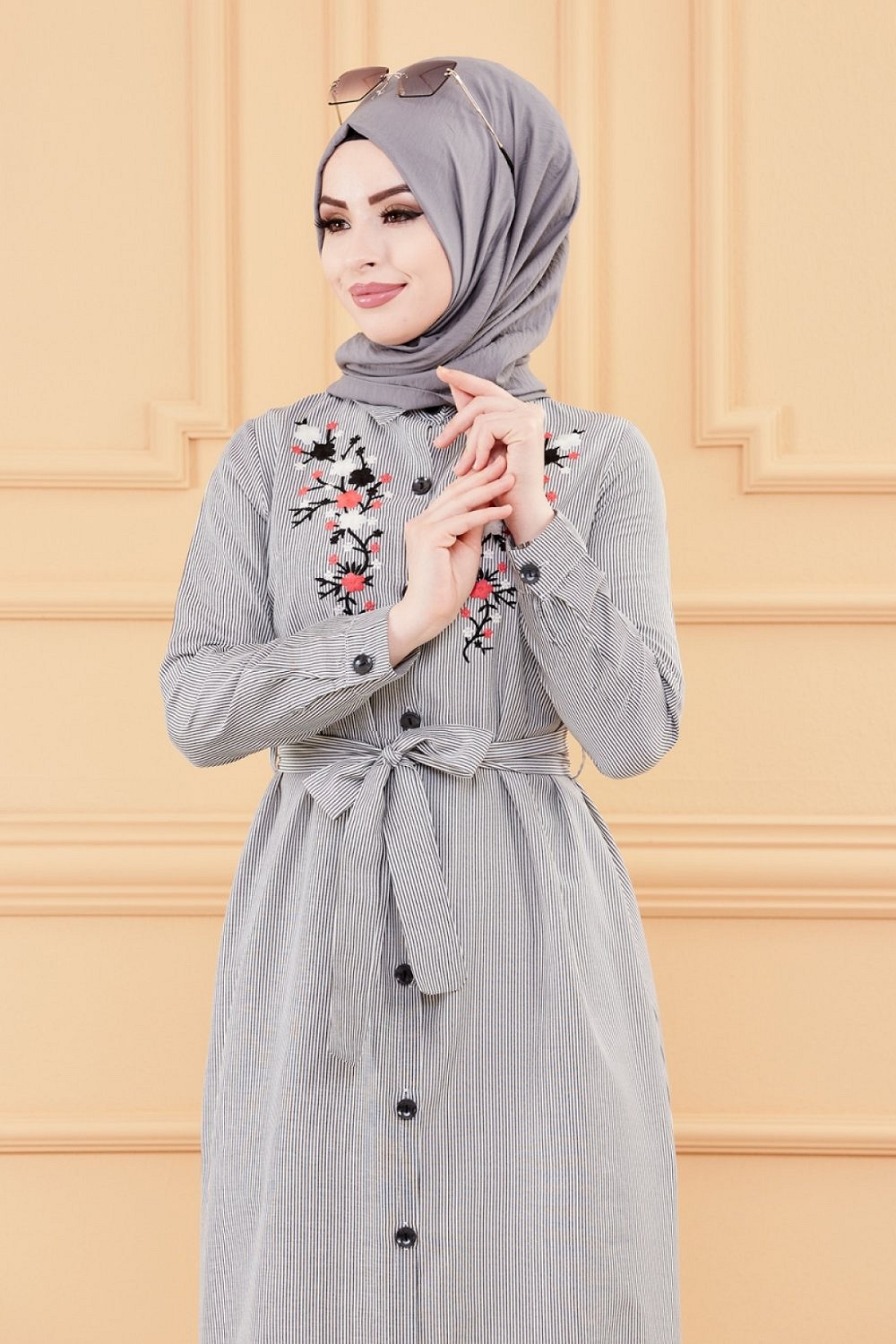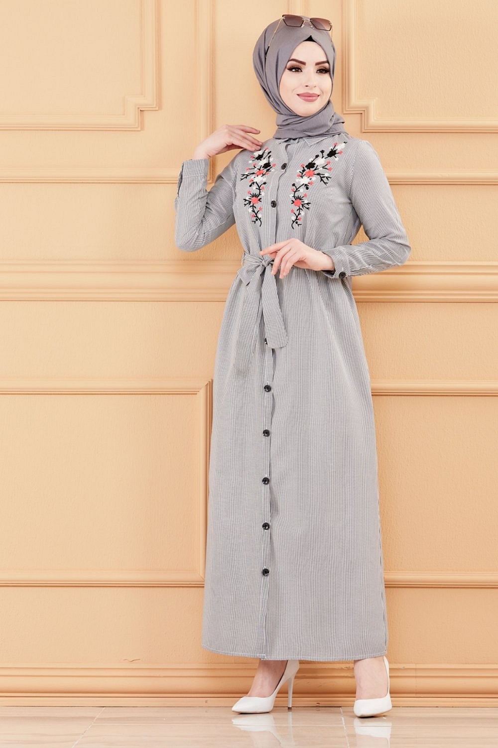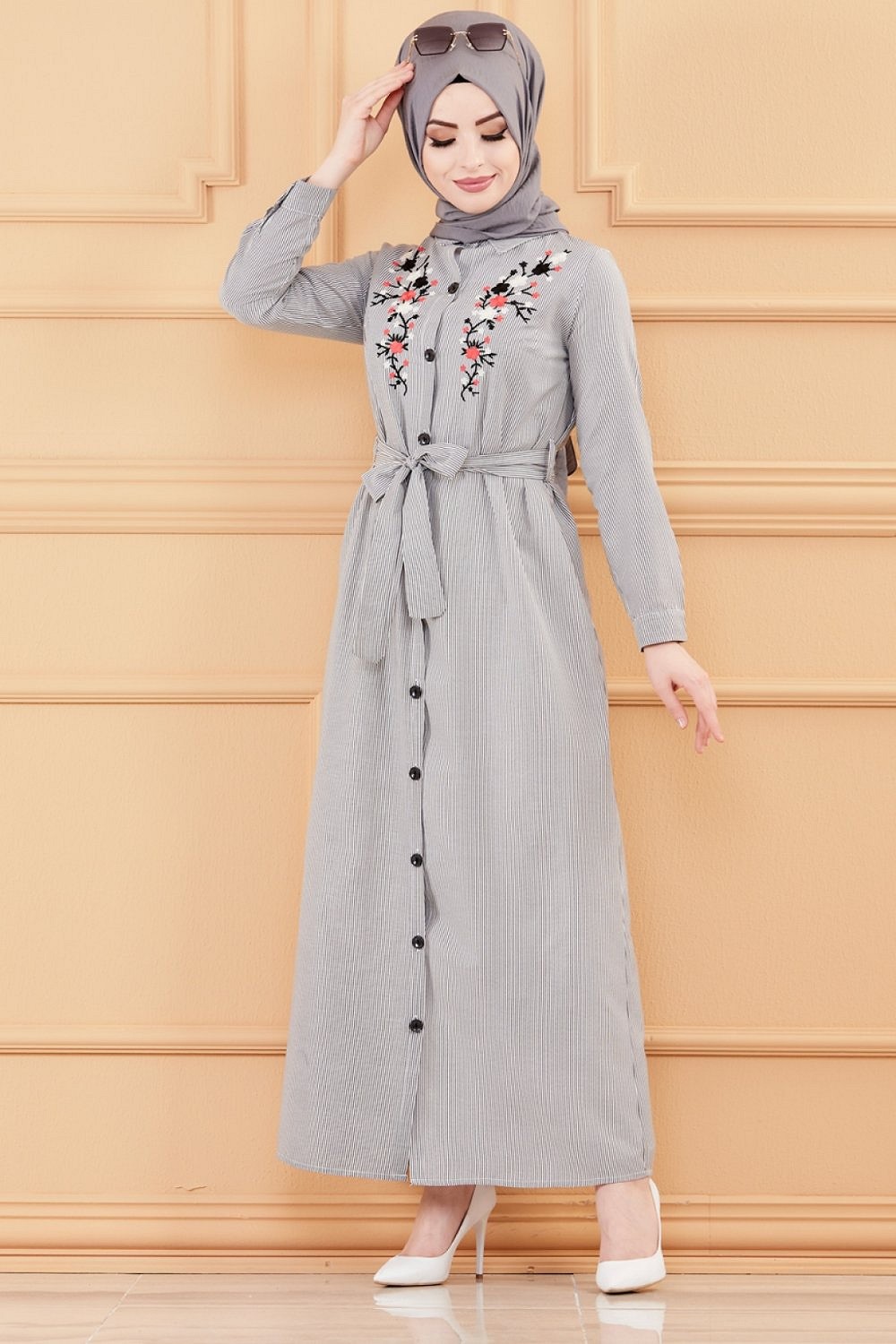 Robe longue boutonnée avec broderie et ceinture (Vêtement Hijab & Modest Fashion pour femme) - Rayures couleur noir Vetement & Accessoire