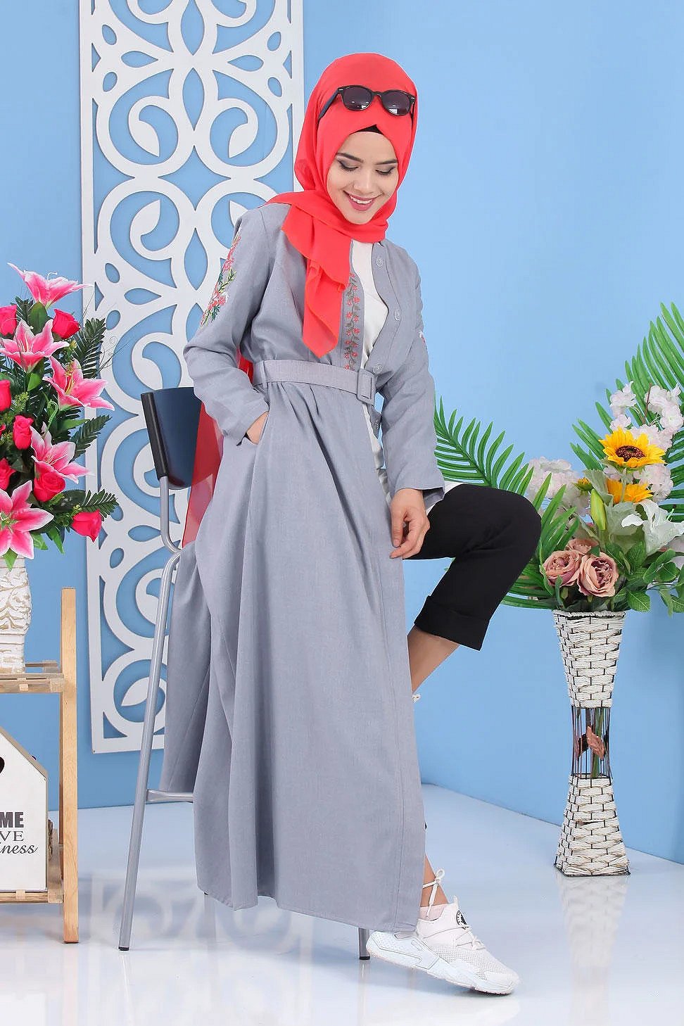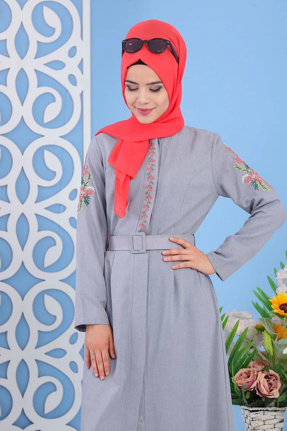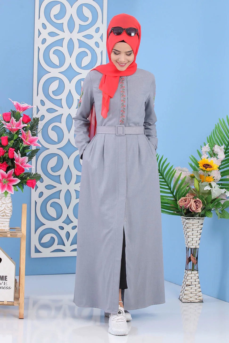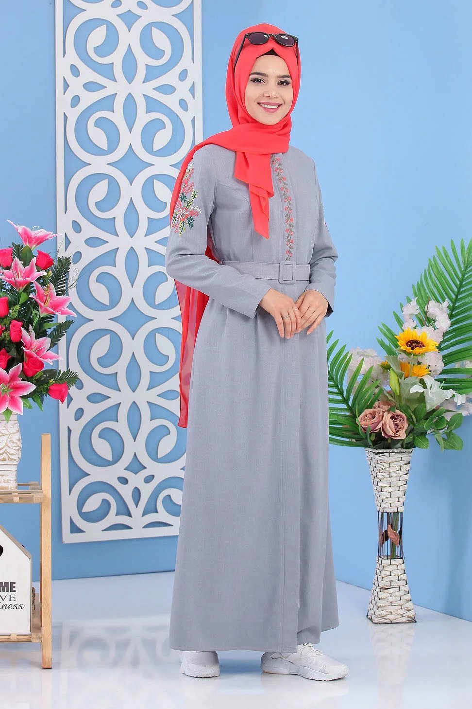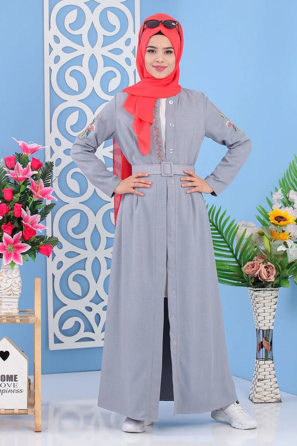 Robe longue boutonnée avec ceinture et broderies - Couleur gris (Vêtements islamiques pour femmes musulmanes voilées) Vetement & Accessoire