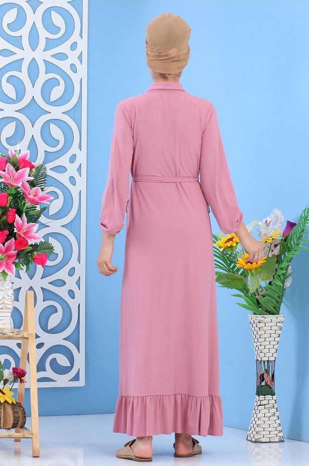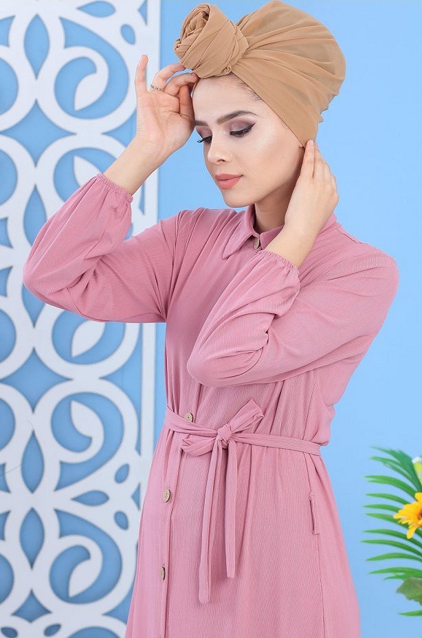 Robe longue, col arrondi, manches finition élastiques aux poignets, taille cintrée, ceinture à passants, fermeture boutons sur toute la longueur, effet volant sur la partie basse, tissu effet strié.