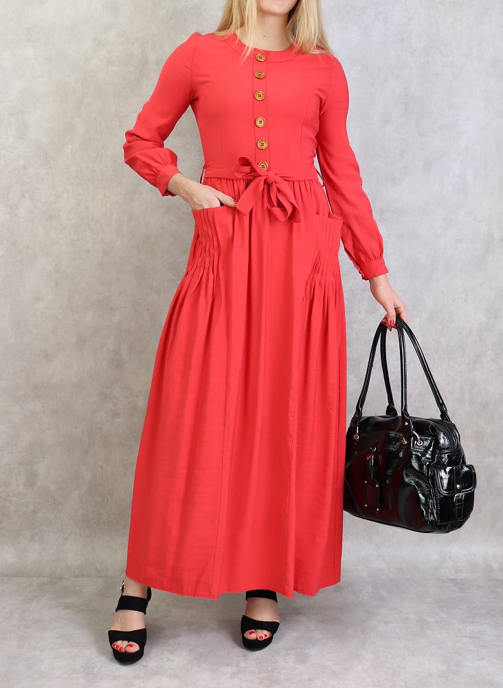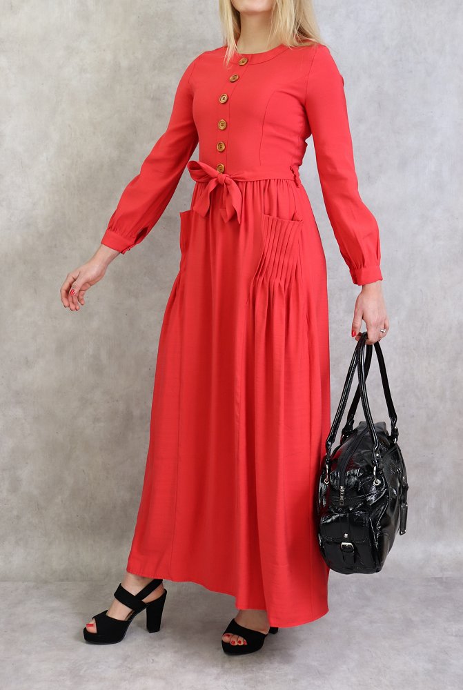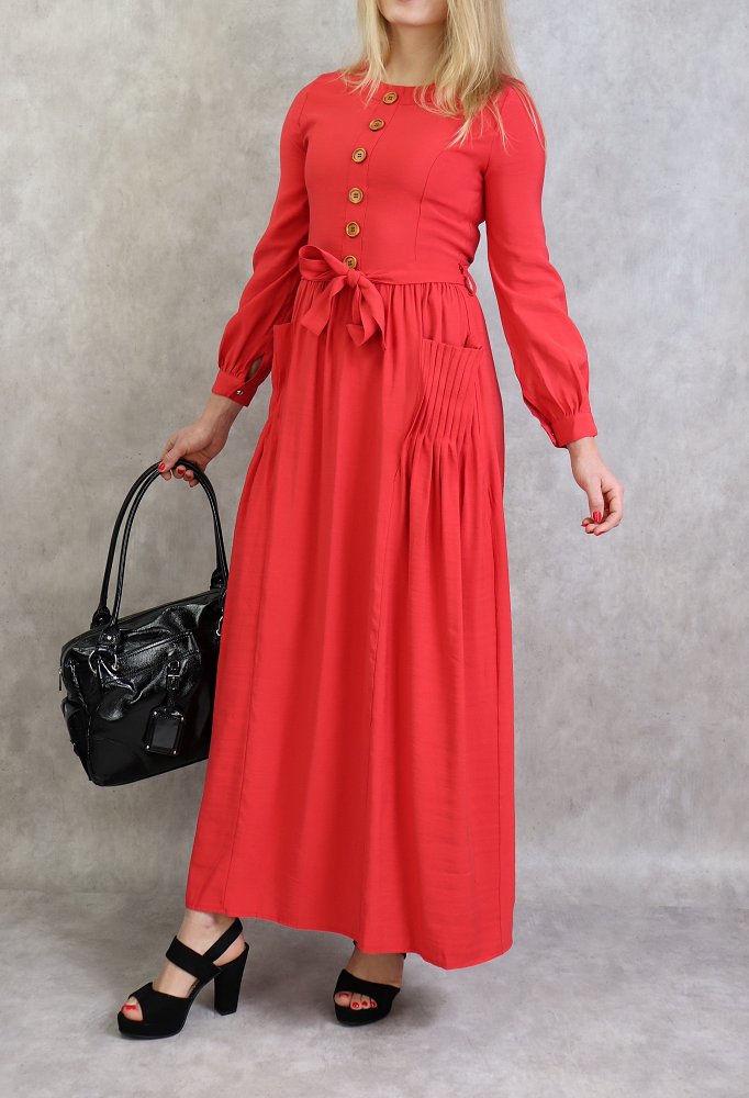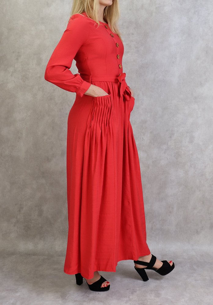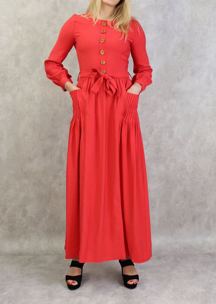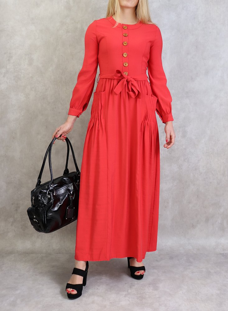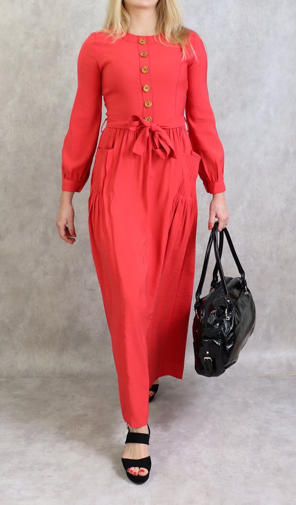 Robe longue, col rond, fermeture à glissière au dos, décoration boutons sur le buste, manches longues finition boutons aux poignets, taille cintrée, ceinture assortie à passants. Deux poches plaquées avec quelques plis. Coupe légèrement évasée, tissu opaque et léger.