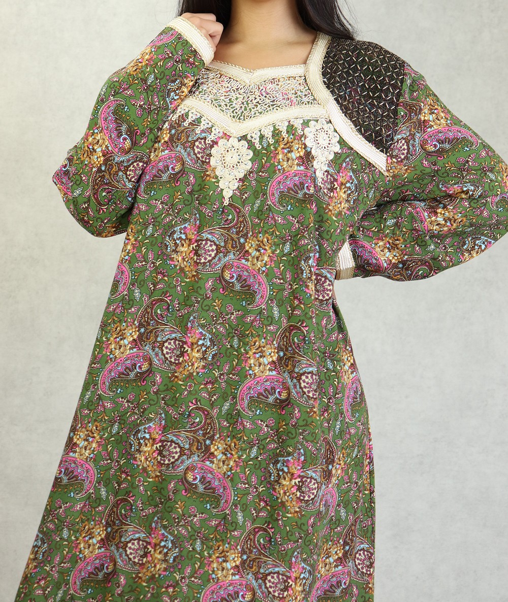 Robe longue brodee a motif cachemire pour femme - Couleur Vert kaki