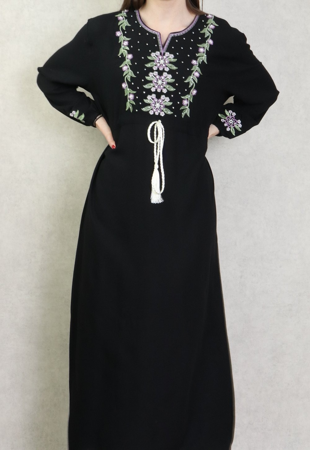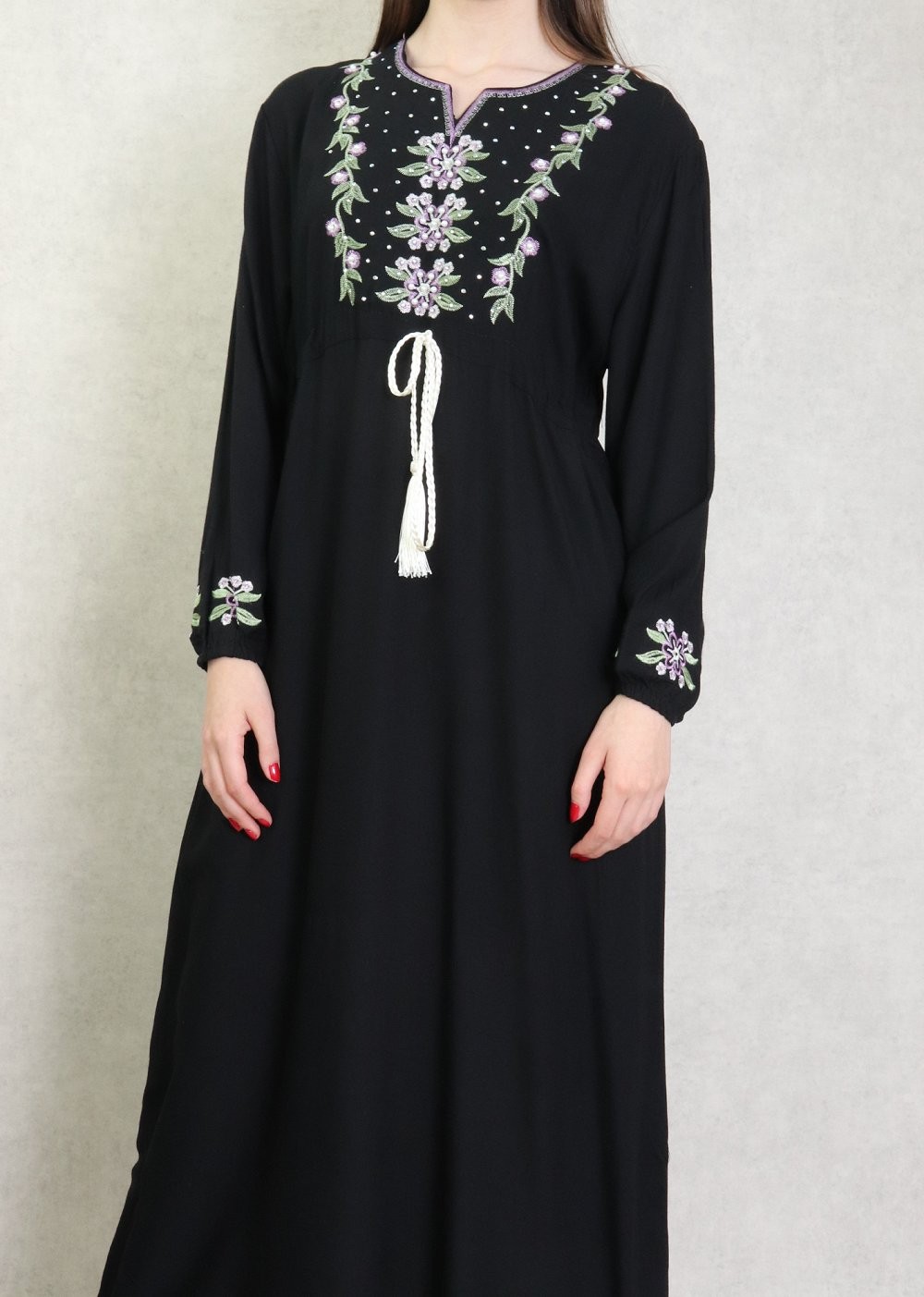 Robe longue brodée avec un lien à la taille pour femme - Couleur Noir Vetement & Accessoire