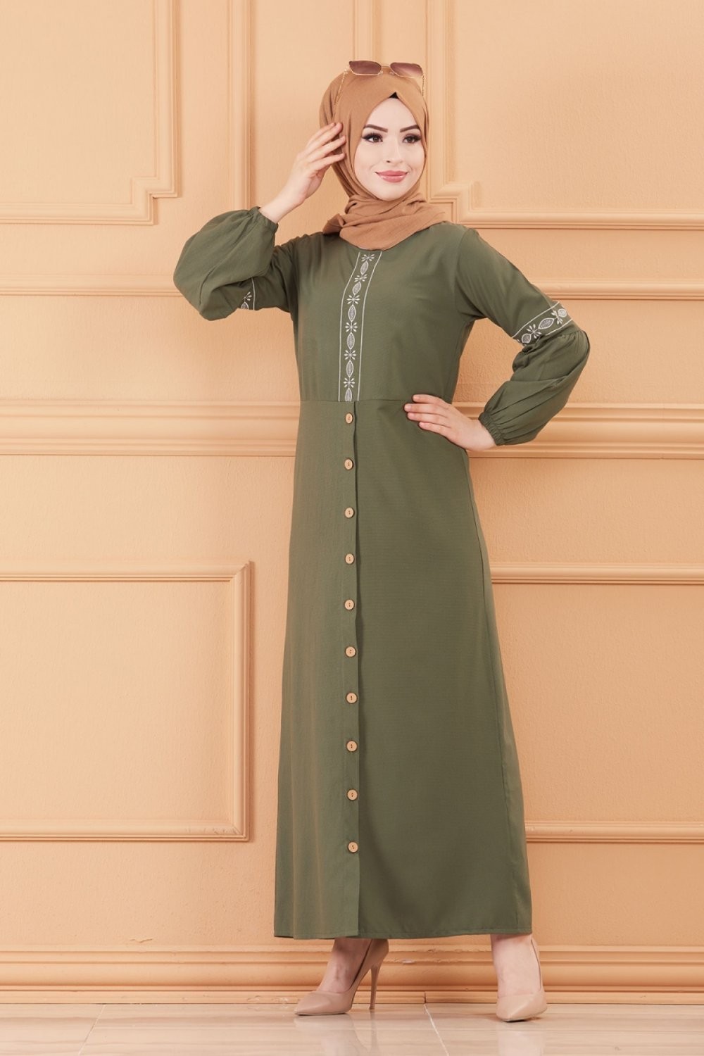 Robe longue brodee pour femme musulmane (Tenue Hijab classique) - Couleur kaki