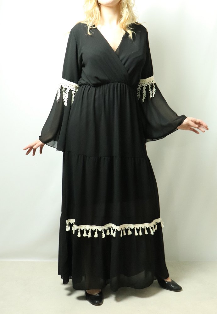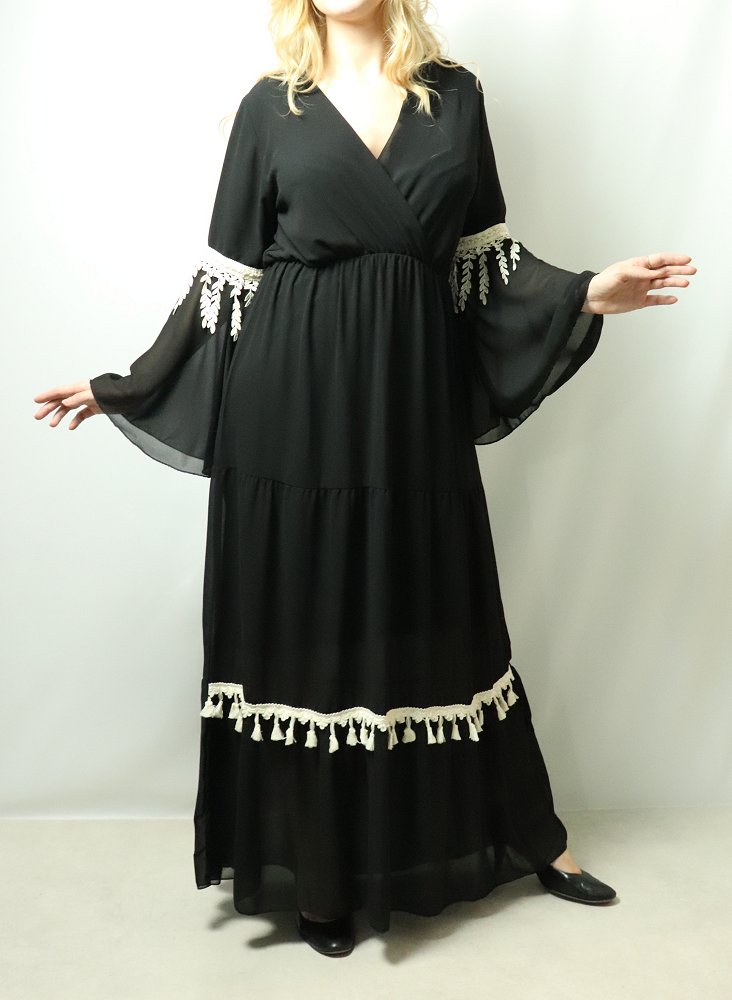 Robe longue, col en V, manches évasées, taille élastique, entièrement doublée excepté l'extrémité des manches. Ce modèle élégant et unique est fait pour vous. Son effet cache-cœur et ses broderies apportent un charme supplémentaire à cette robe.