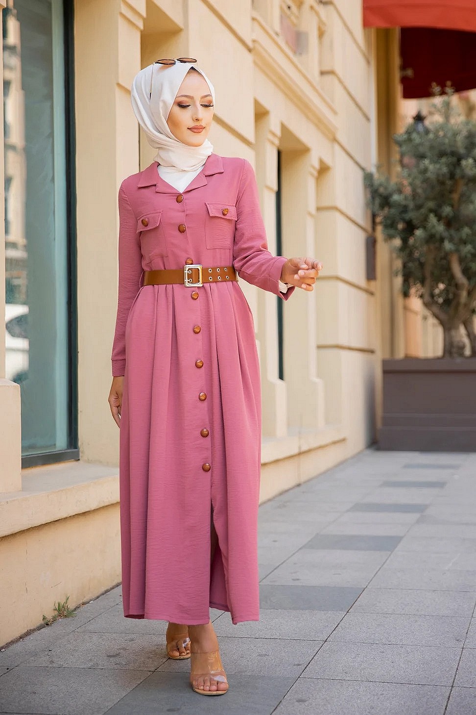 Robe longue casual boutonnee avec sa ceinture (Vetement chic pour femme voilee) - Couleur Rose
