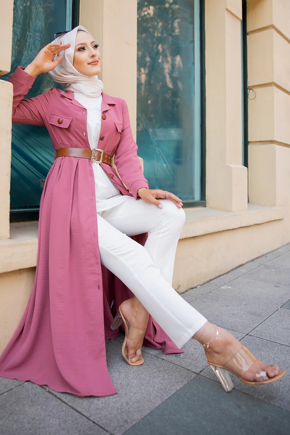 Robe longue casual boutonnée avec sa ceinture (Vetement chic pour femme voilée) - Couleur Rose Vetement & Accessoire