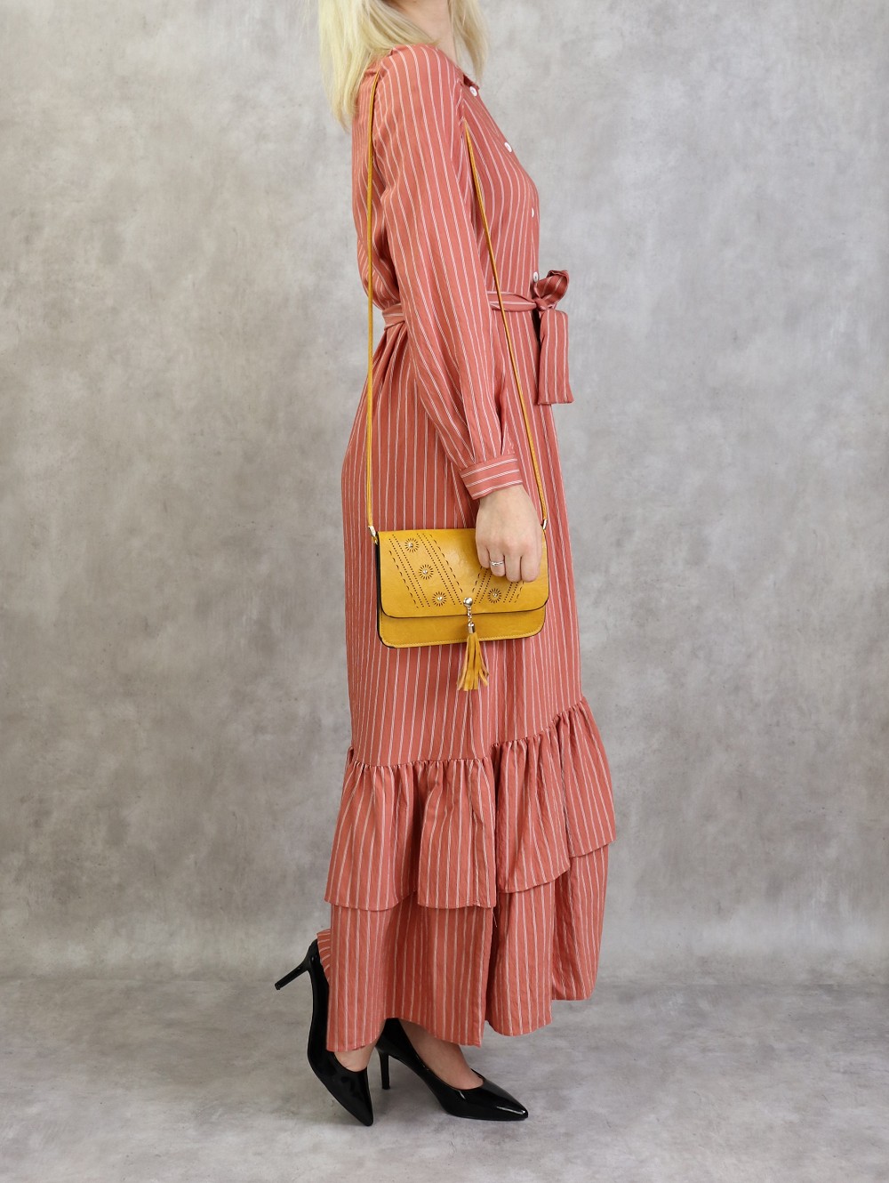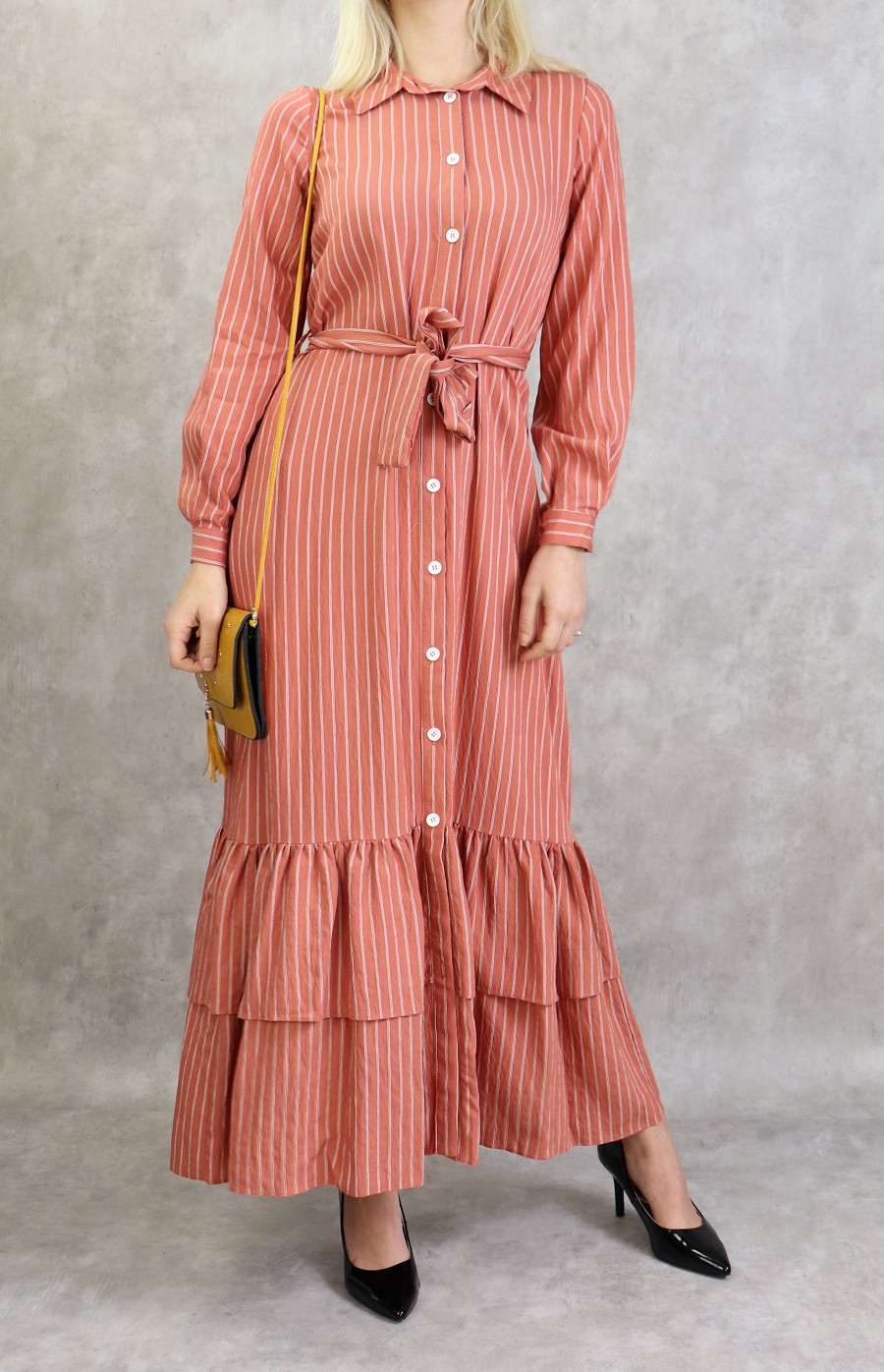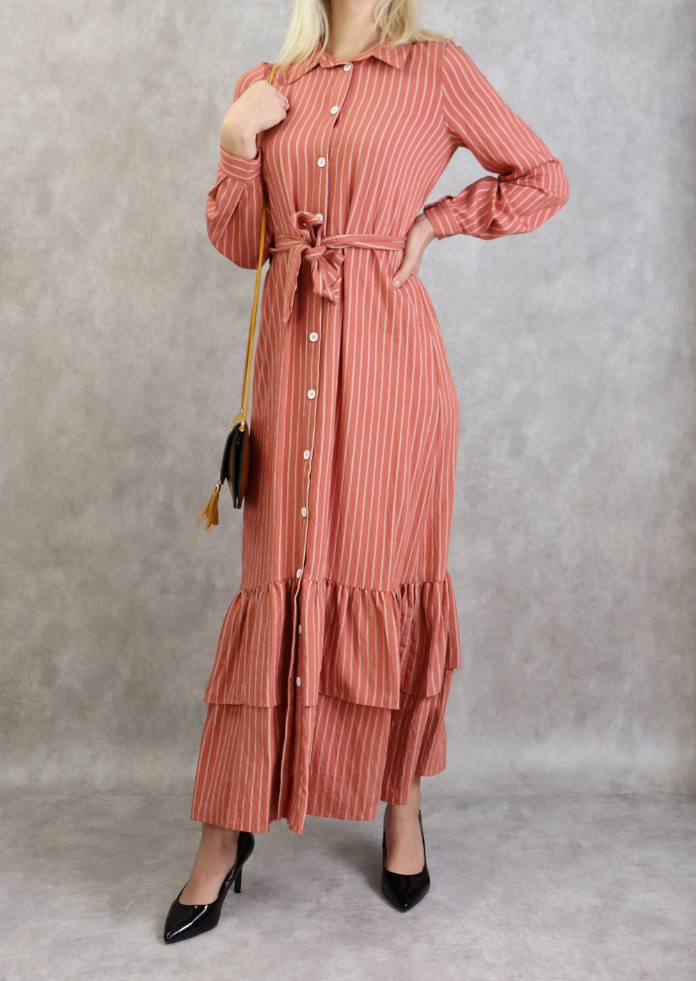 Robe longue, col chemise, fermeture boutons sur toute la longueur, manches finition bouton sur les poignets, ceinture à passants assortie, 2 volants sur la bas. Coupe légèrement évasée, tissu fluide et opaque.