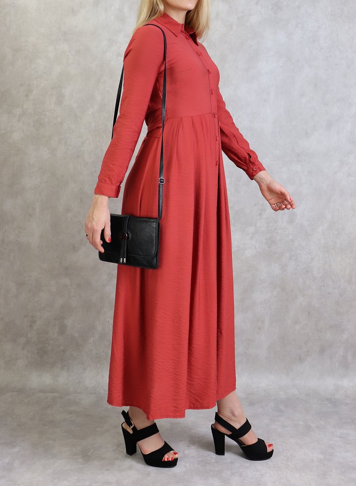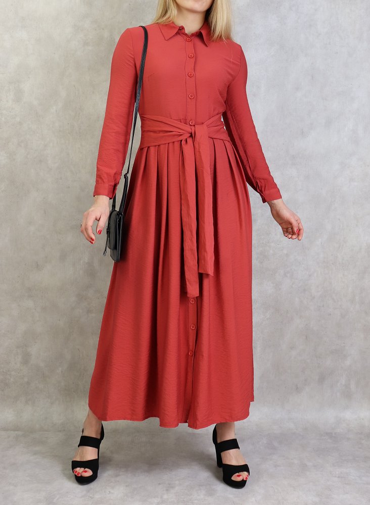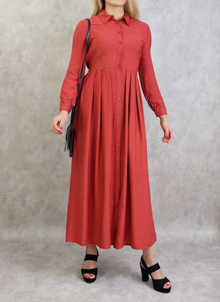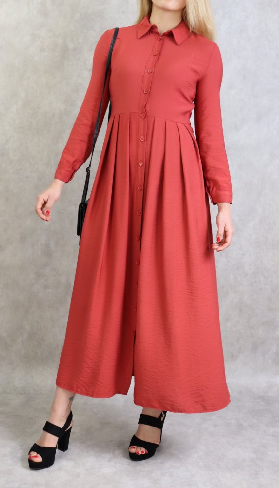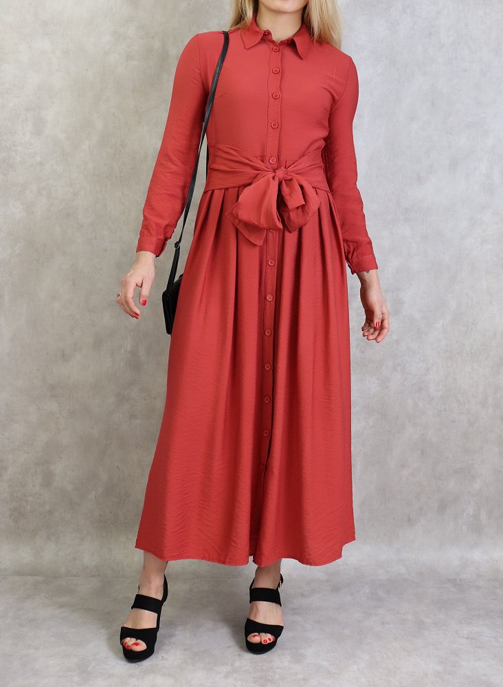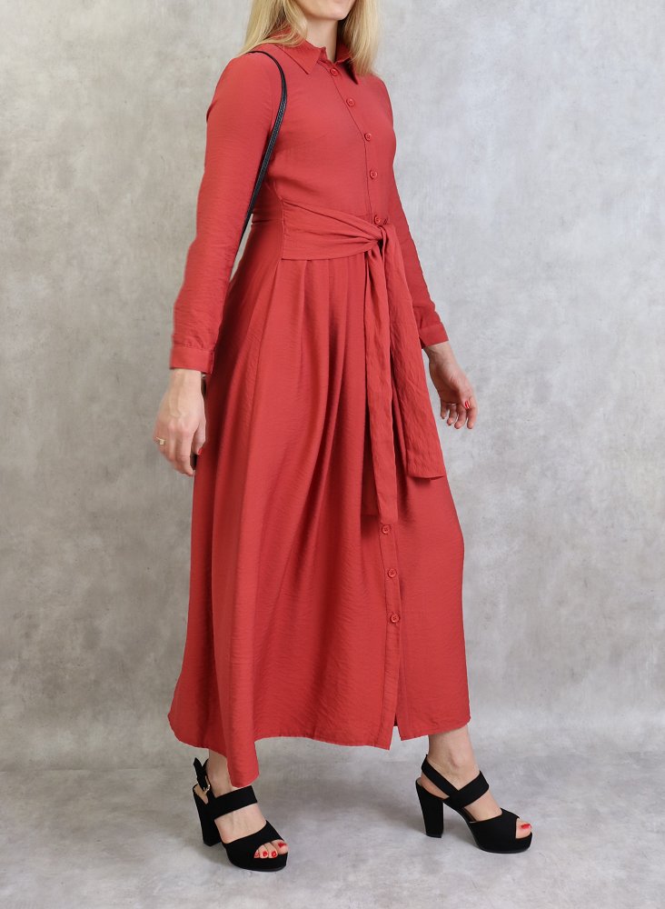 Robe longue casual chic boutonnée sur toute la longueur pour femme - Couleur rouge brique Vetement & Accessoire