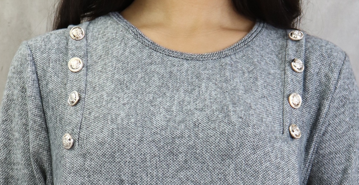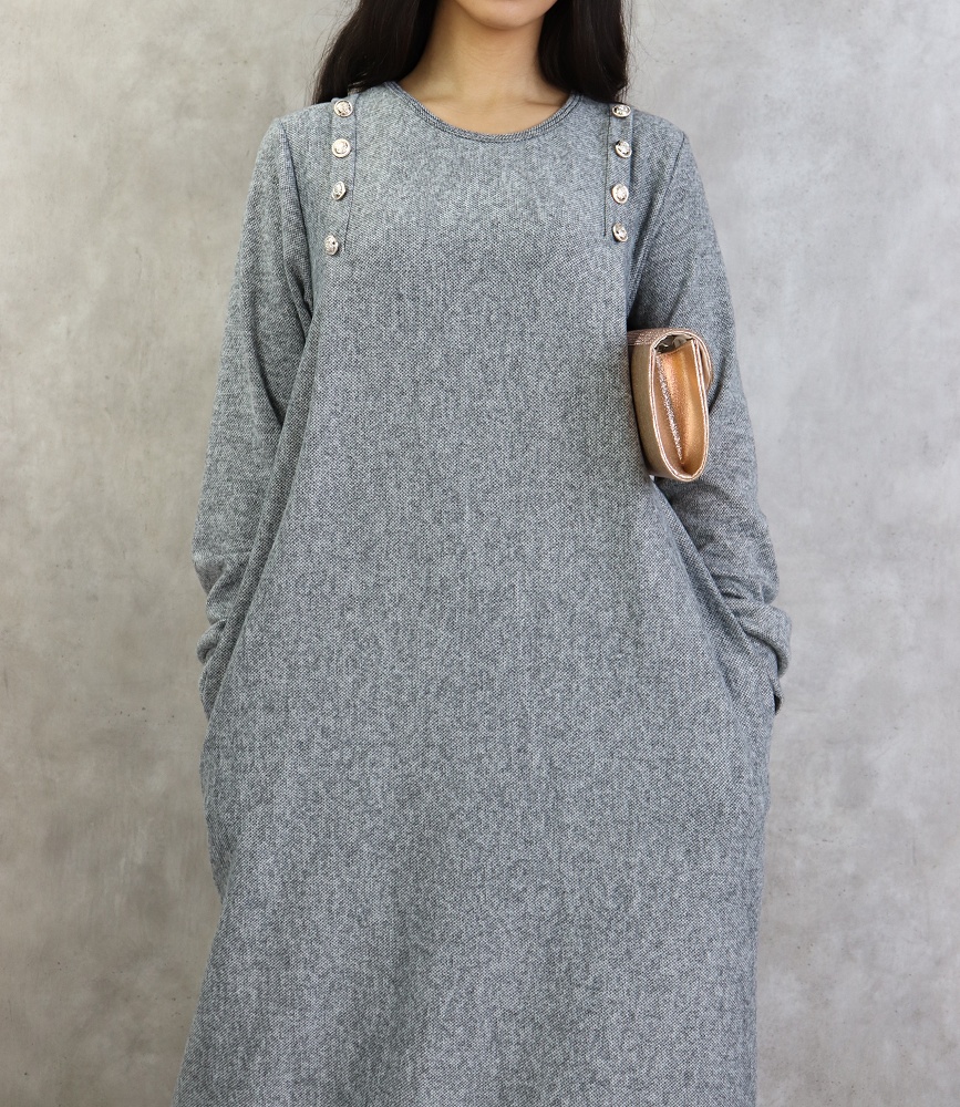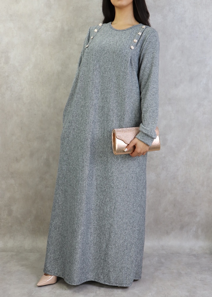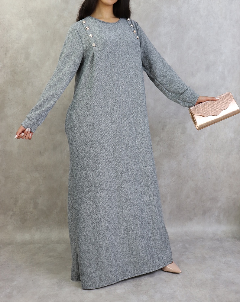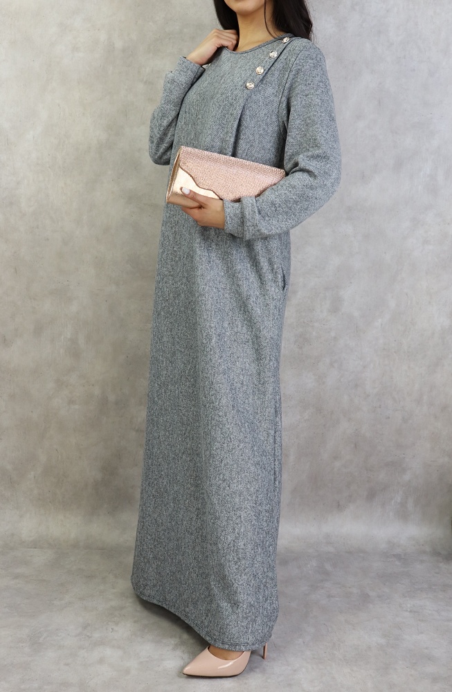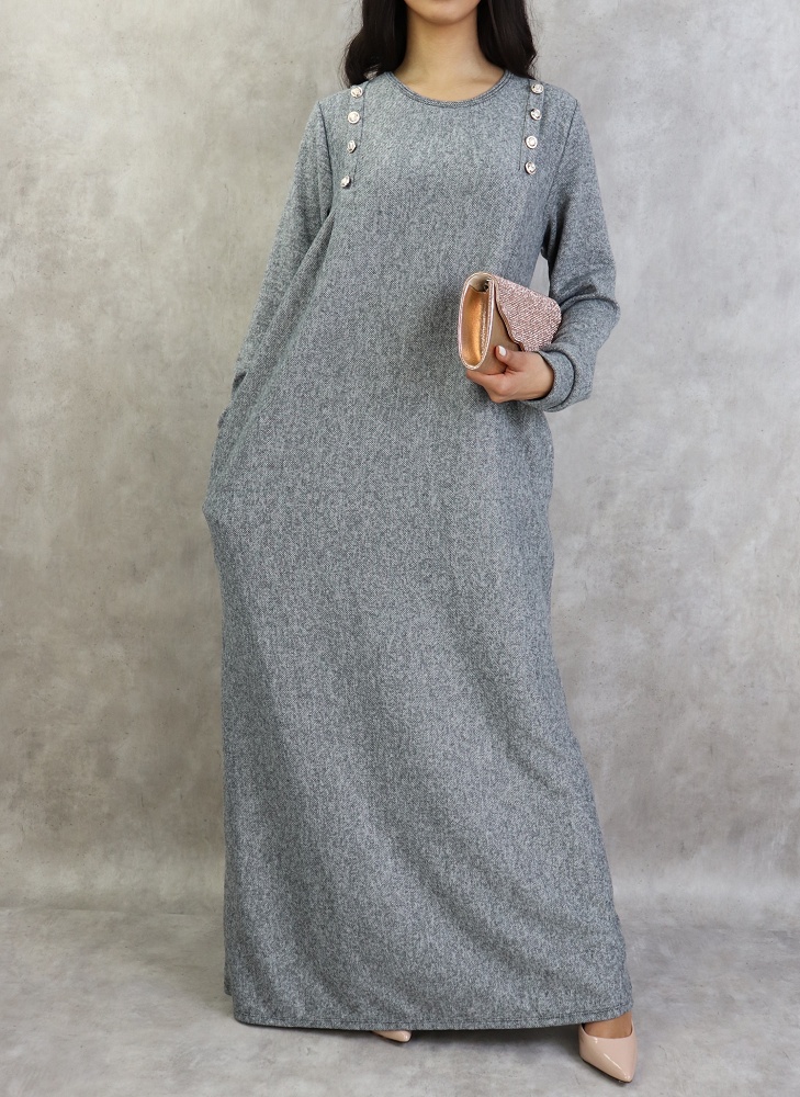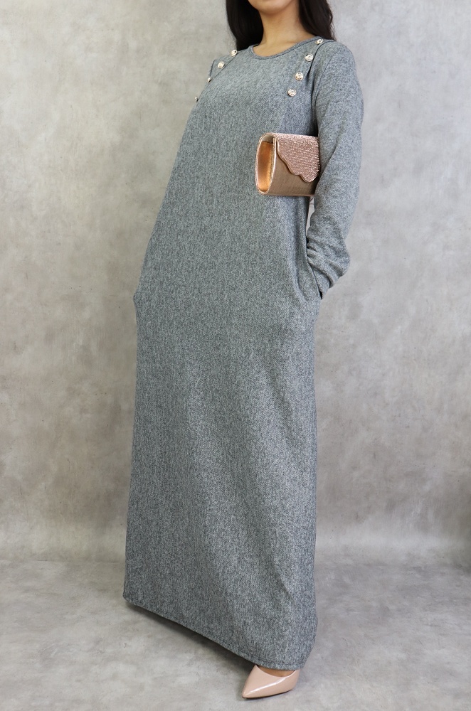 Robe longue, col rond, coupe droite, décoration boutons argentés, poches latérales, tissu chiné.