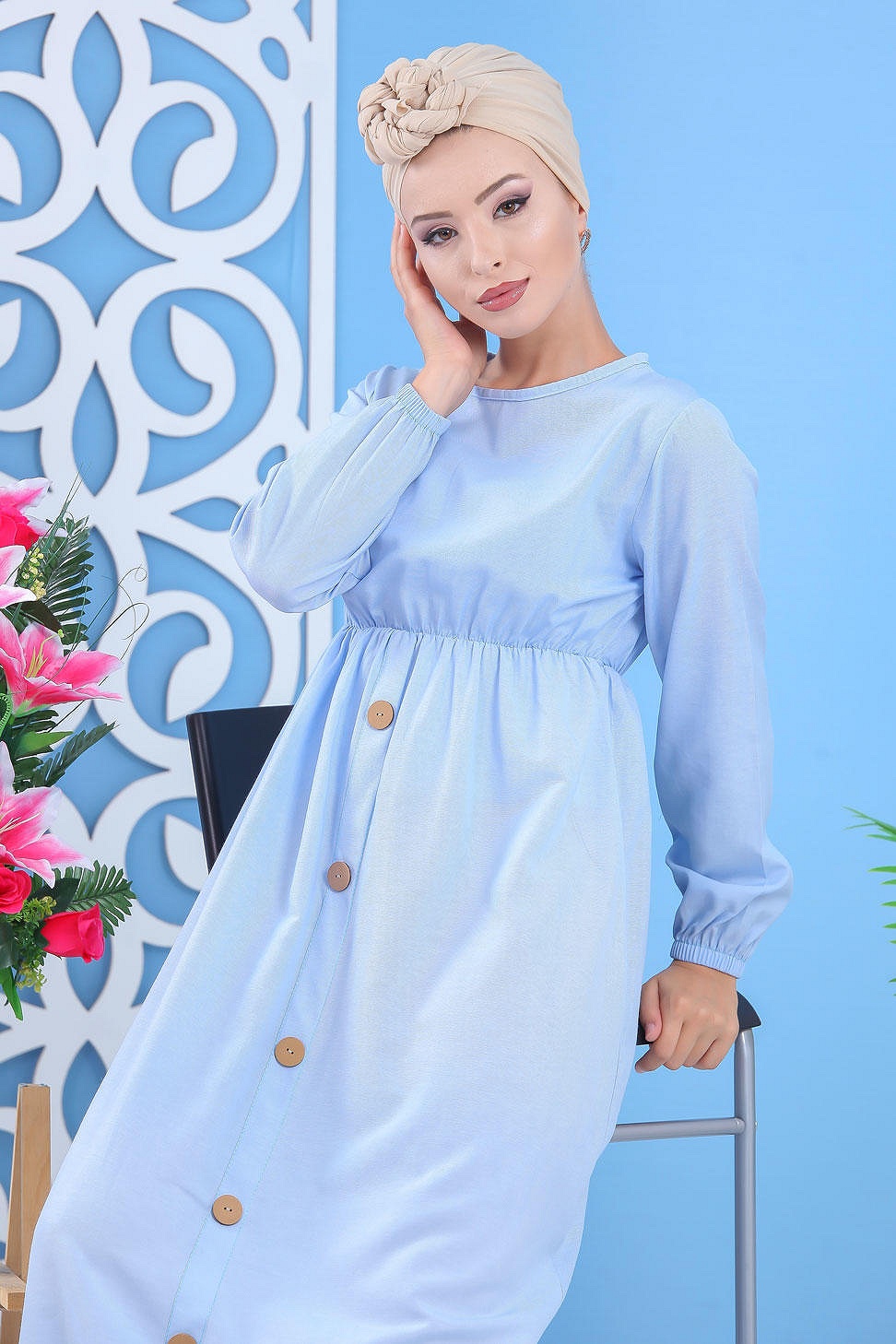 Robe longue, col arrondi, manches finition élastiques aux poignets, taille cintrée par un élastique, décoration boutons sur la partie du bas. Cette robe basique vous donnera une belle allure dans votre quotidien.