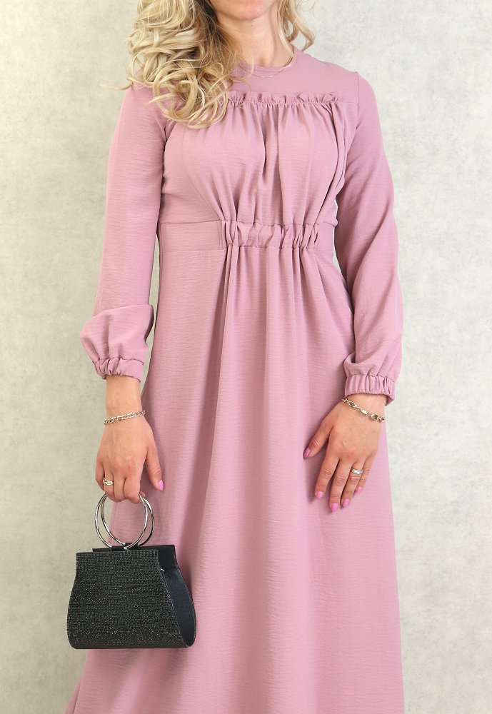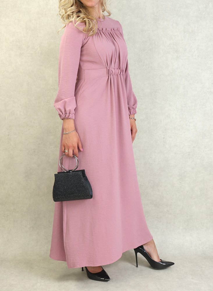 Robe longue couleur unie, tissu fluide de type crêpe, taille élastiquée à l'avant.