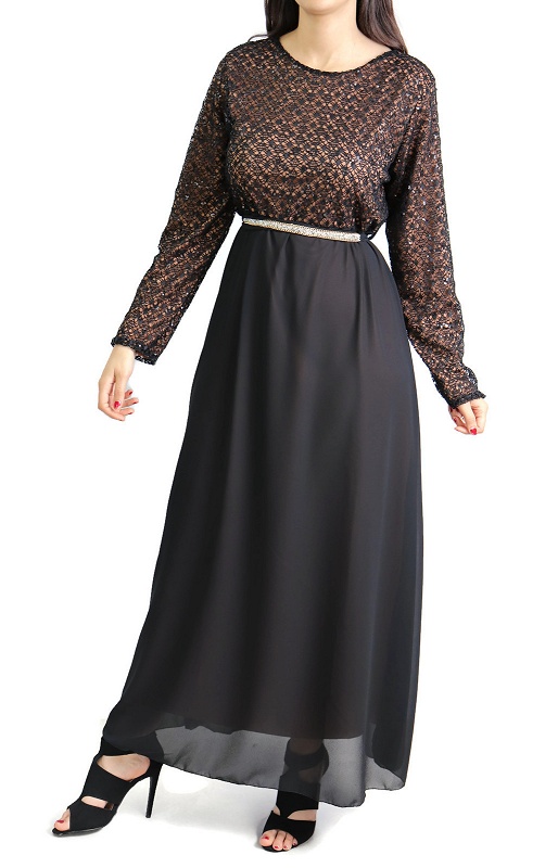 Robe longue évasée de couleur Noire, pailletée sur la partie haute? entièrement doublée (de couleur marron). La partie basse est faite en mousseline. Livrée avec sa ceinture assortie décorée de strass argentés et de chaines dorées.