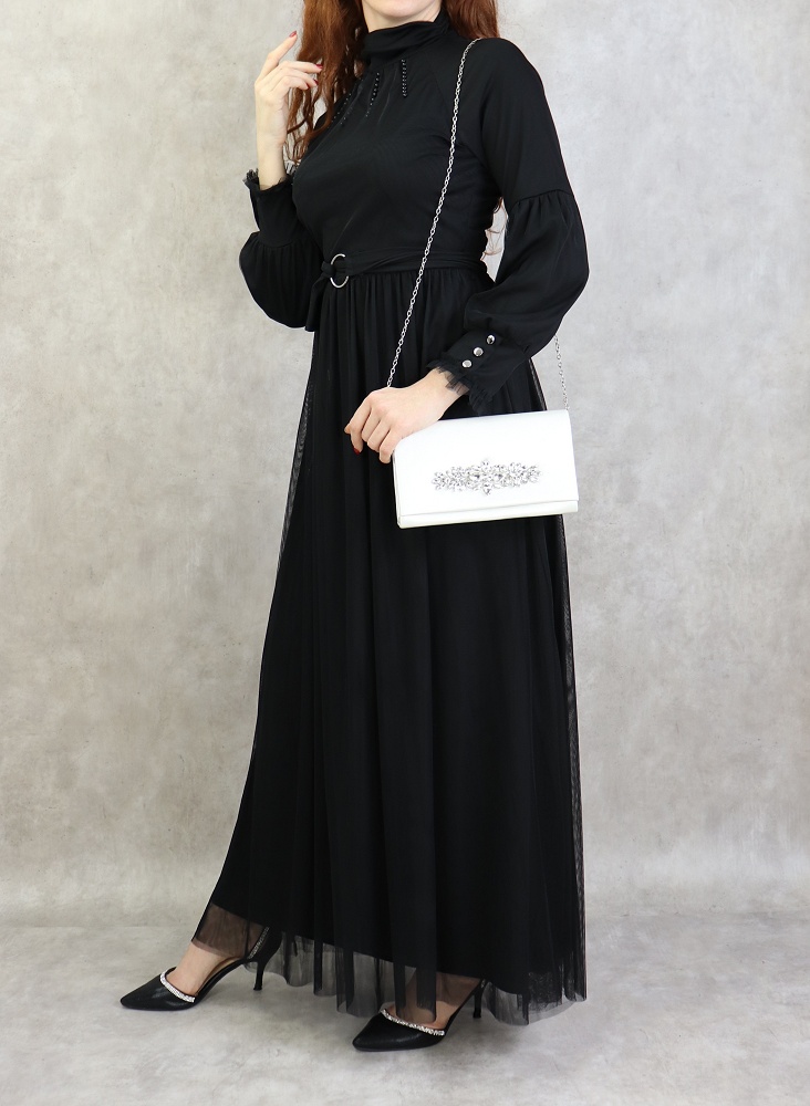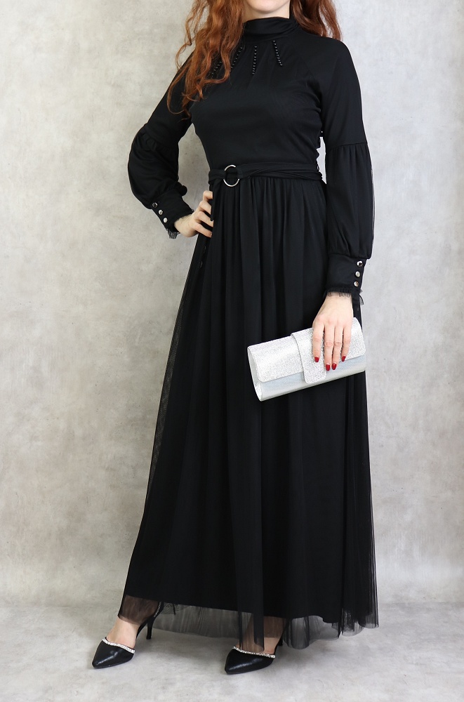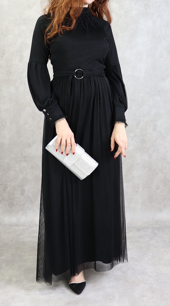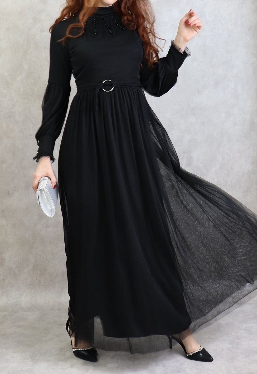 Robe longue de soirée en tulle perlée pour femme - Couleur noire Vetement & Accessoire
