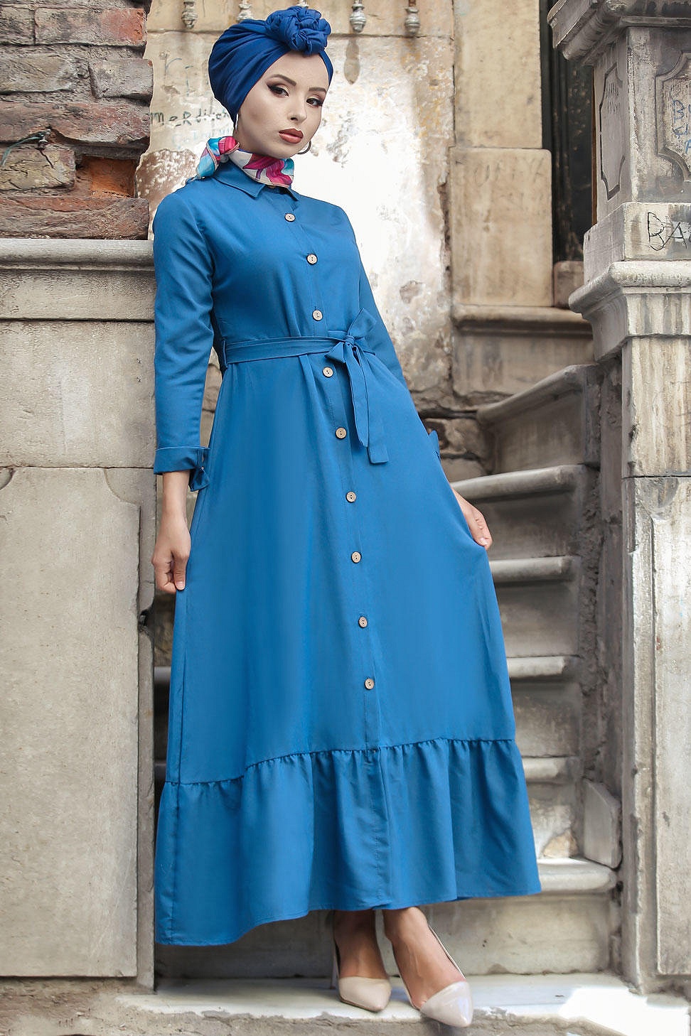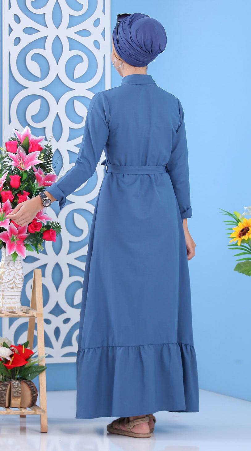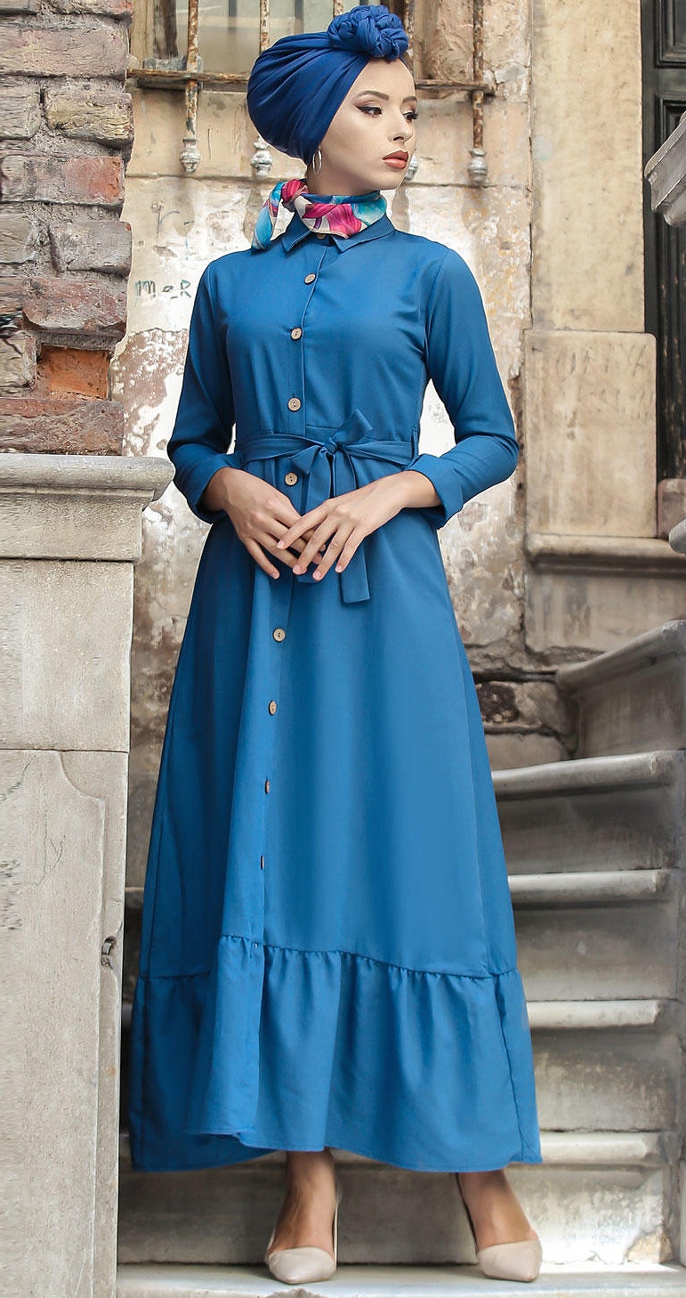 Robe longue de ville boutonnée avec ceinture pour femme - Couleur bleu (Vêtements islamiques modernes) Vetement & Accessoire