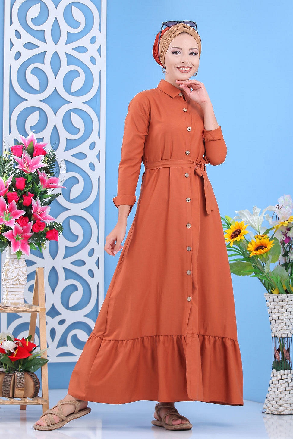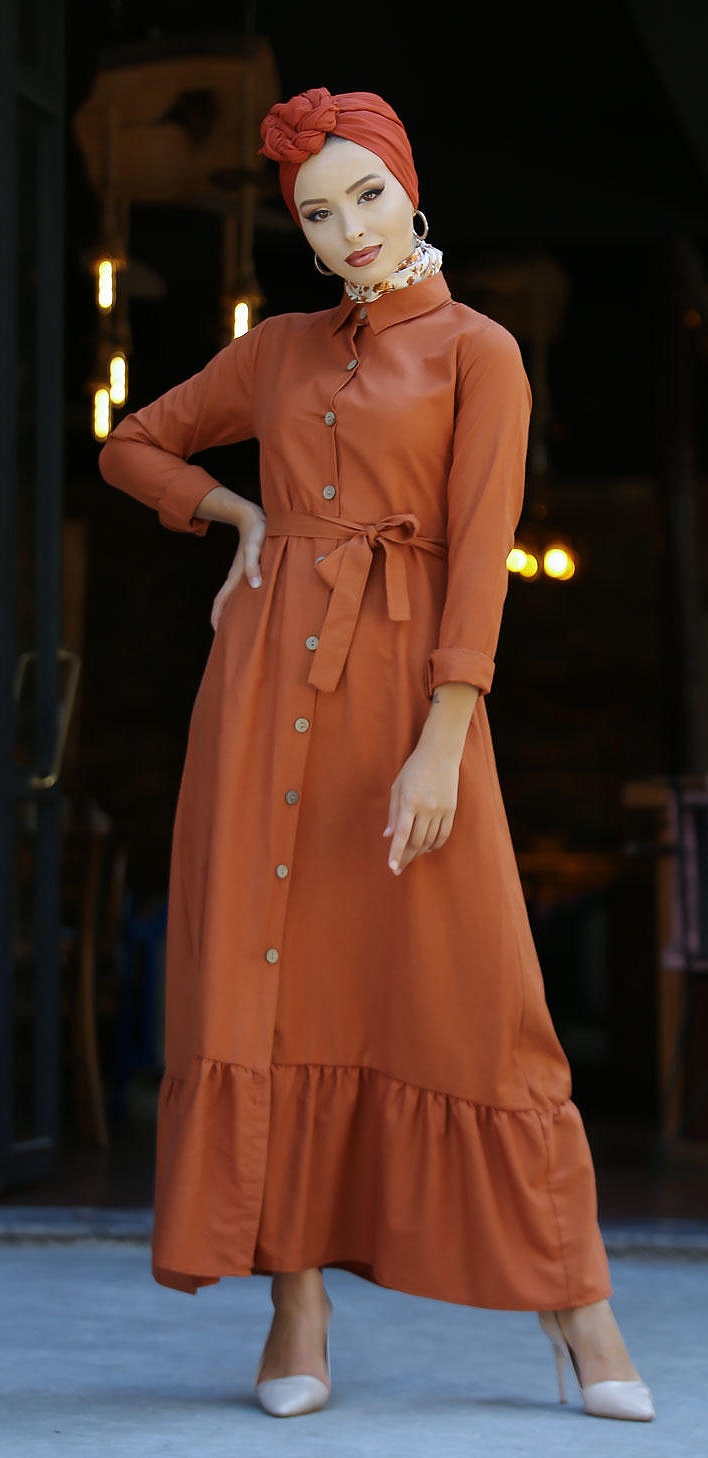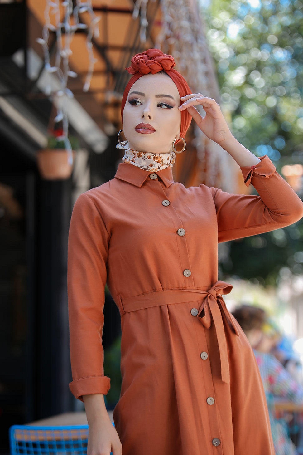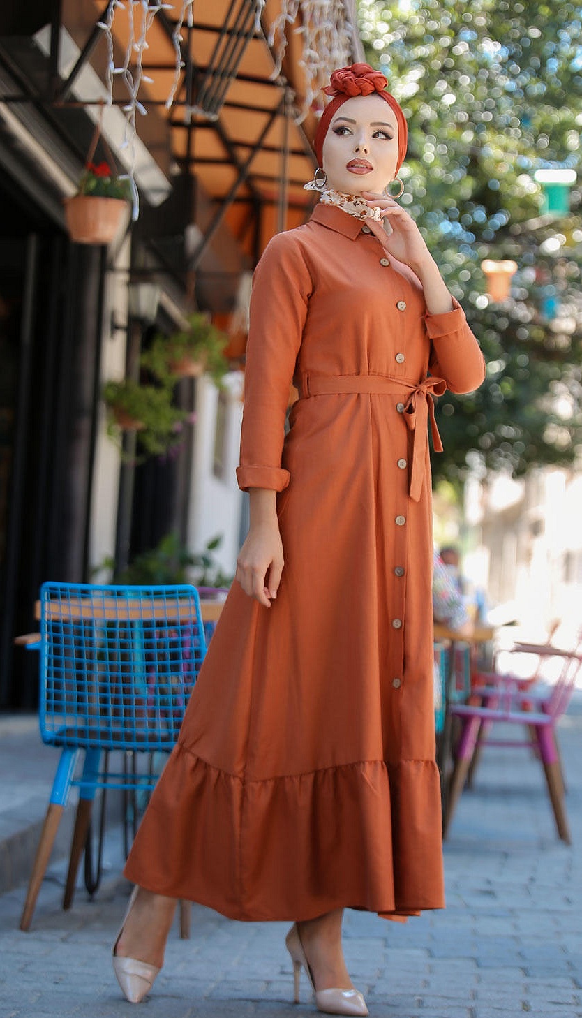 Robe longue de ville boutonnee avec ceinture pour femme - Couleur rouille (Vetement chic pour lexterieur)