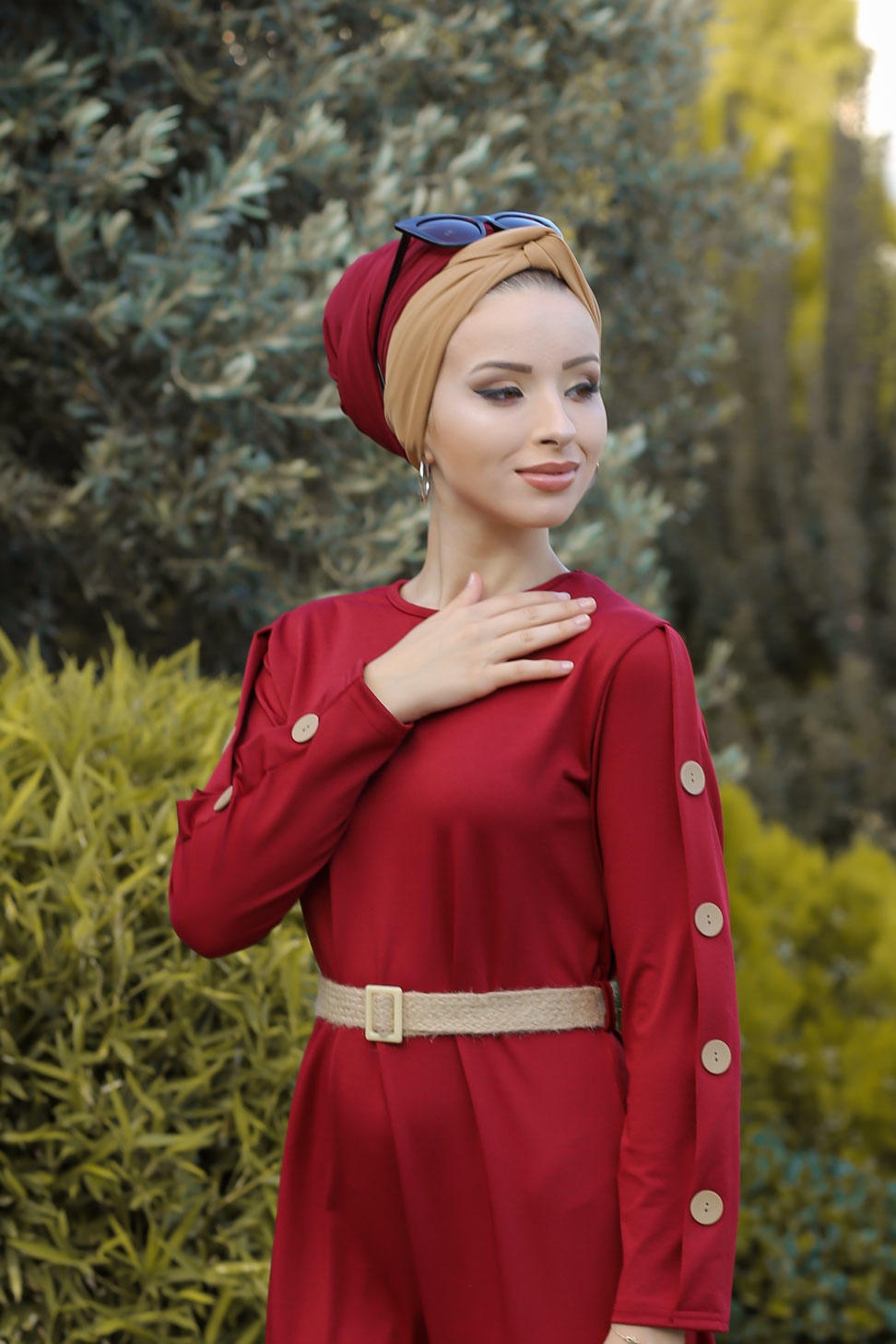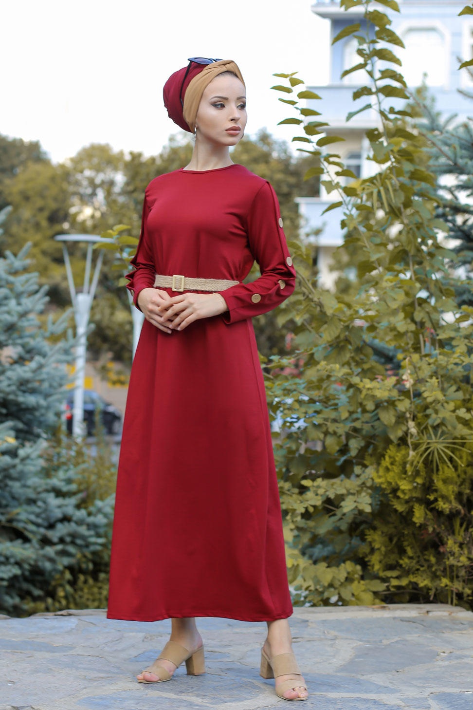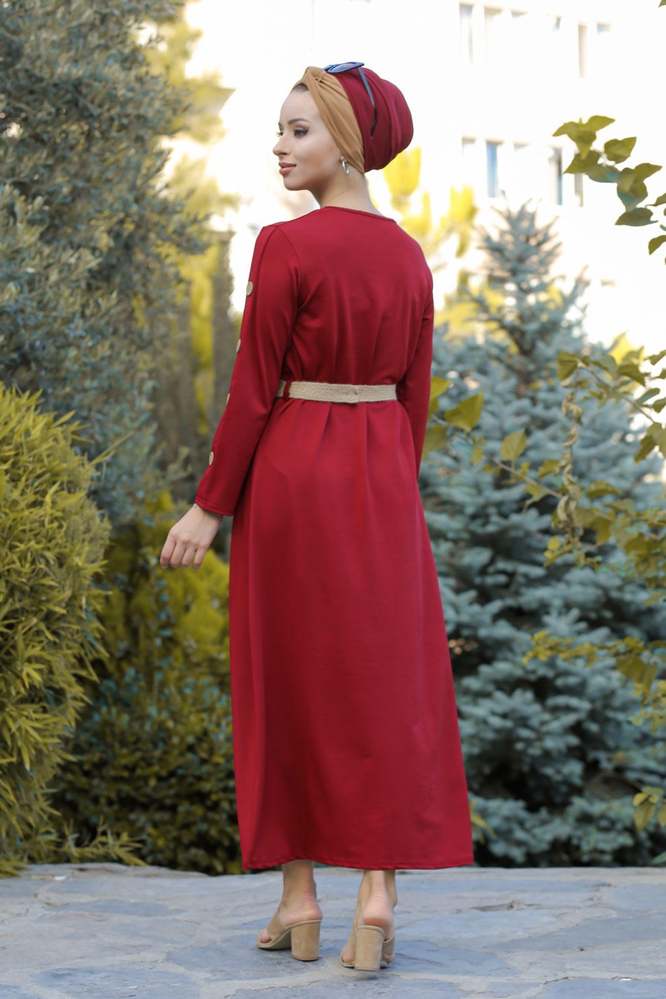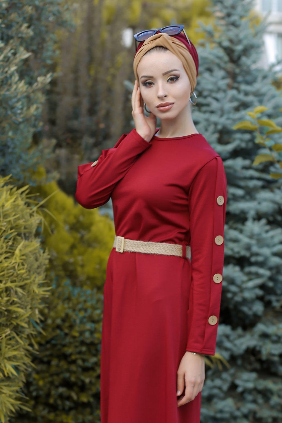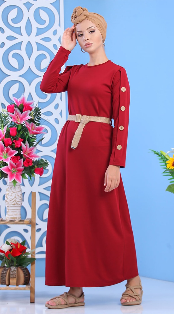Robe longue, coupe droite, col rond, ceinture tissé à passants, manches avec décoration boutons, tissu effet crêpe. Ce modèle sobre et classique s'adapte pour diverses occasions et en toute saison.