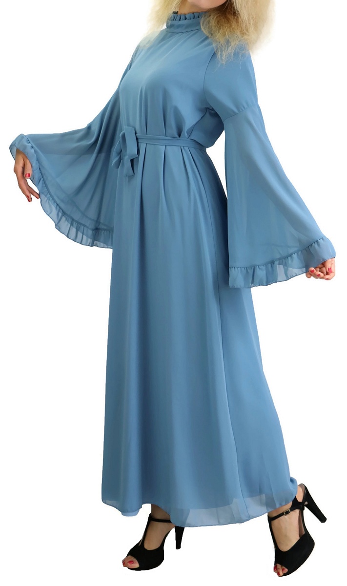 Robe longue, manches évasées, col volanté, fermeture bouton derrière, ceinture fournie ajustable, entièrement doublée (sauf aux manches), tissu effet mousseline.