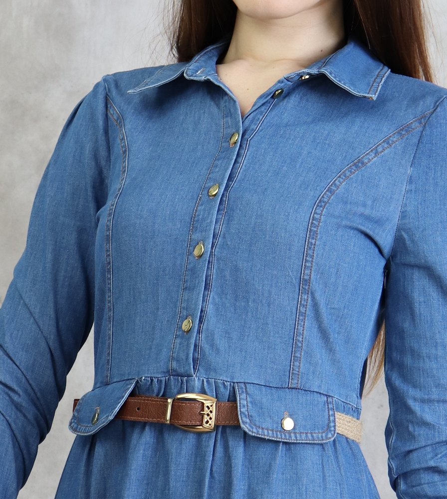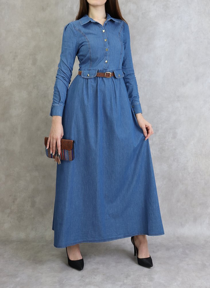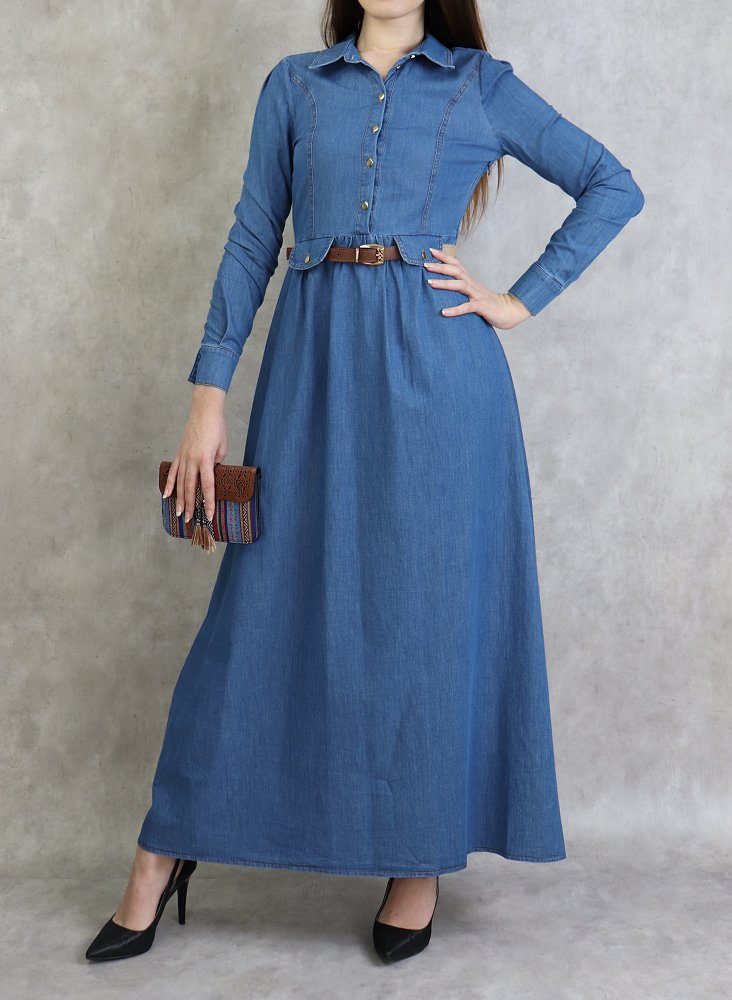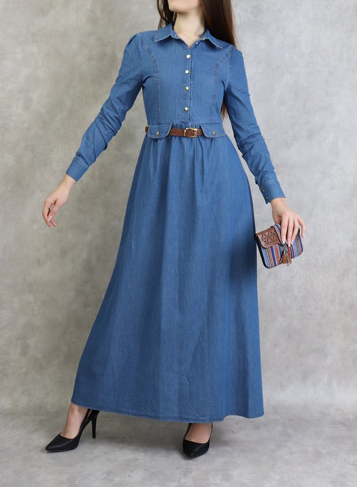 Robe longue, col chemise, fermeture boutons sur le buste, manches longues finition boutons aux poignets, taille cintrée, ceinture à passants. Coupe évasée vers le bas, tissu effet jean.