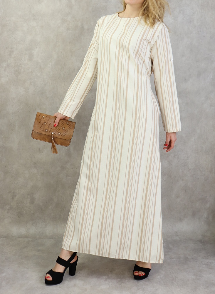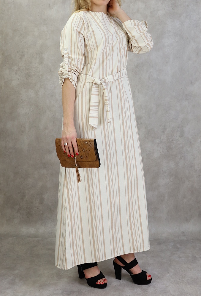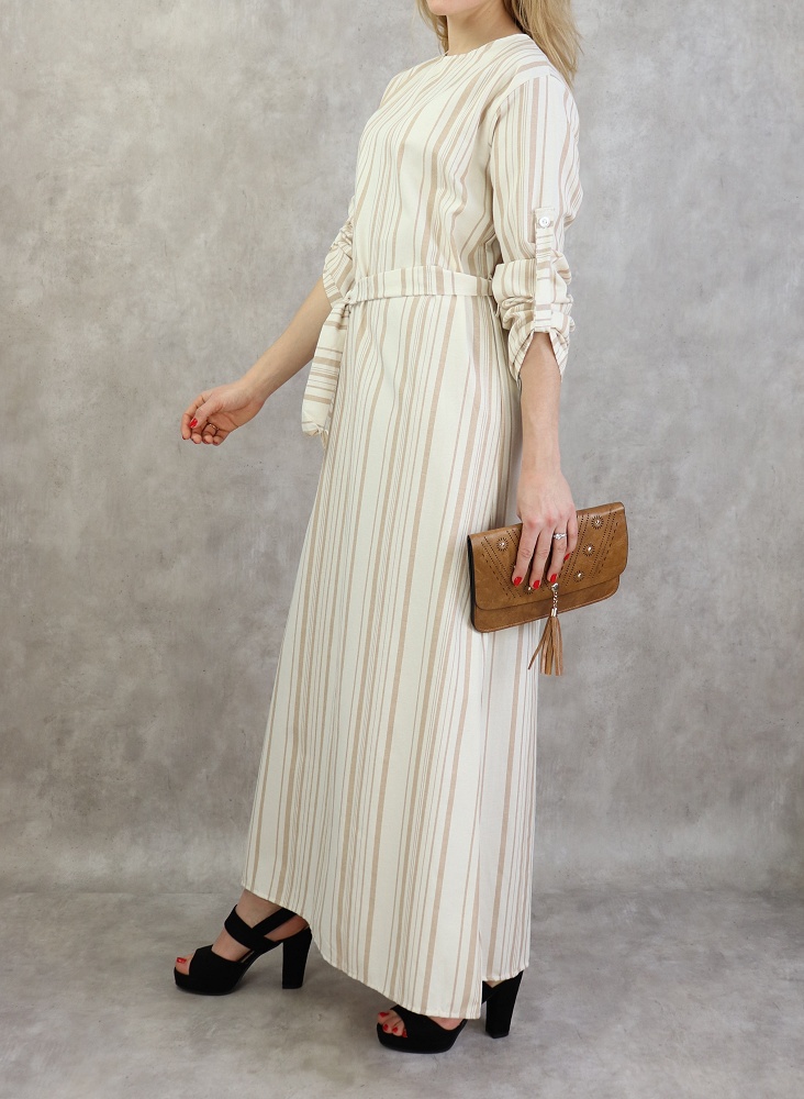 Robe longue, col arrondi, manches ajustables, ceinture à passants assortie, coupe droite, tissu confortable et opaque.