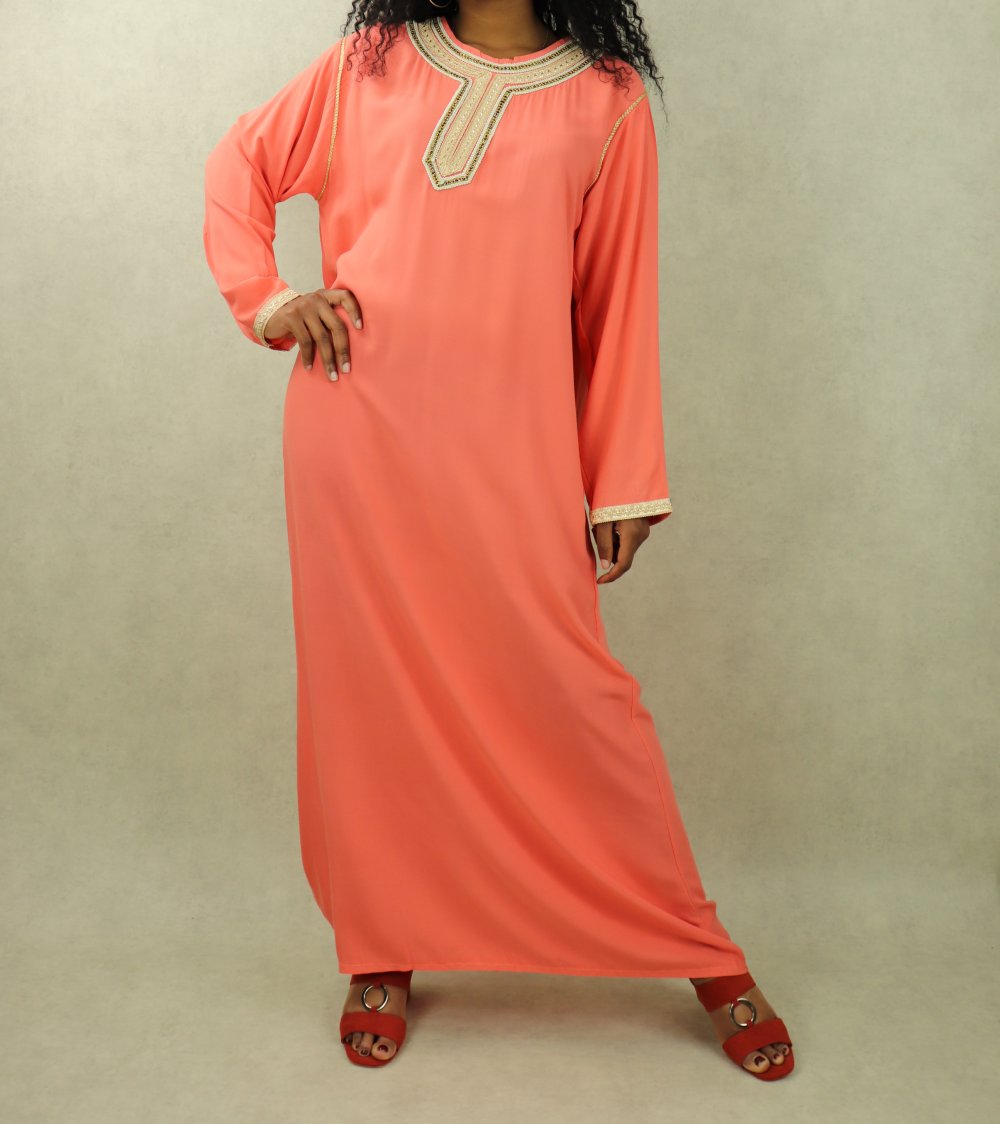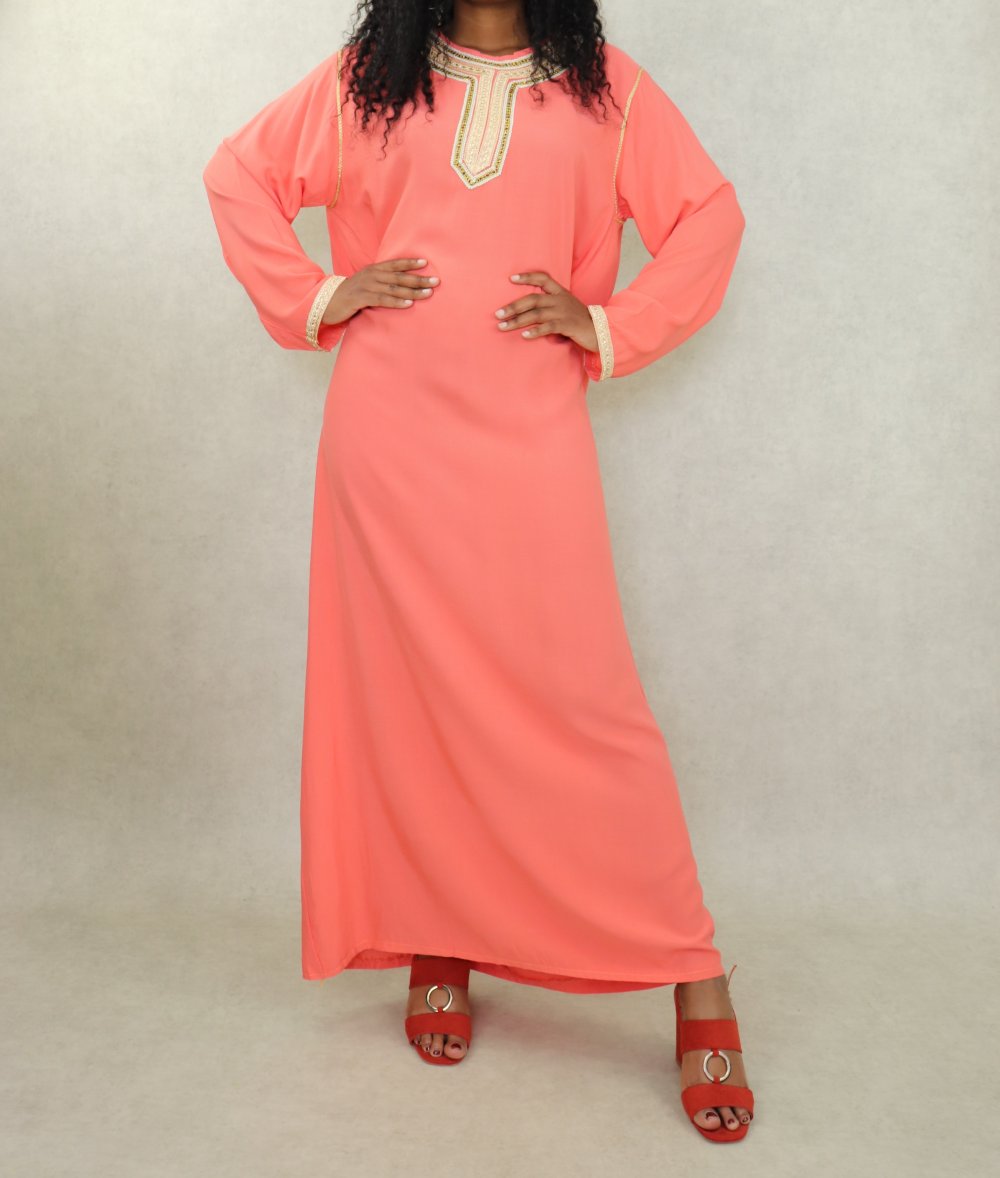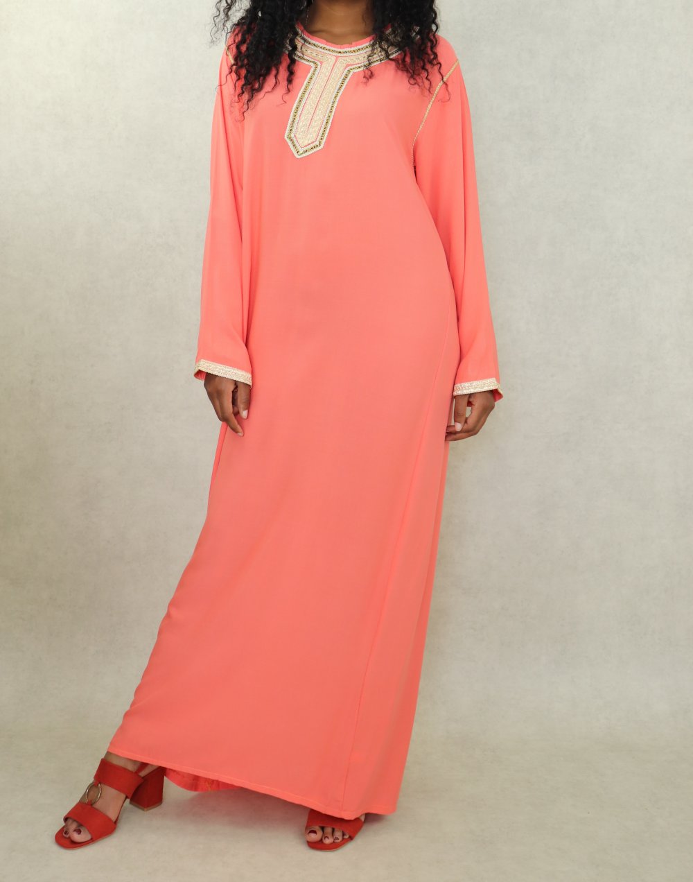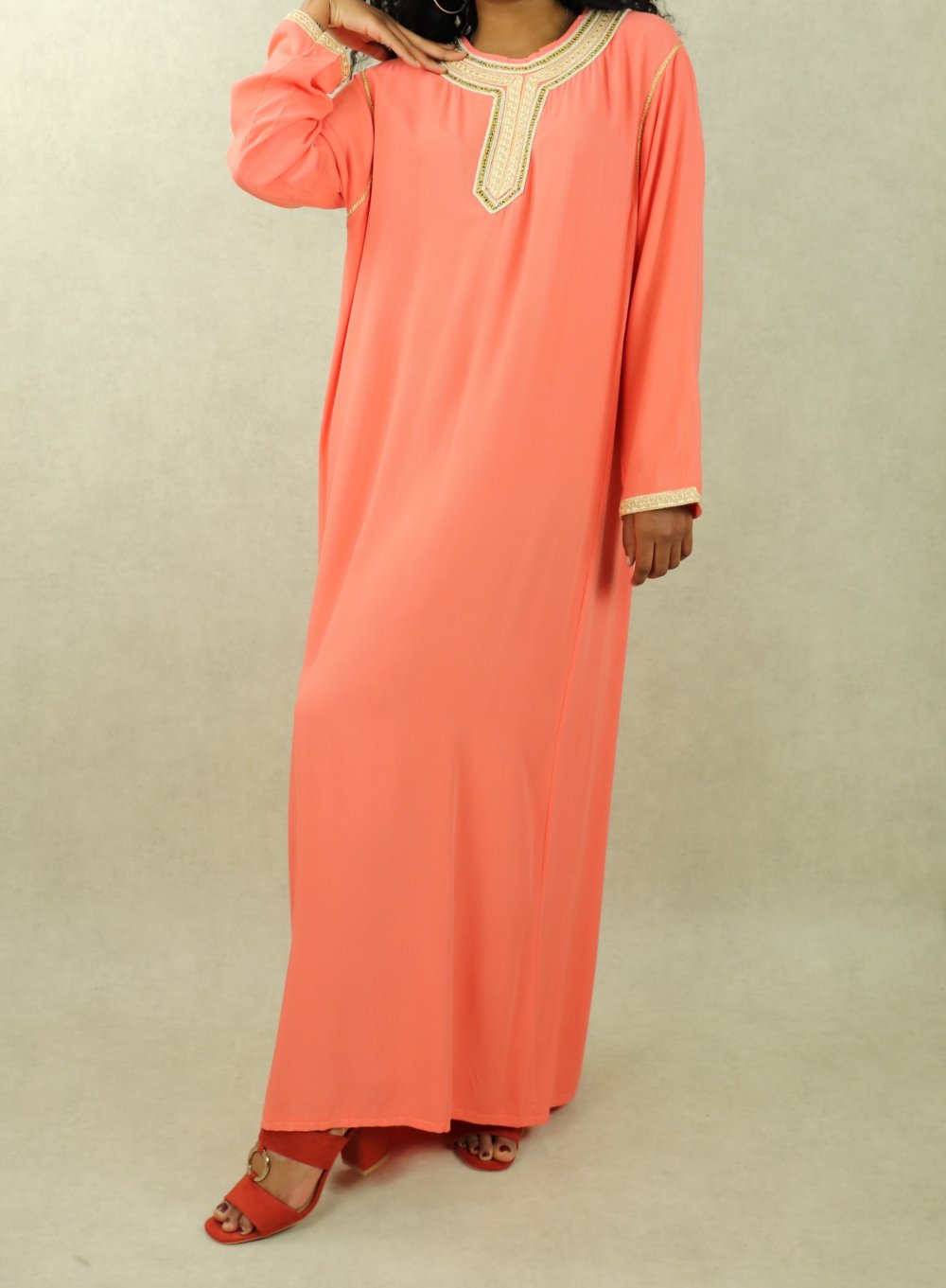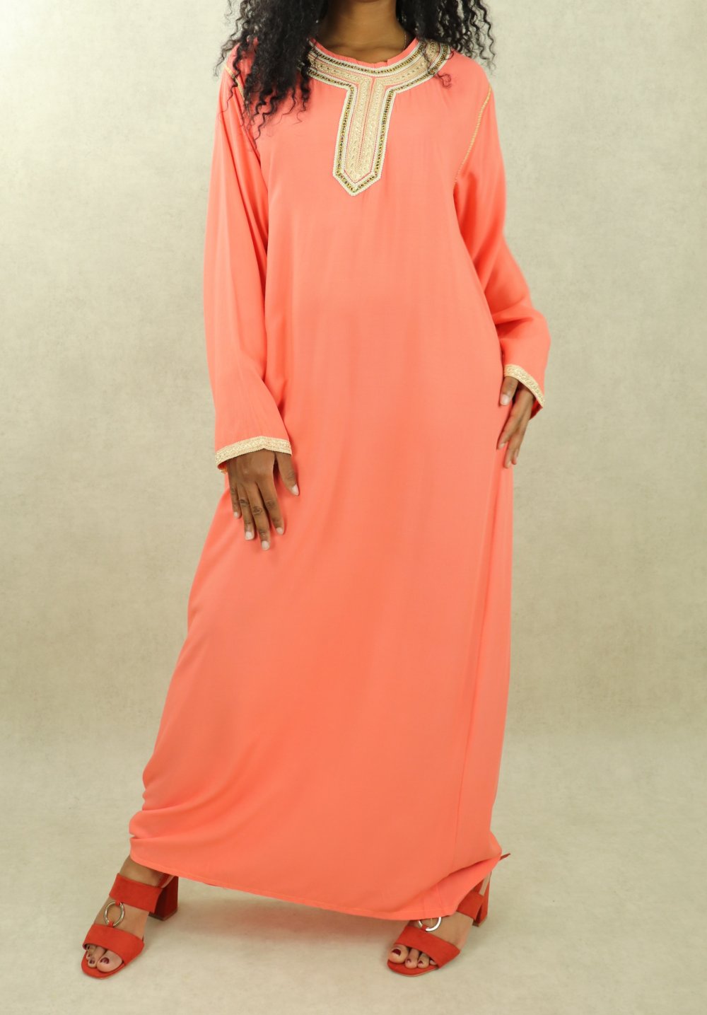 Robe longue à col rond avec broderie brillante sur le devant et au niveau des poignets.
