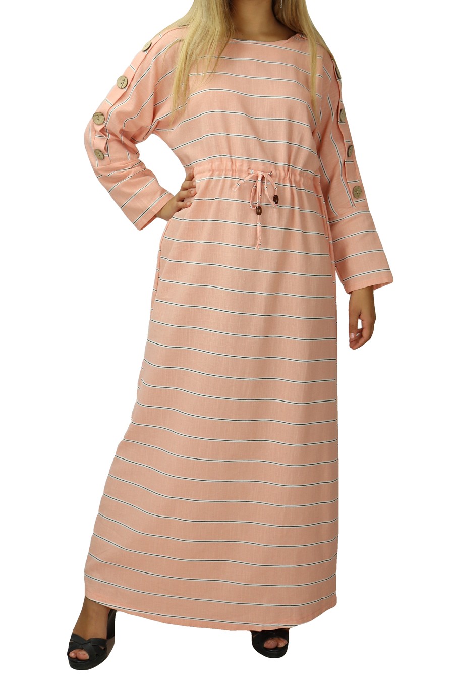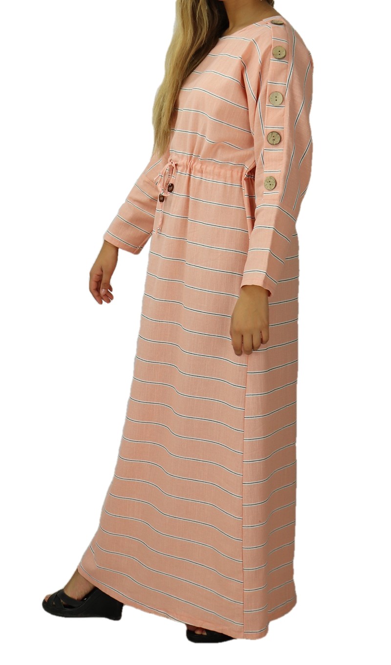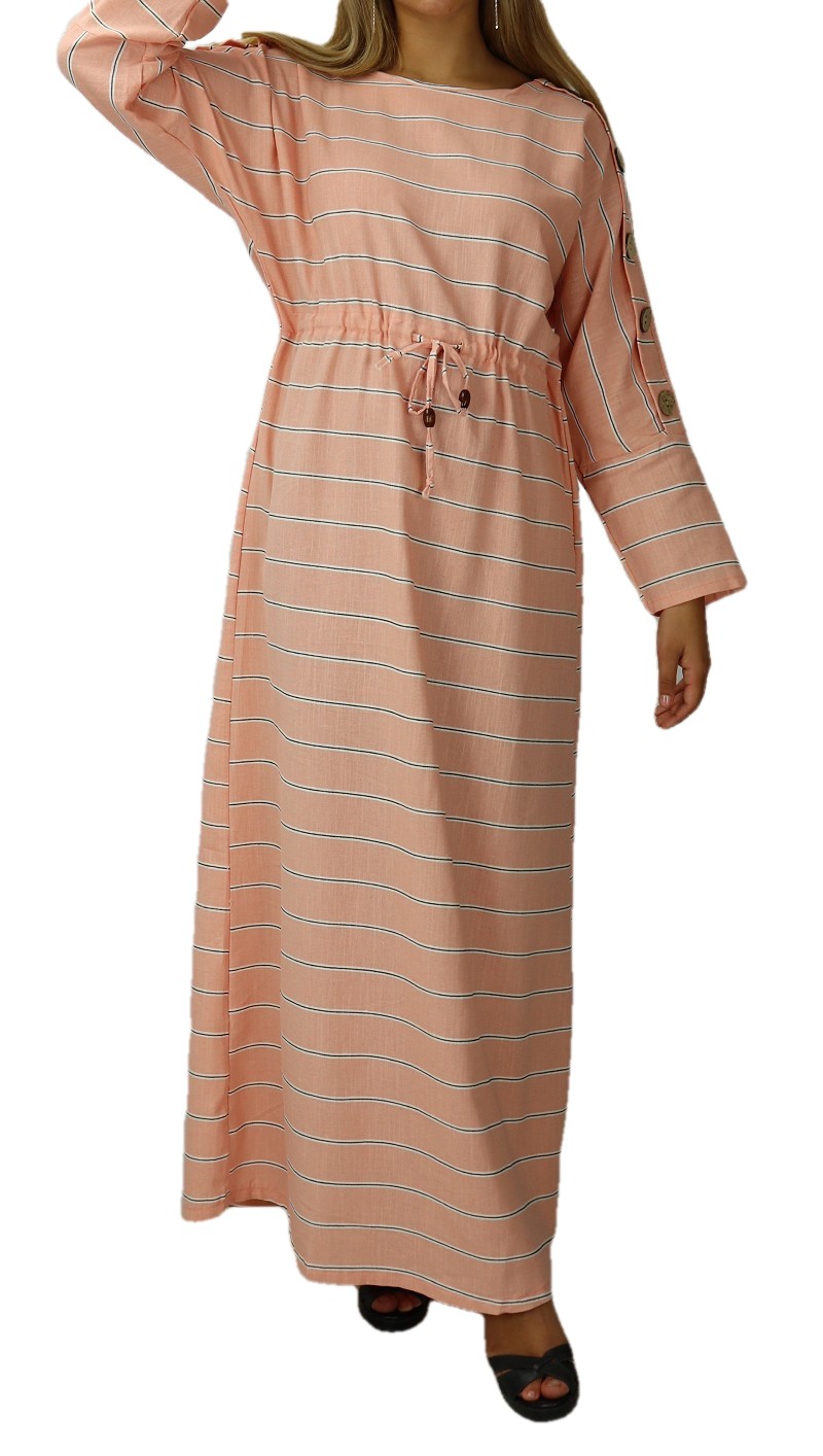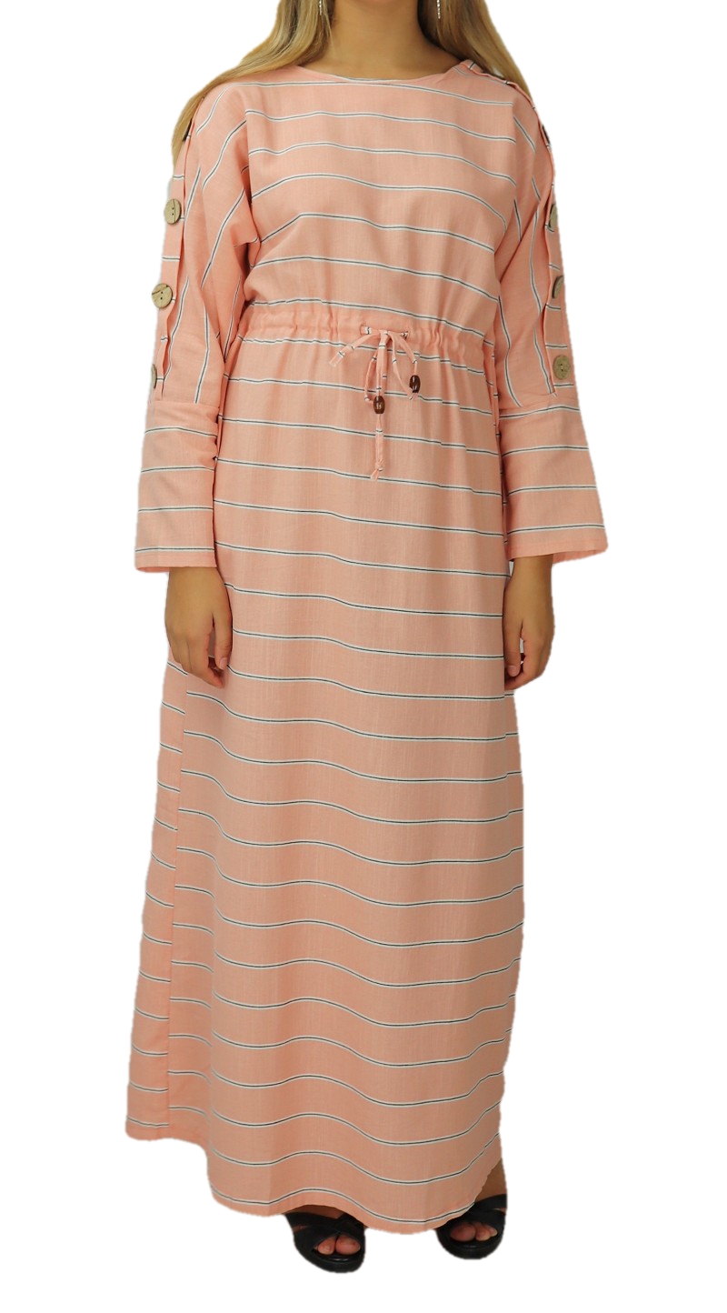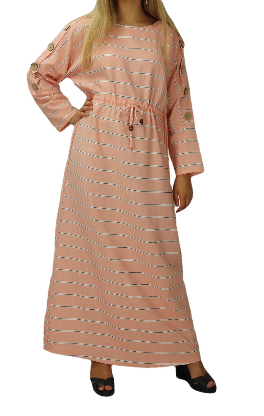 Robe longue, col rond, manches droites décorées de boutons, taille ajustable avec lien de serrage. Coupe droite, tissu léger mi saison, effet tissé.