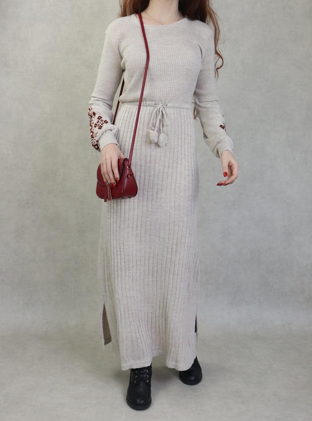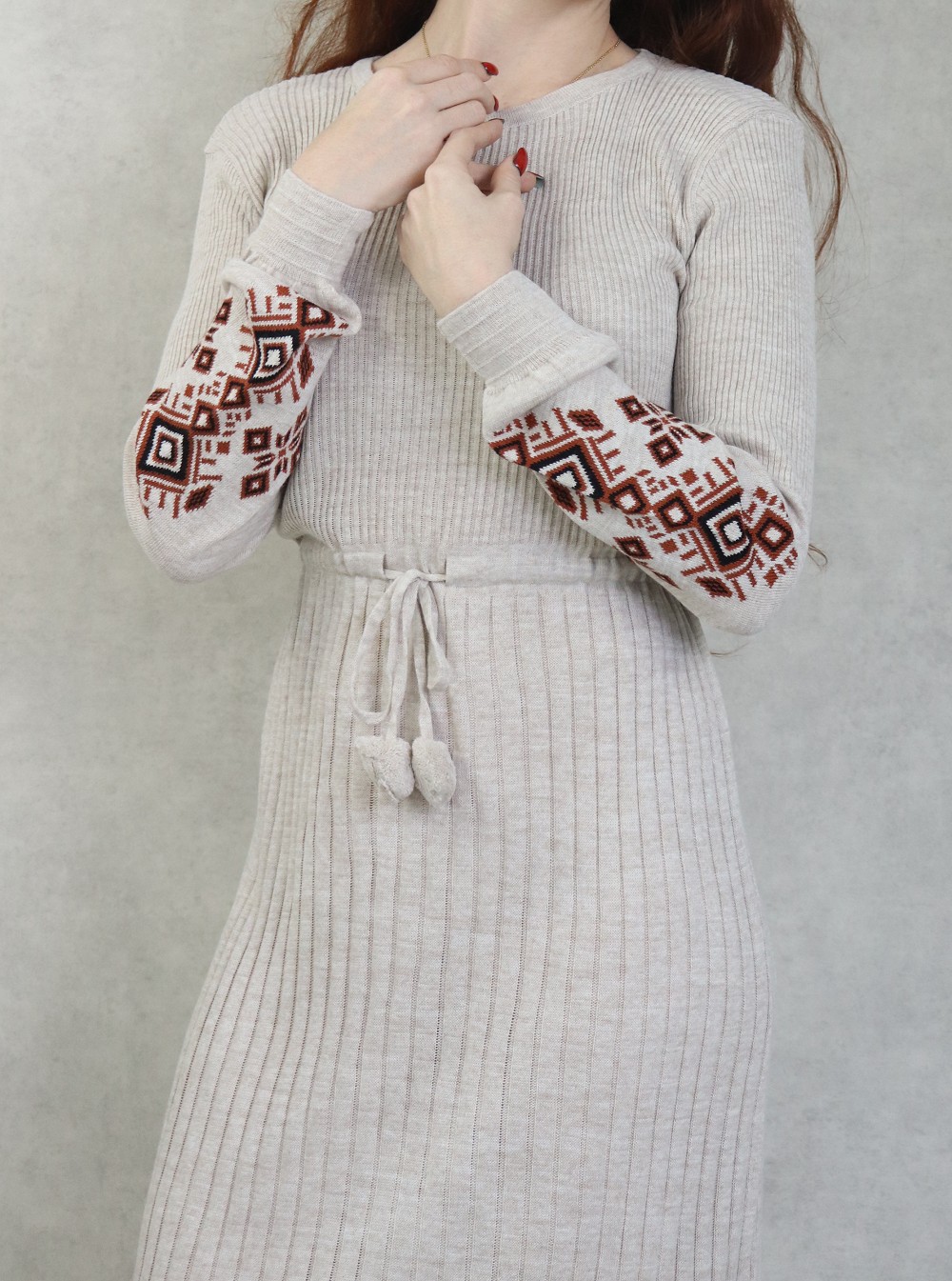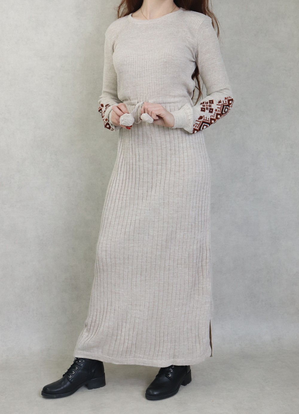 Robe originale, elle mettra en valeur votre côté chic et féminin. Encolure rond. Manches longues avec motif brodé sur l'avant bras. Découpe taille avec un lien de serrage. Facile à vivre, douce sur la peau et bien souple, la robe pull en côtes.