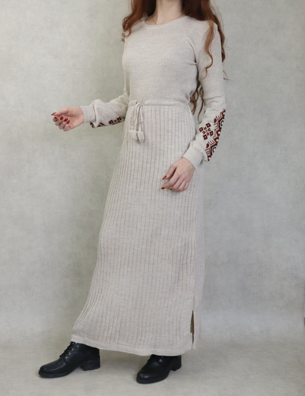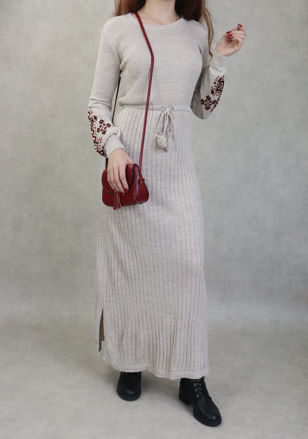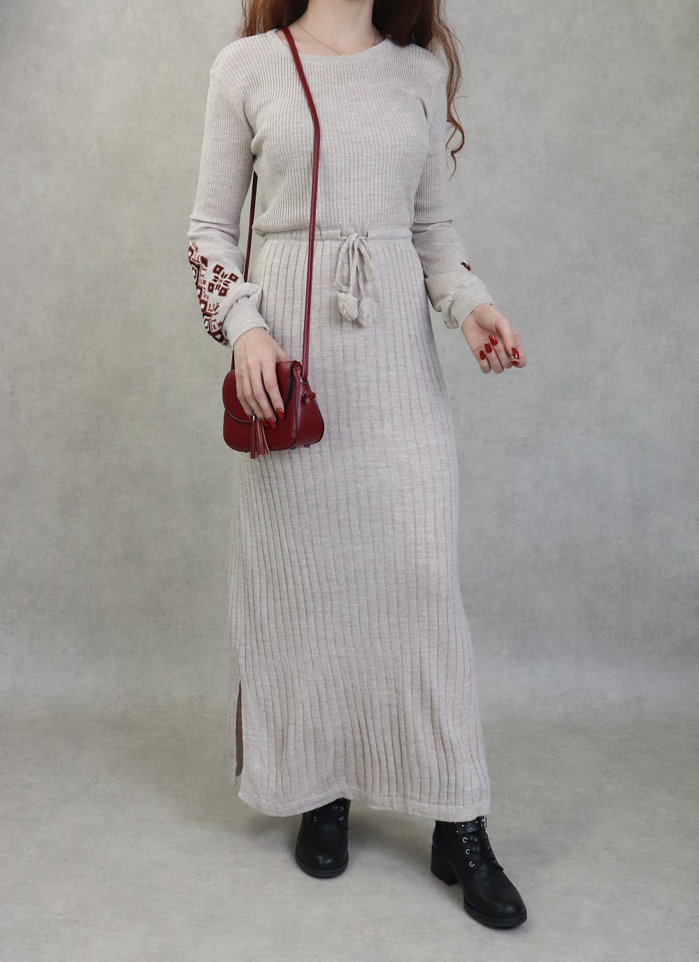 Robe originale, elle mettra en valeur votre côté chic et féminin. Encolure rond. Manches longues avec motif brodé sur l'avant bras. Découpe taille avec un lien de serrage. Facile à vivre, douce sur la peau et bien souple, la robe pull en côtes.