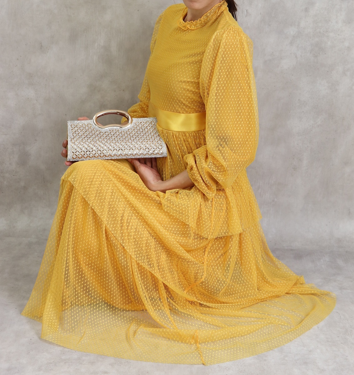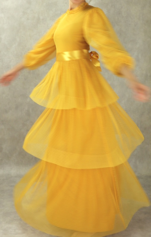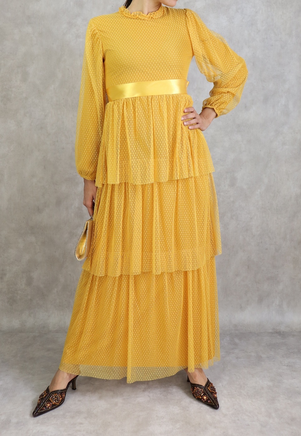 Robe longue en tulle a volants pour femme - Couleur jaune moutarde