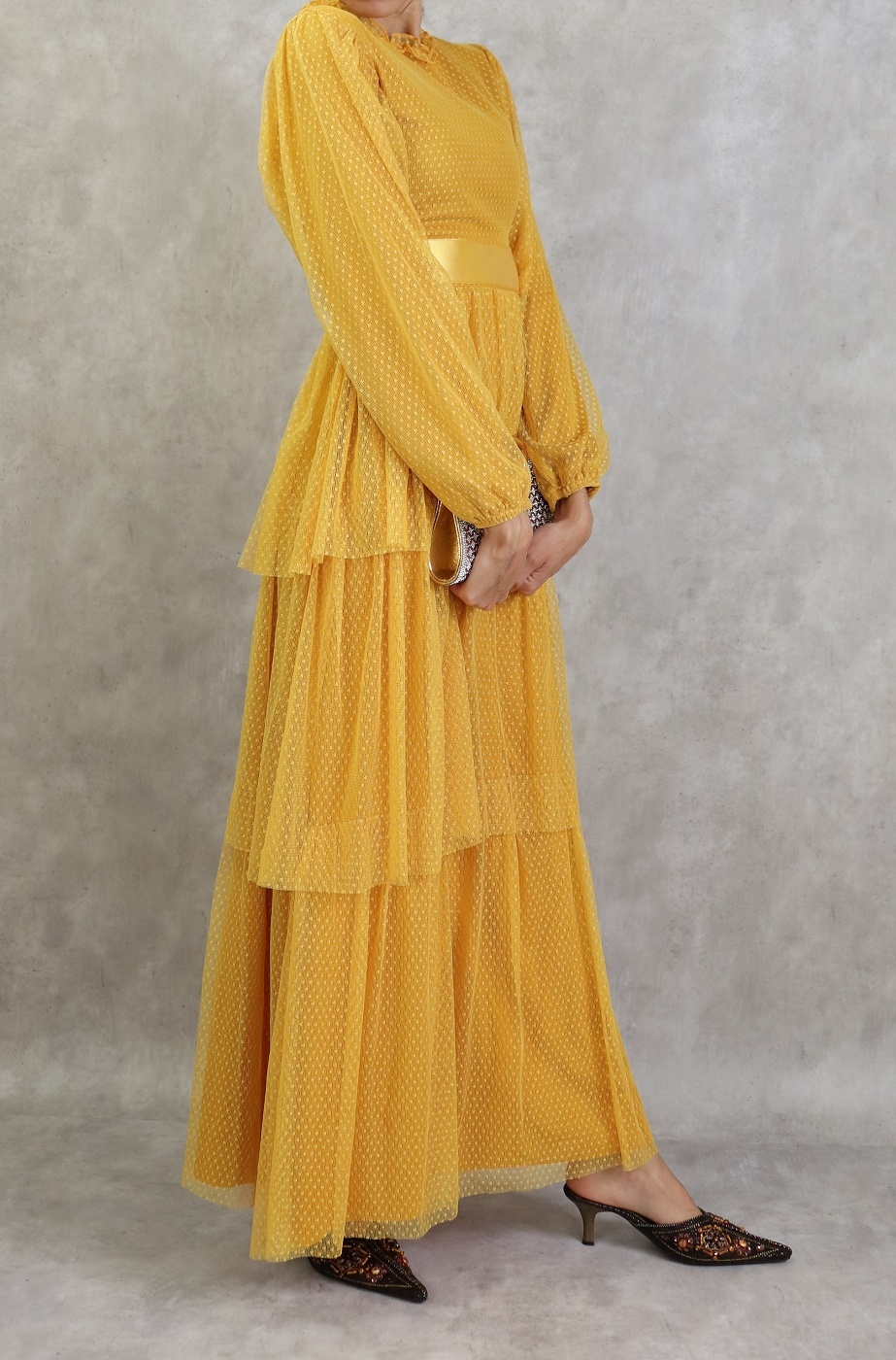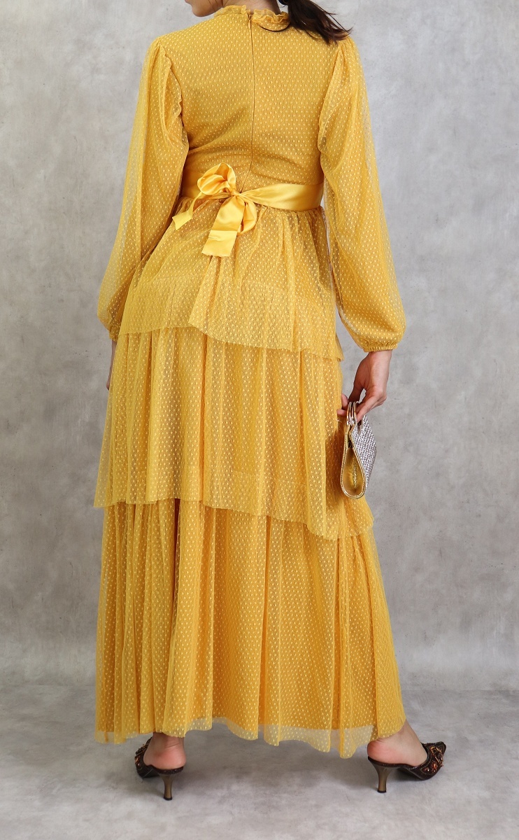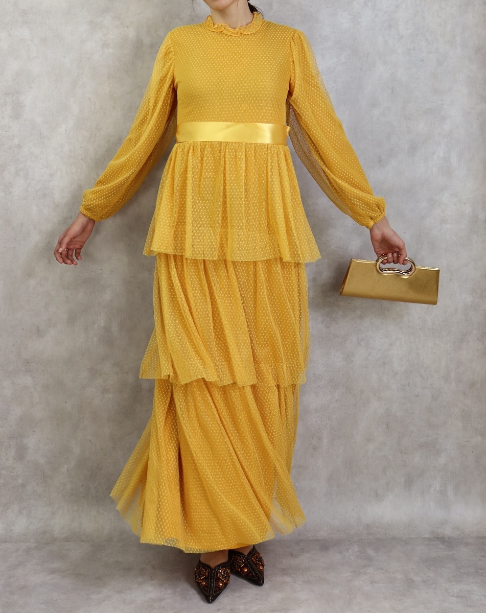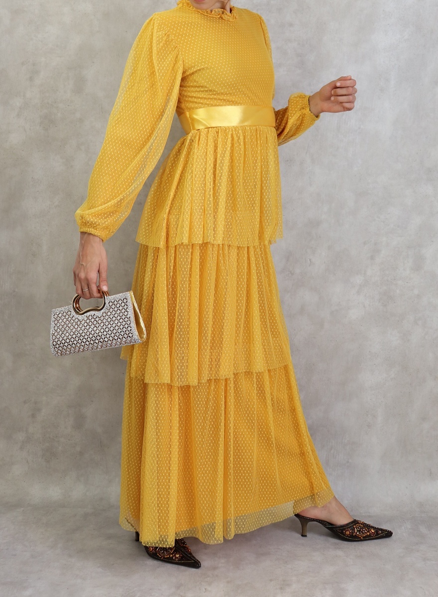 Robe longue en tulle à volants pour femme - Couleur jaune moutarde Vetement & Accessoire