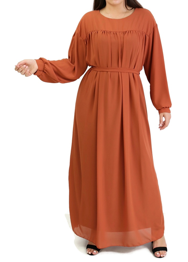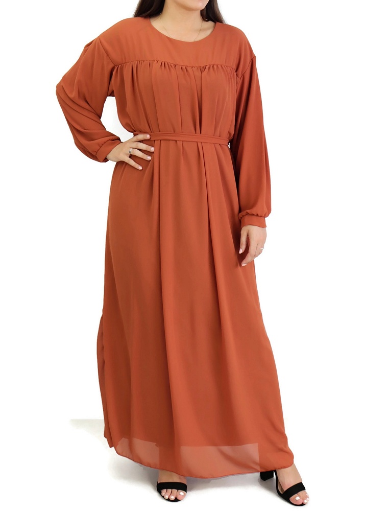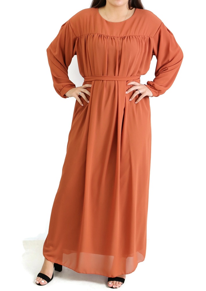 Coup de cœur pour cette robe longue et ample, entièrement doublée. Un vêtement simple qui peut se porter pour différentes occasions : au quotidien, mais aussi en soirée quand il est bien accessoirisé. Le haut est juste au corps, la taille est ample avec possibilité de la cintrer au moyen de la ceinture assortie fournie. Tissu de type crêpe. Ses manches sont longues et son col rond. On peut utiliser la ceinture par derrière ou ne pas la mettre.