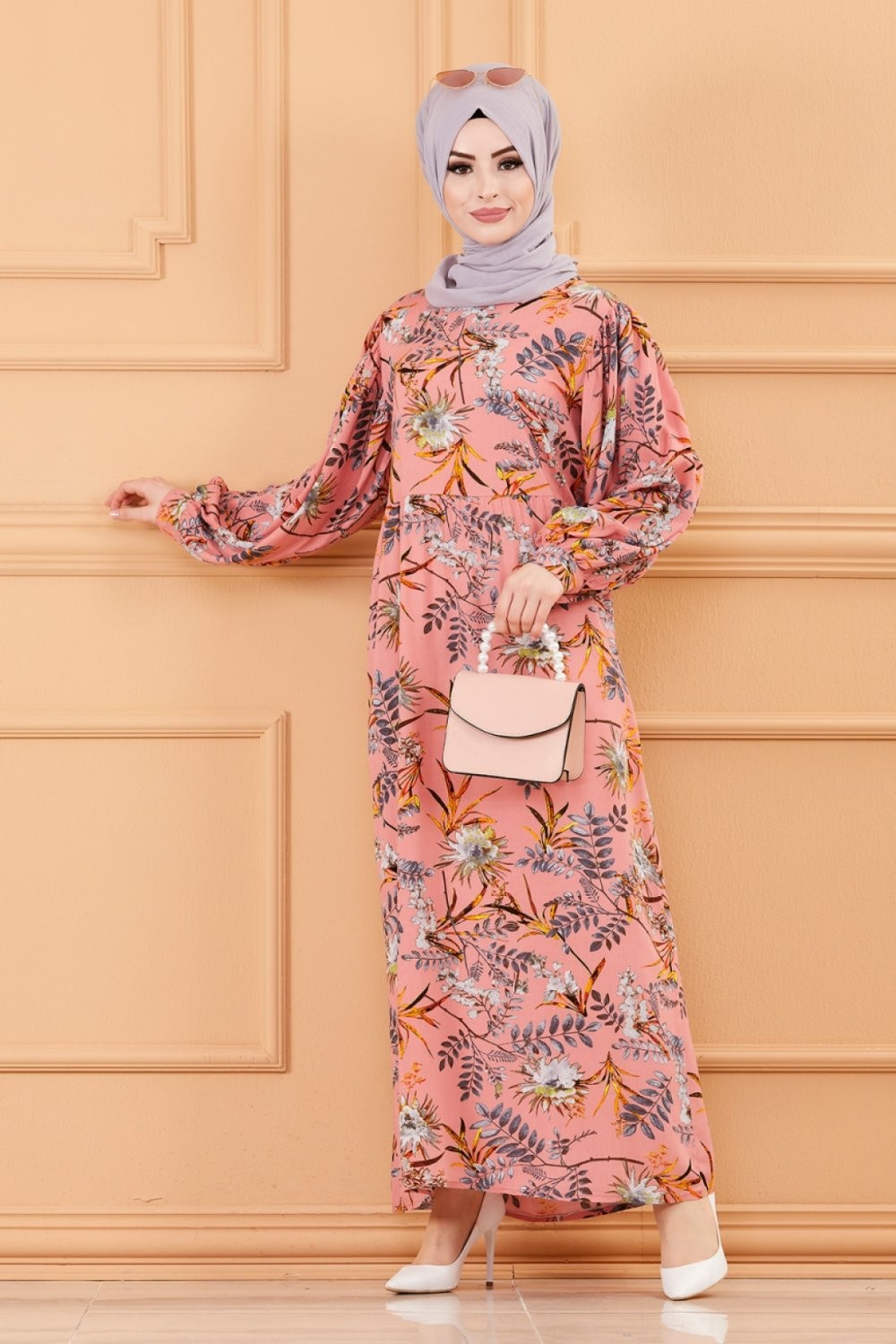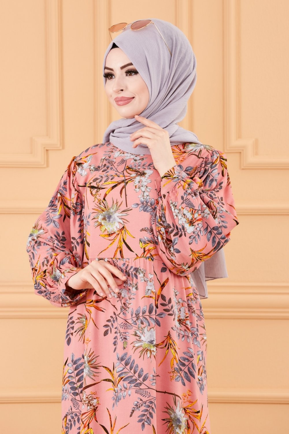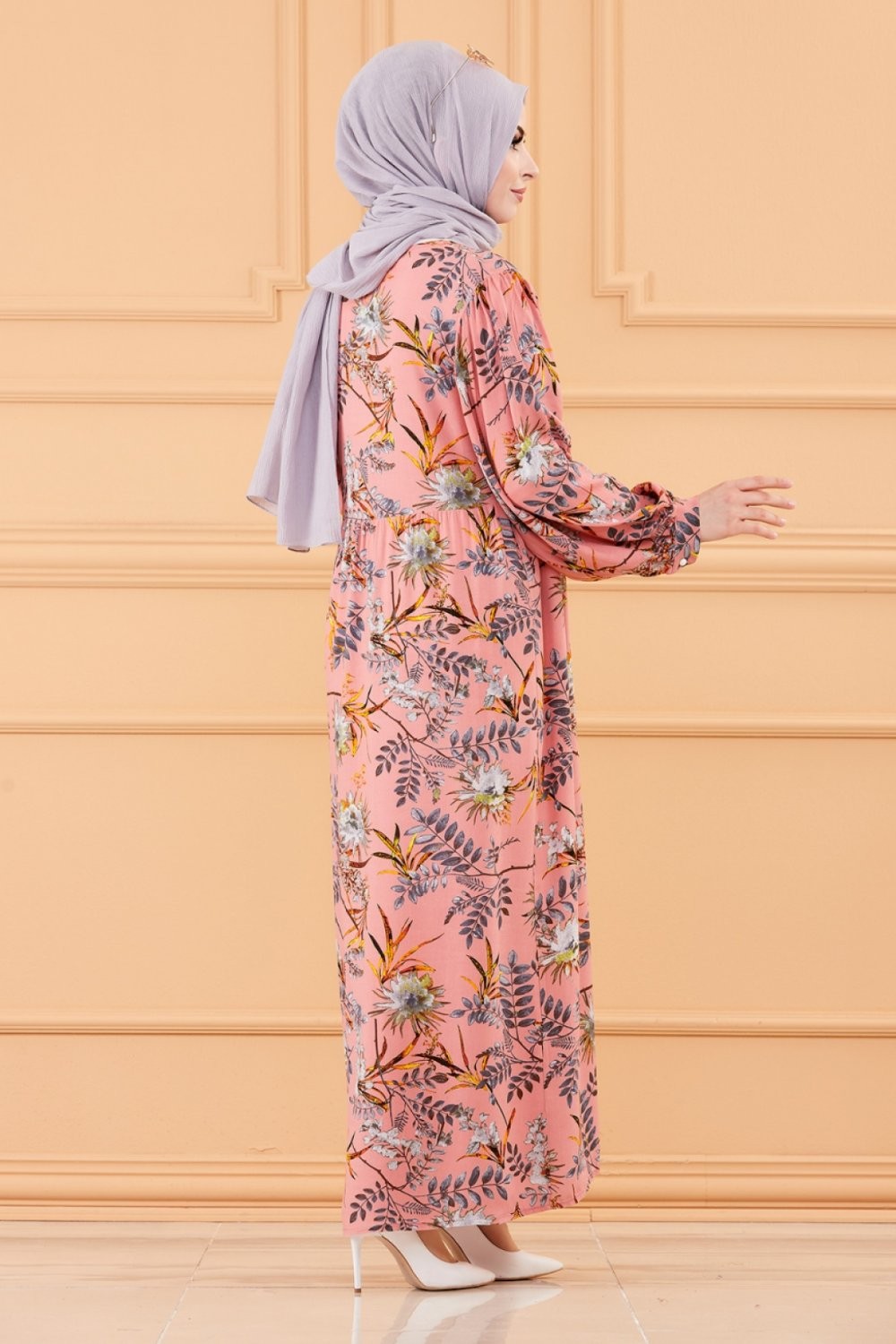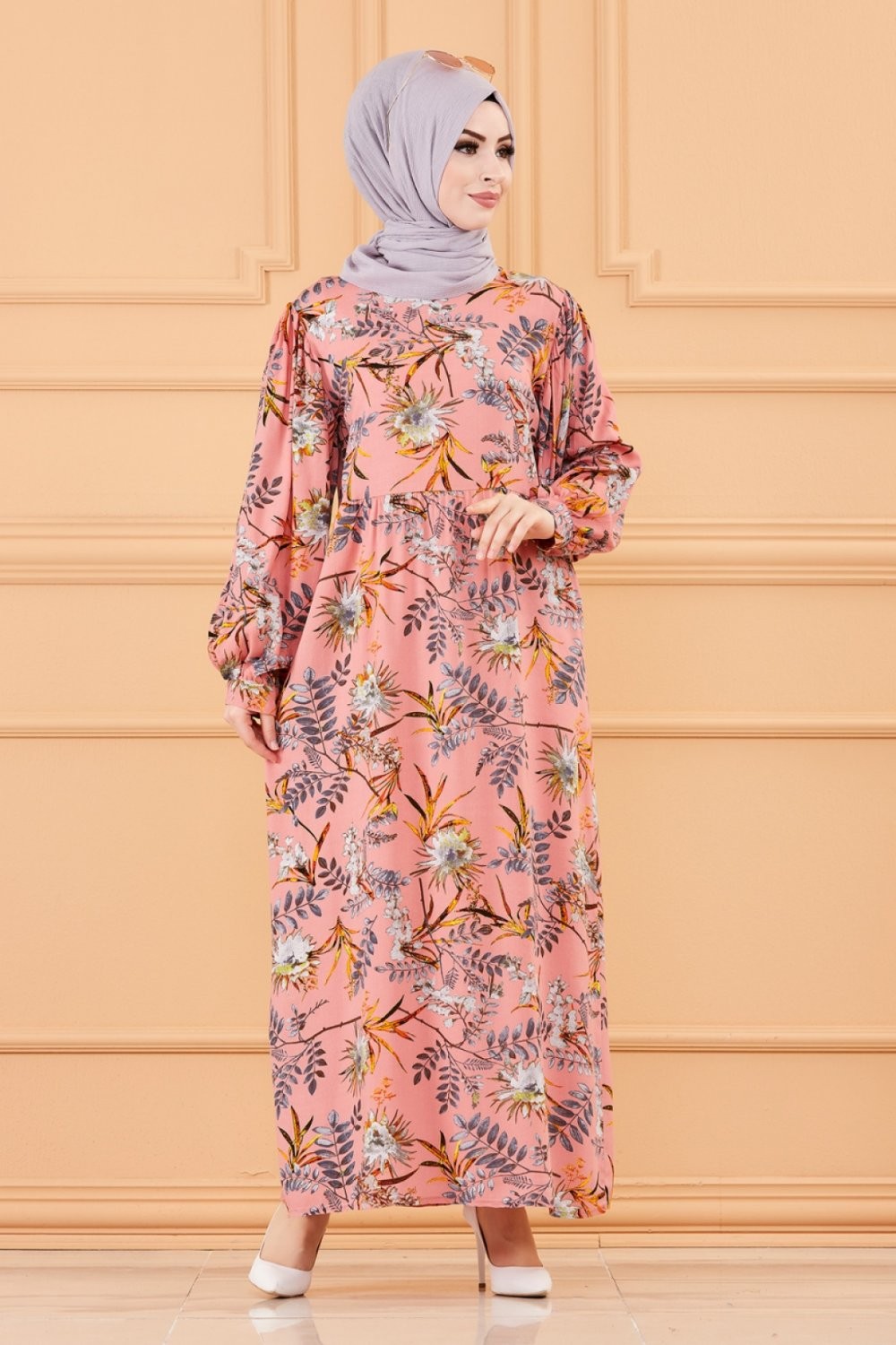 Robe longue et ample motif fleur pour femme (Tenue hijab) - Couleur rose