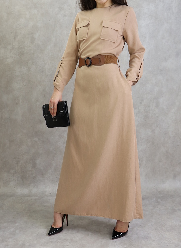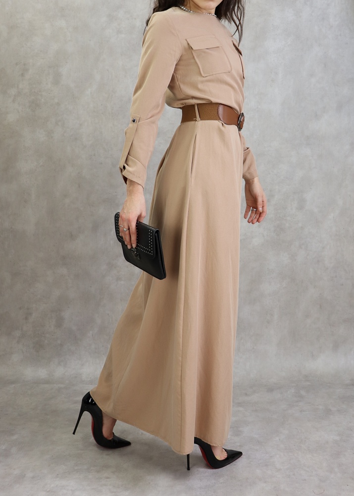 Robe longue, col rond, manches longues ajustables, deux poches plaquée au niveau de buste et poche latérale, fermeture éclair au dos, ceinture à passants, tissu léger non transparent, aussi douce que fluide.