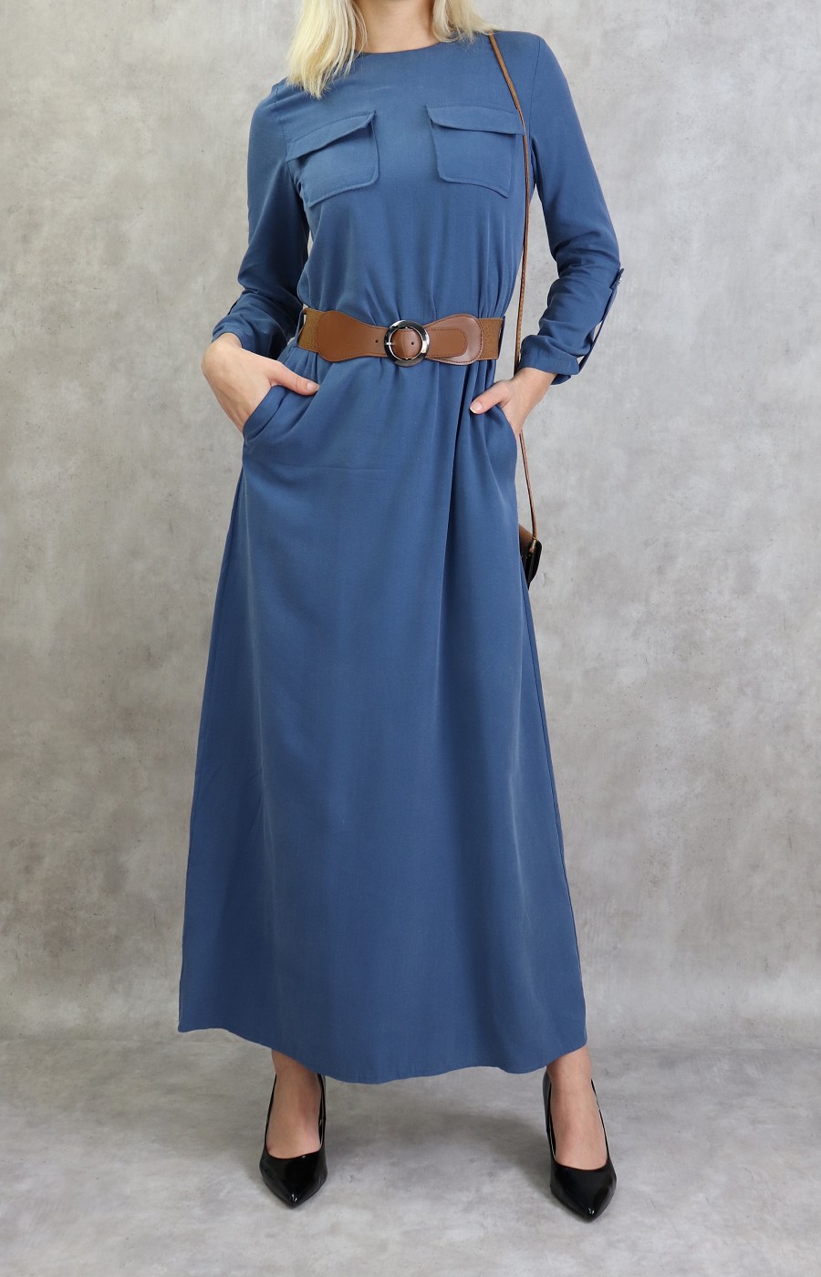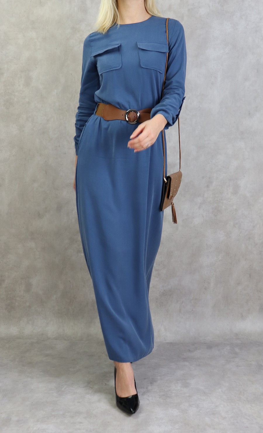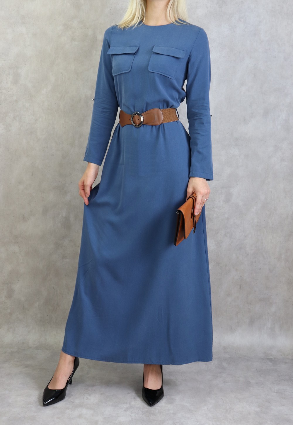 Robe longue evasee avec poches et ceinture marron - Couleur Bleu